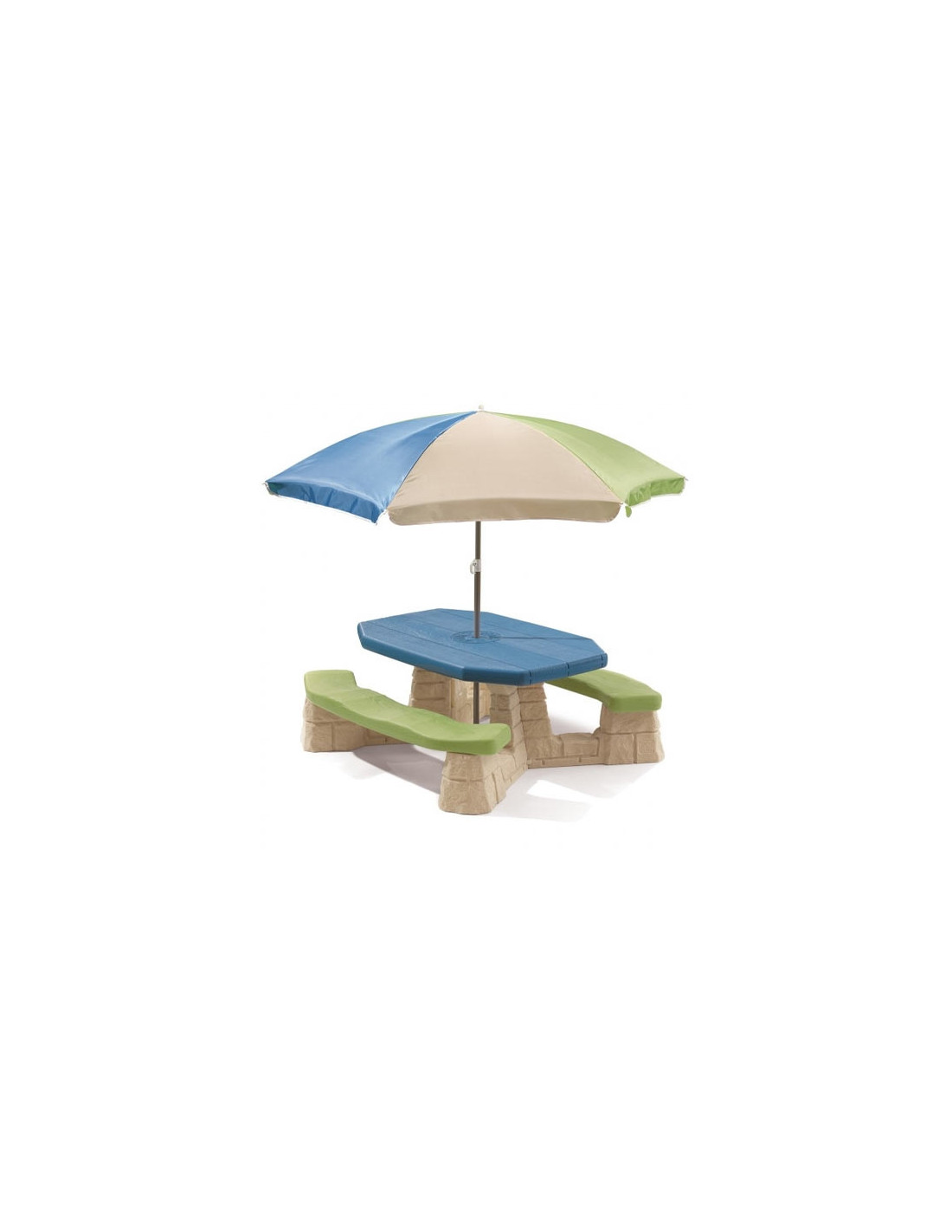 Stół piknikowy dla sześciorga dzieci z dwoma ławeczkami o specjalnym wyprofilowanym siedzisku. Wykonany z masywnego tworzywa sztucznego o podwójnych ściankach wypełnionych w środku powietrzem.Znaczna grubość elementów minimum 5 - 6 cm pozwala na długie użytkowanie stolika, a duży ponad 100 cm długości i szerokości 50 cm masywny blat oraz stabilna konstrukcja stołu zapewnia bezpieczeństwo zabawy. Dołączony parasol chroni przed promieniowaniem UV. Wysokość od ziemi do blatu stolika minimum 50 cm pozwala na korzystanie ze stolika dzieciom o różnym wzroście.