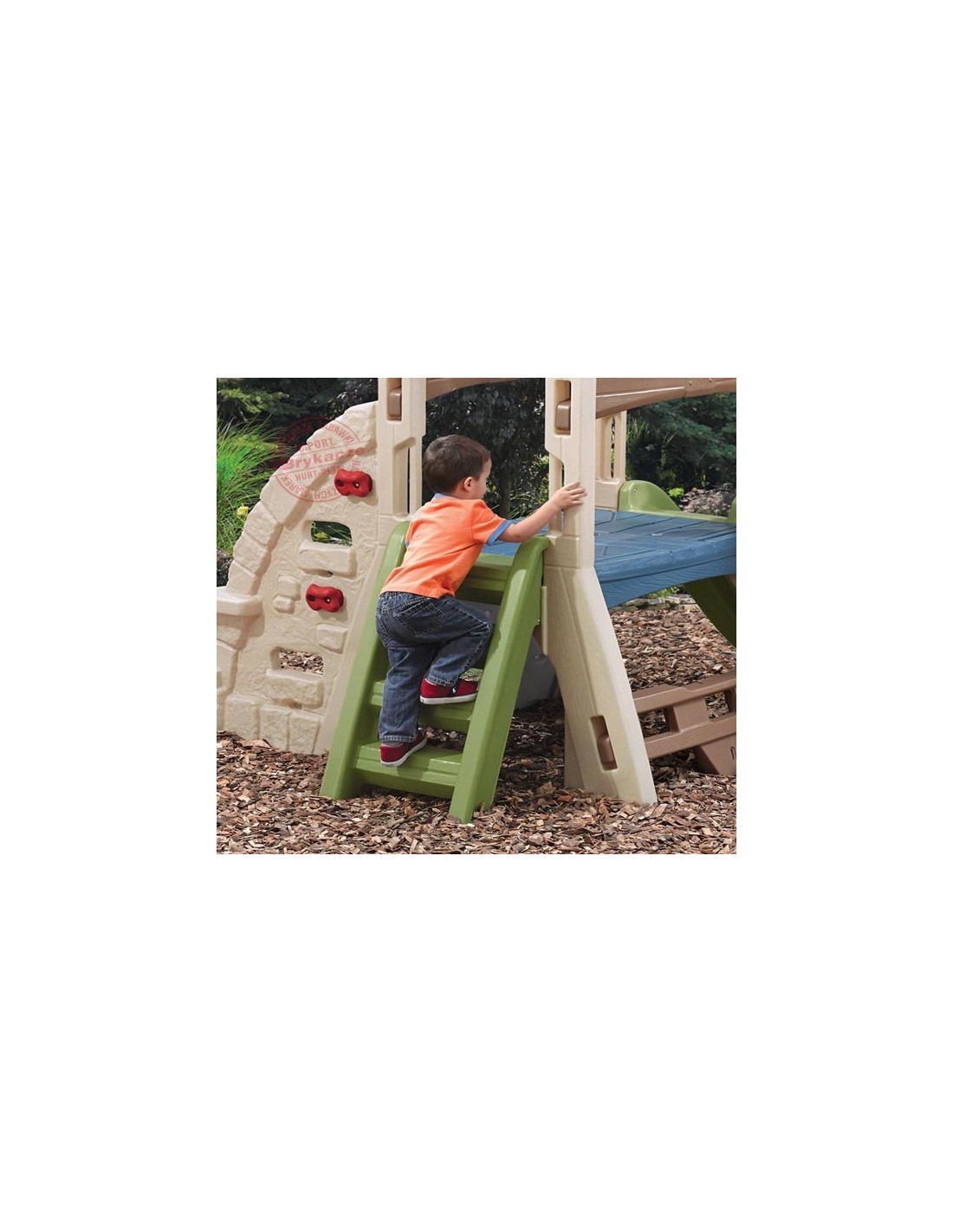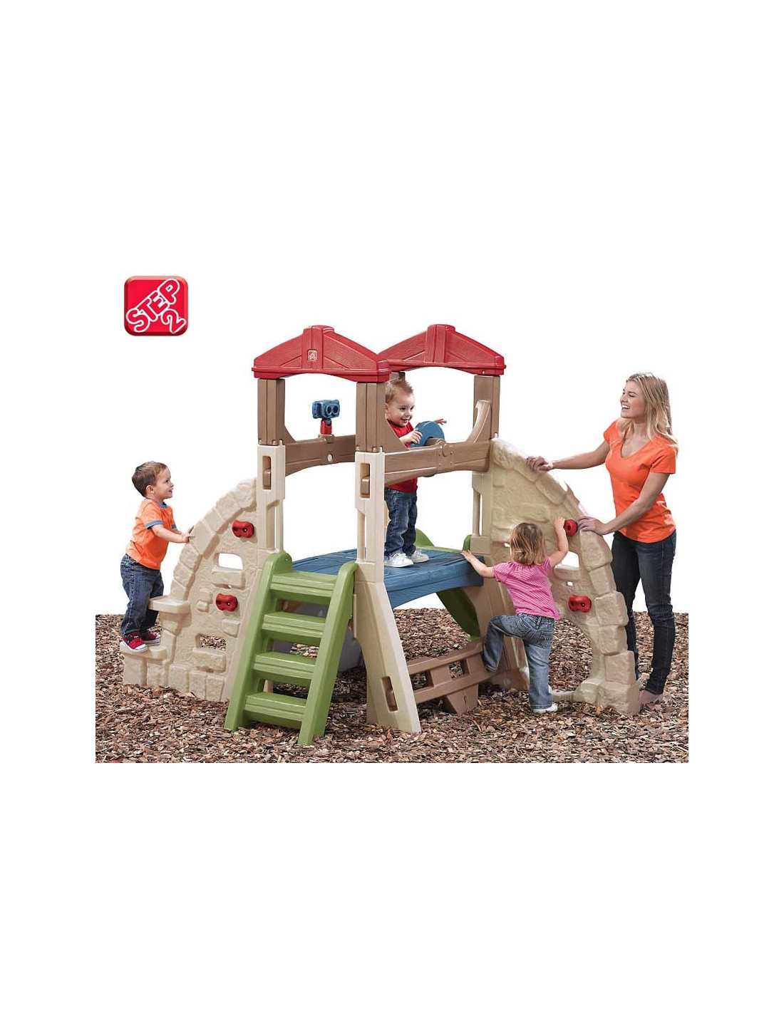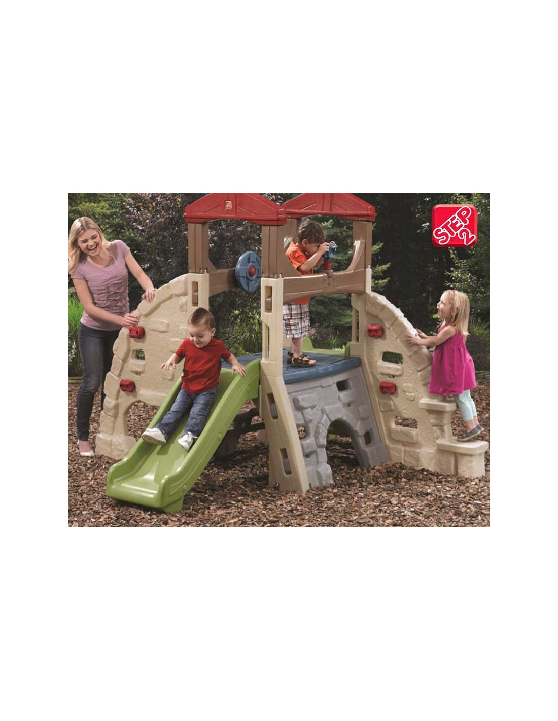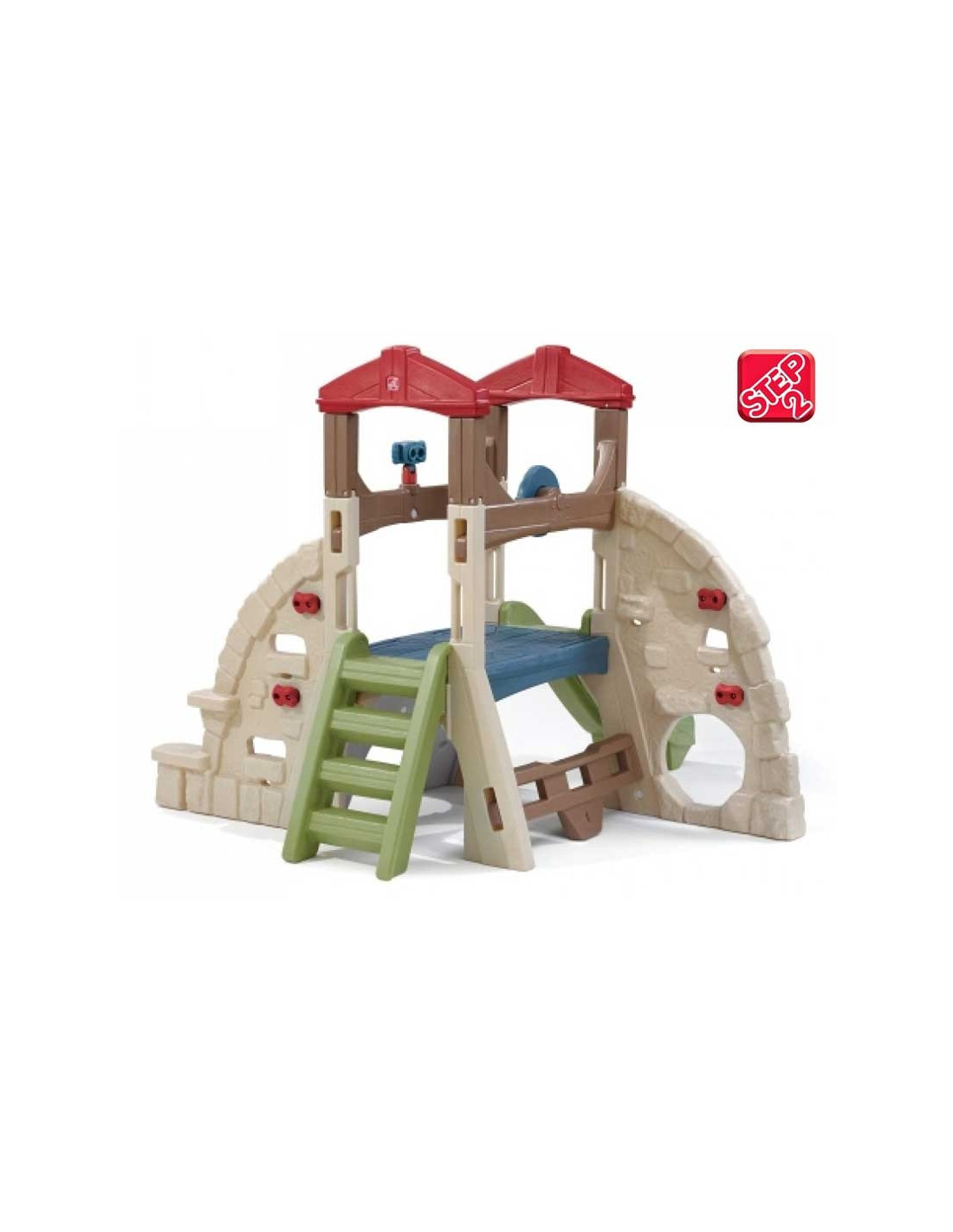 The Step2 monkey bar playground is made of solid plastic imitating stone. It features five climbing walls of varying difficulty levels . The walls feature handles, openings, and steps. It's the perfect solution for a preschool playground. Perfect for both older children and toddlers!