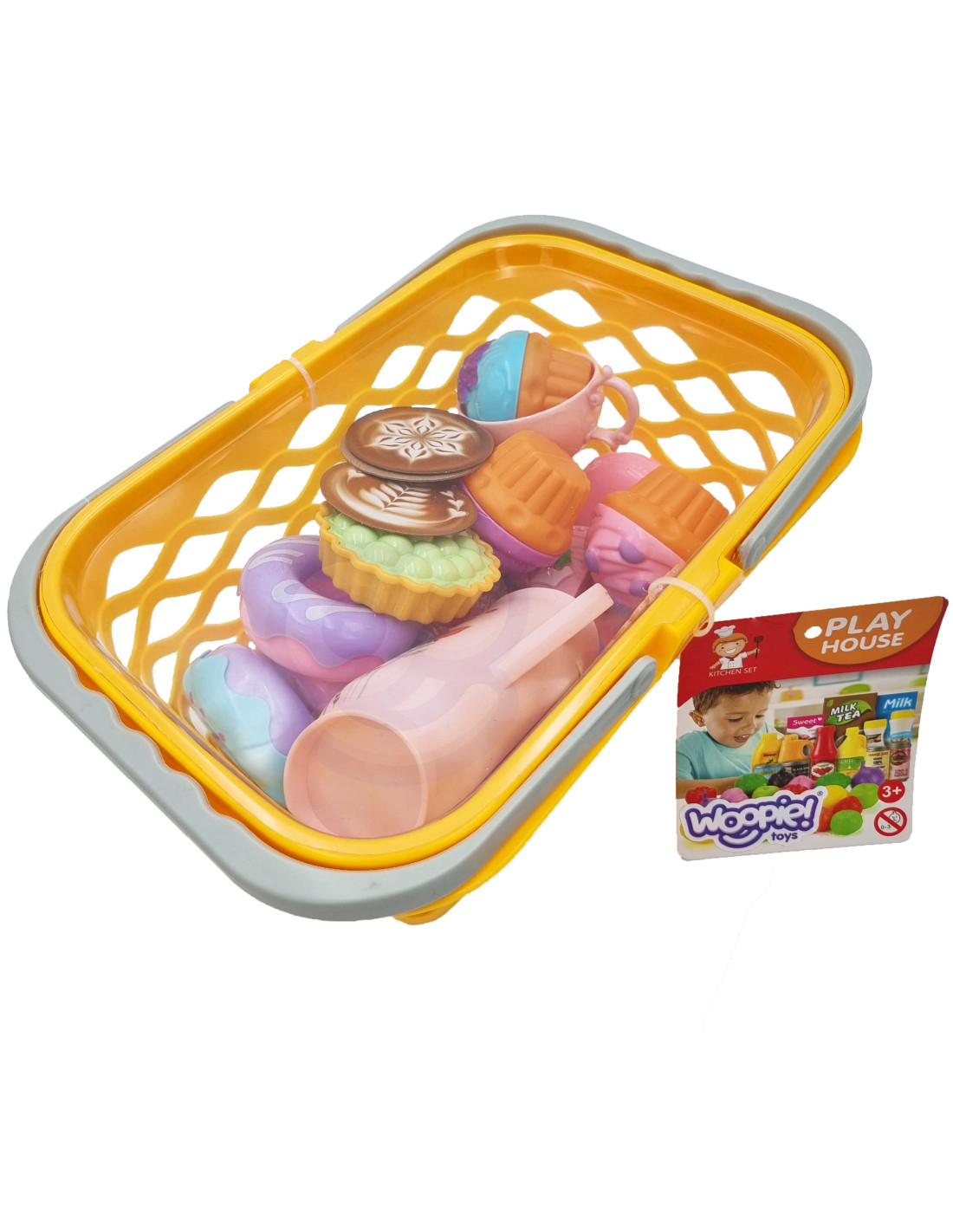 This large shopping basket from WOOPIE is the perfect addition to supermarkets. Children can pretend to be parents shopping or go for a tea or coffee date with friends. The basket has a comfortable handle and is filled with plenty of sweets . In addition to the tea set/service , it also includes coffee and sweets such as cakes, cookies, donuts, macaroons, and muffins. There are 26 items in total! Role- playing positively develops children's imagination , creativity , and awareness of everyday life.