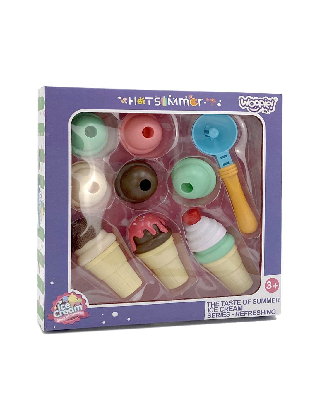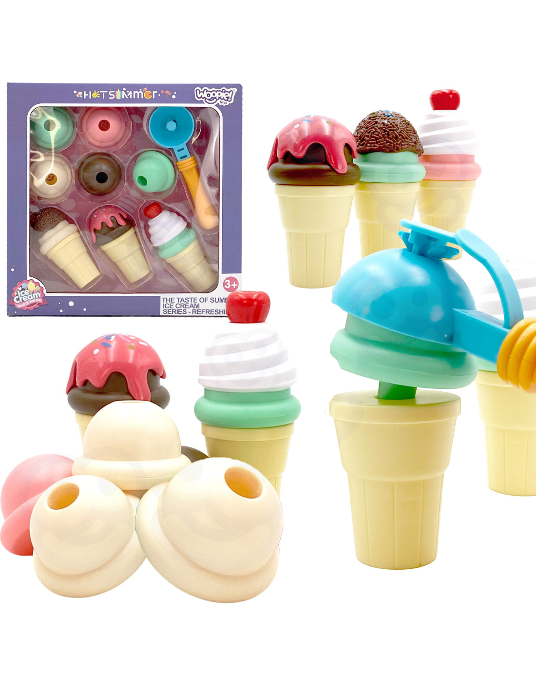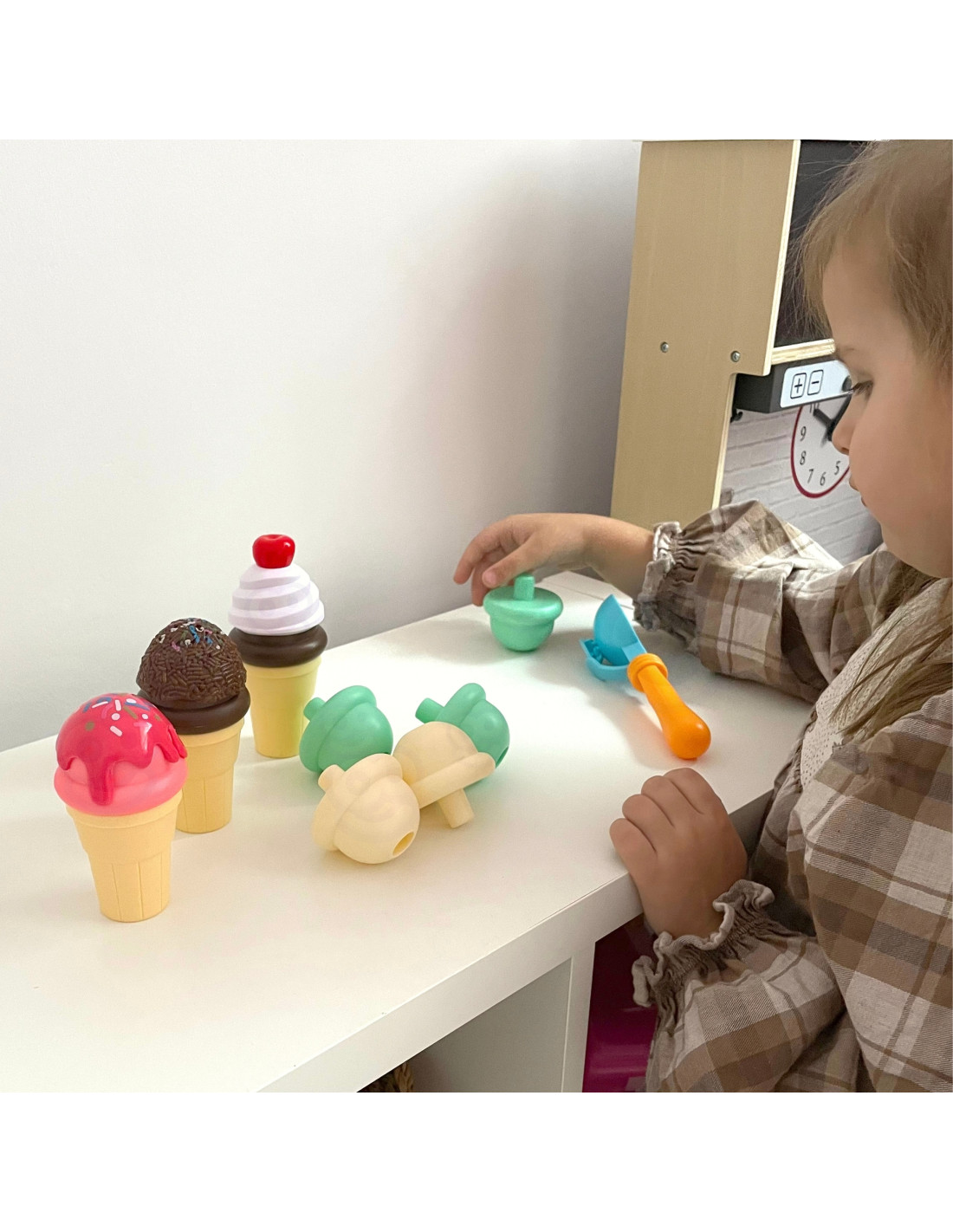 The WOOPIE Ice Cream Maker Set will let your child feel like a real pastry chef. The set includes wafers, balls, a scooper, and extra toppings. Children take a wafer, place a scoop of their choice on the spoon , and arrange it however they like. This simple game will develop your child's imagination and creativity . Children can take on the roles of pastry chef and customer with friends or family.