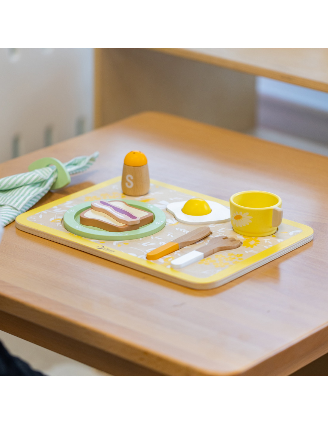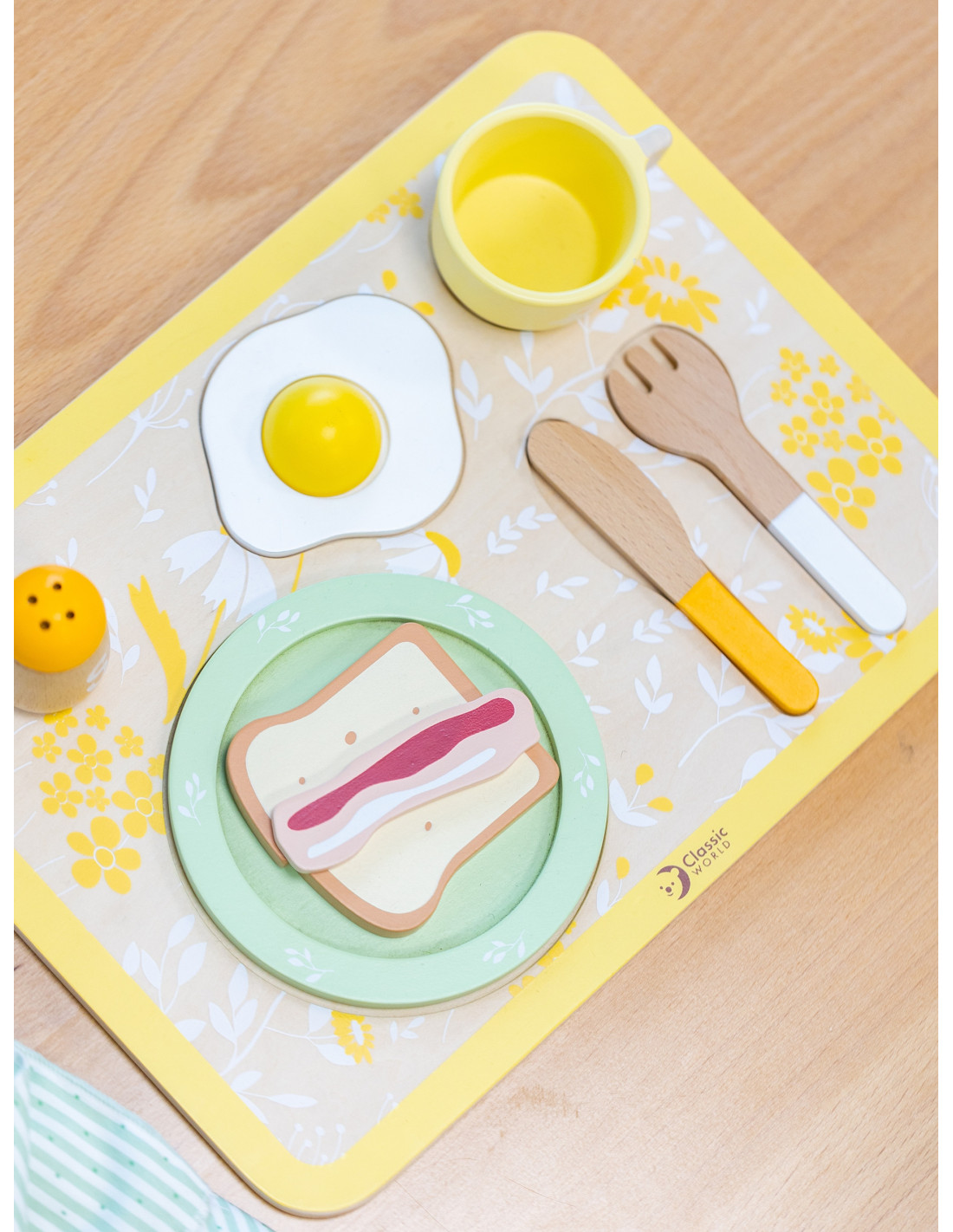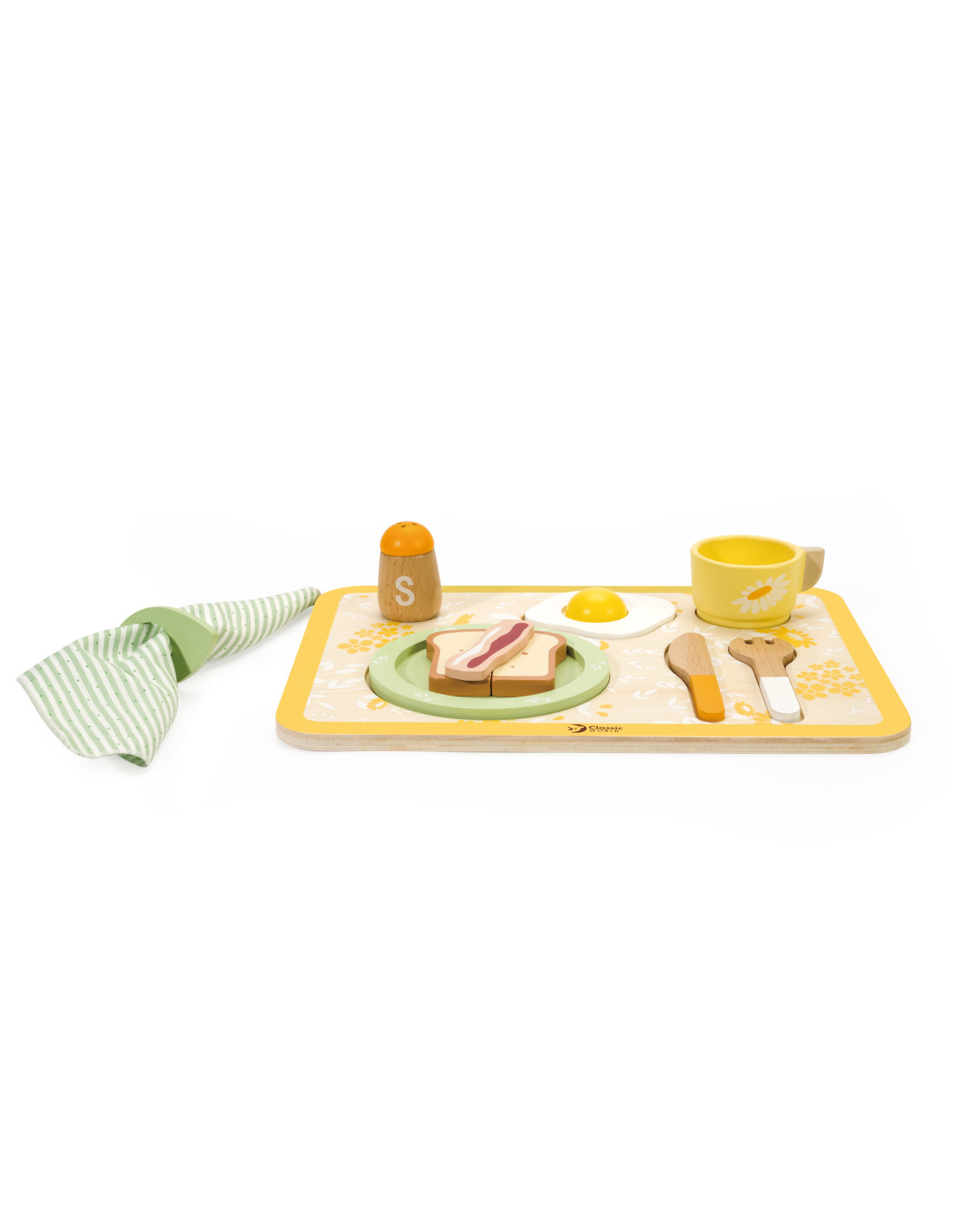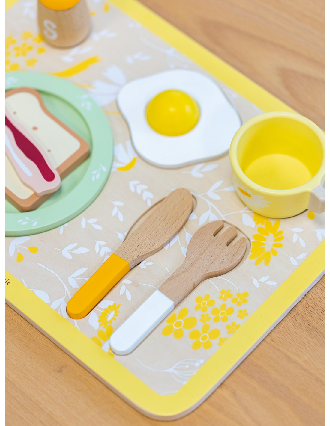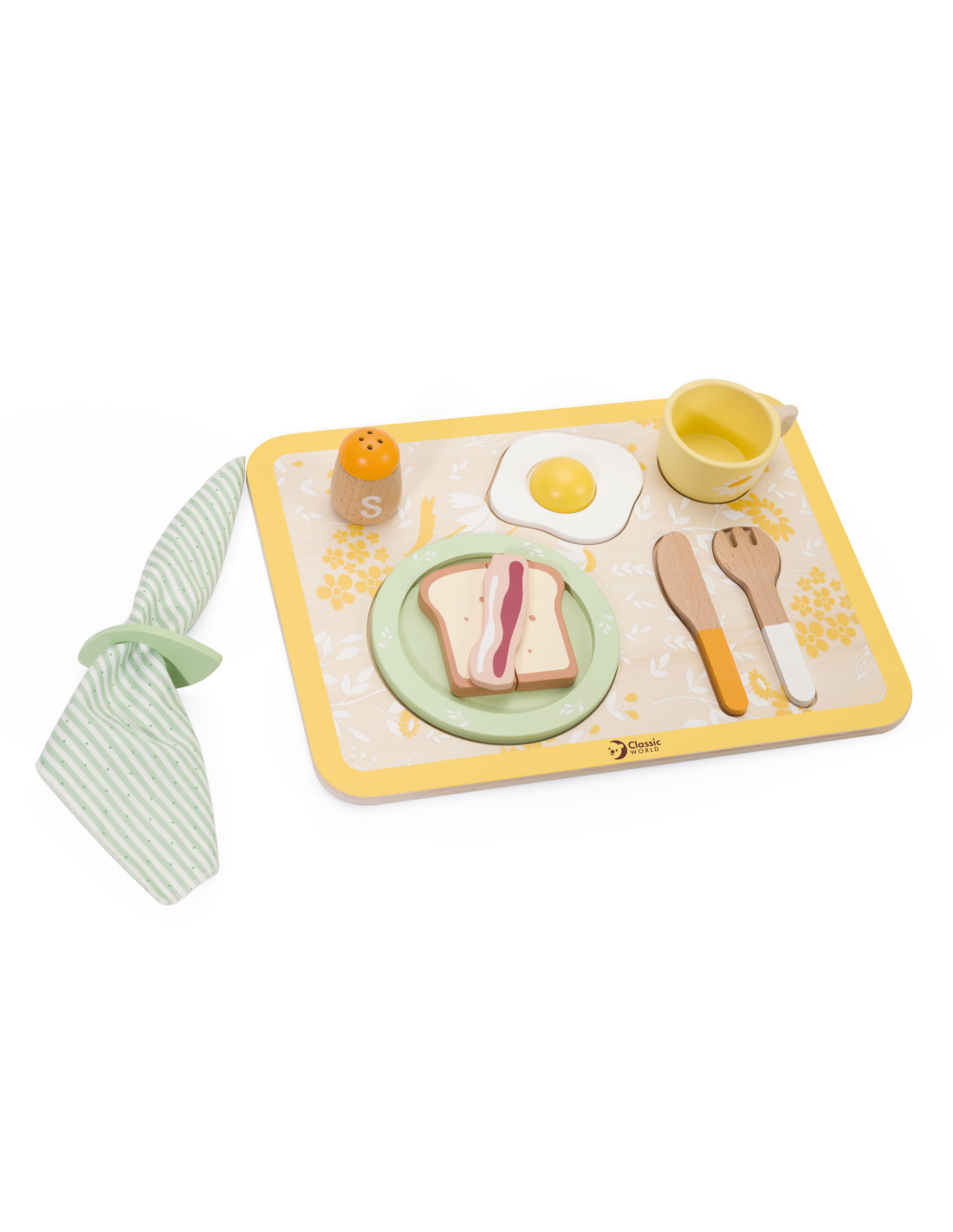 - - the set includes a plate, cutlery, a cup, salt, pepper, an egg, toast, a slice of bacon, a napkin and a serving tray,