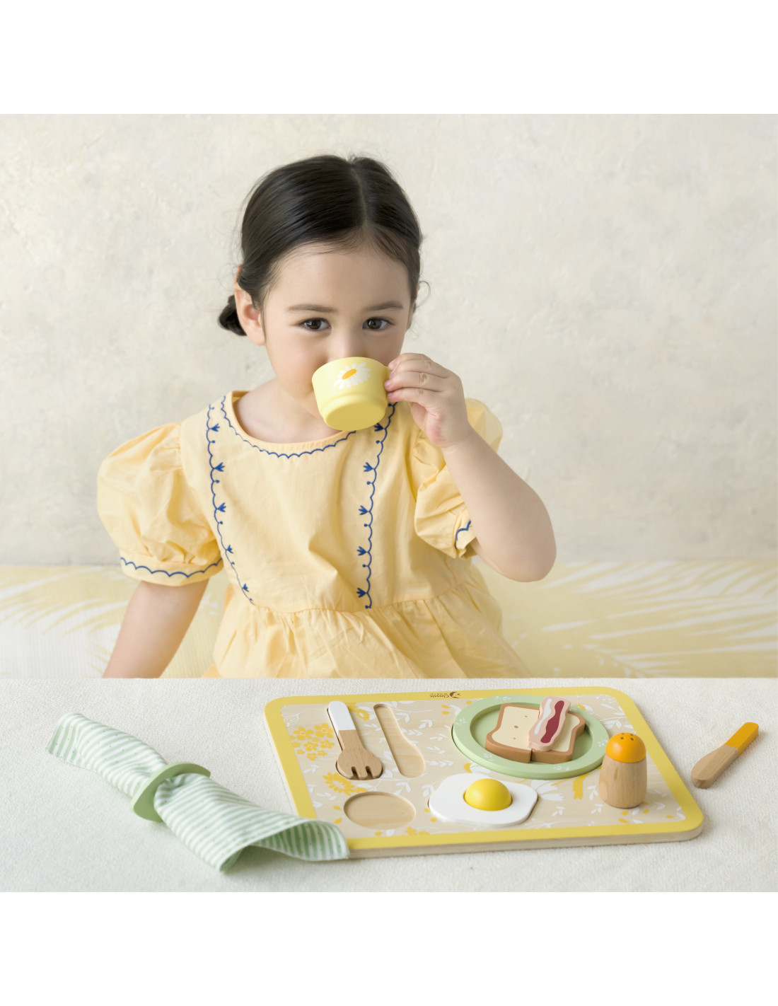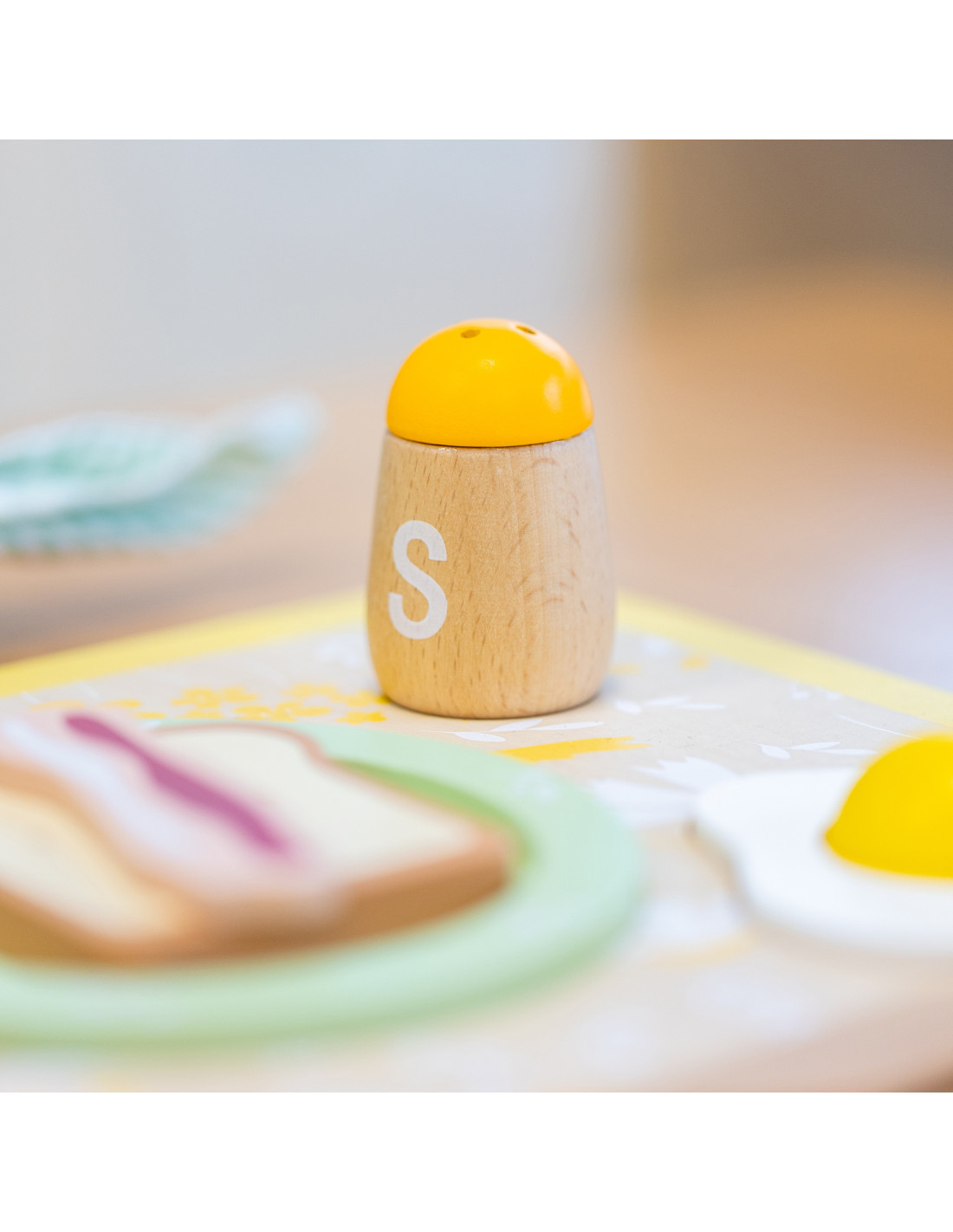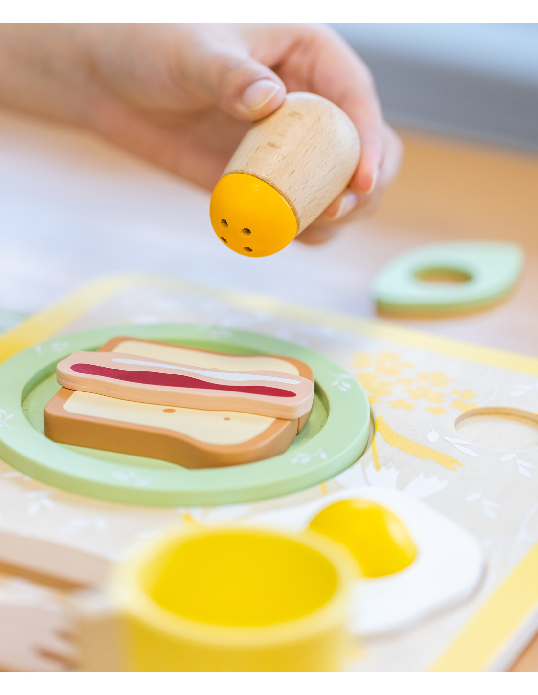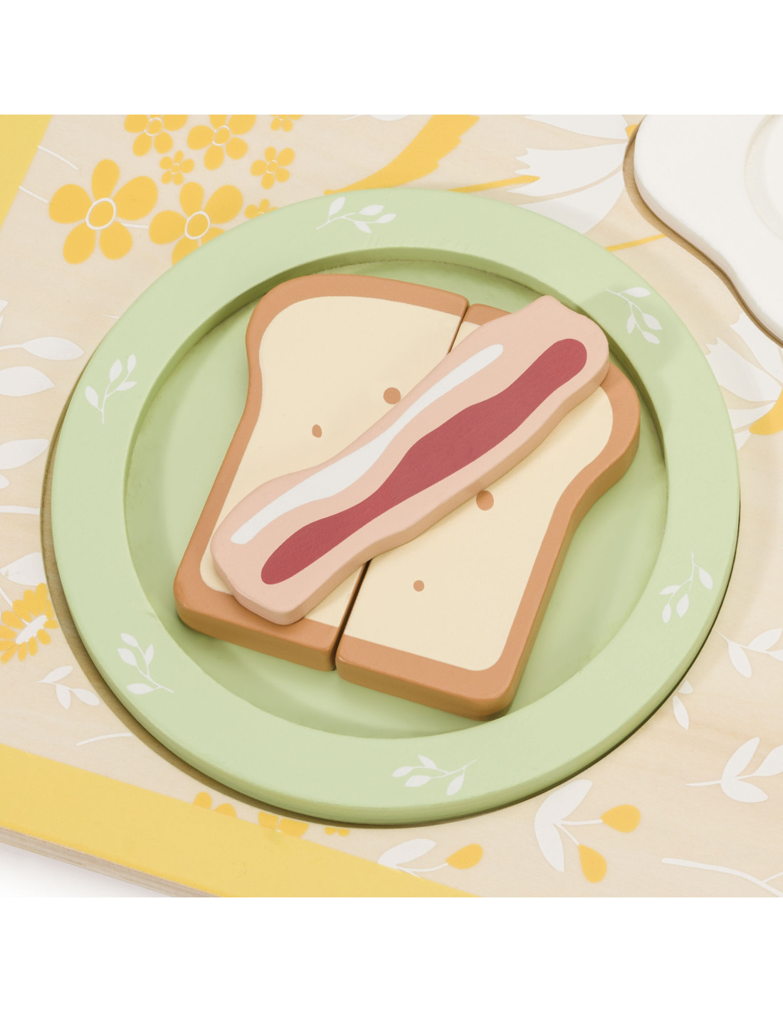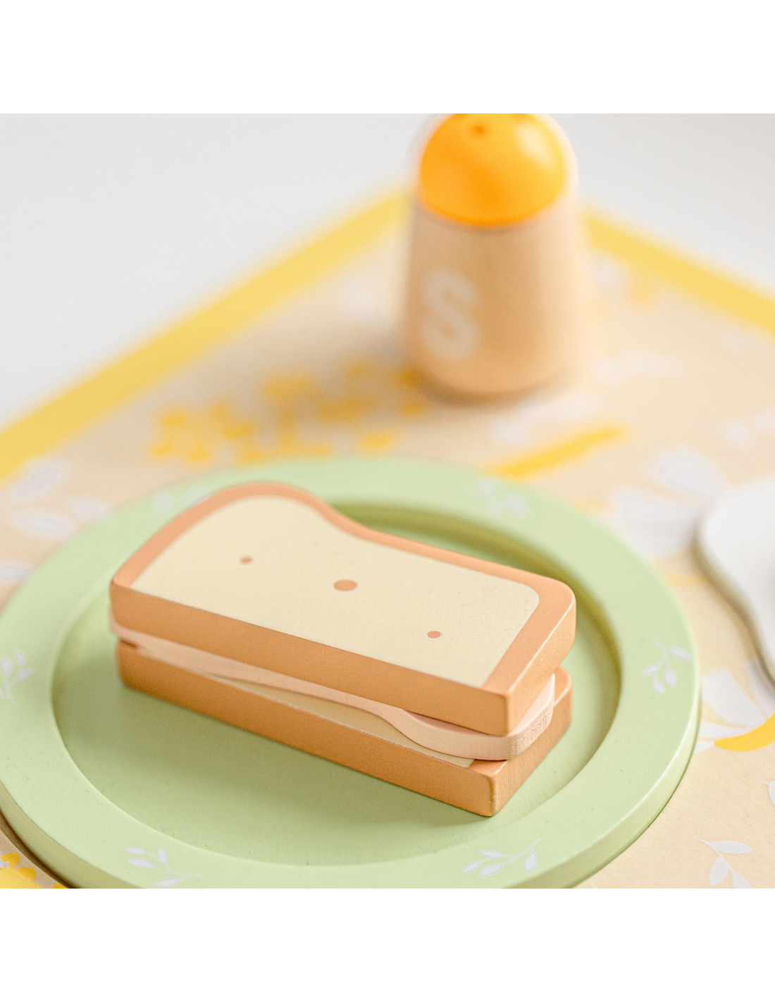 - - the set includes a plate, cutlery, a cup, salt, pepper, an egg, toast, a slice of bacon, a napkin and a serving tray,