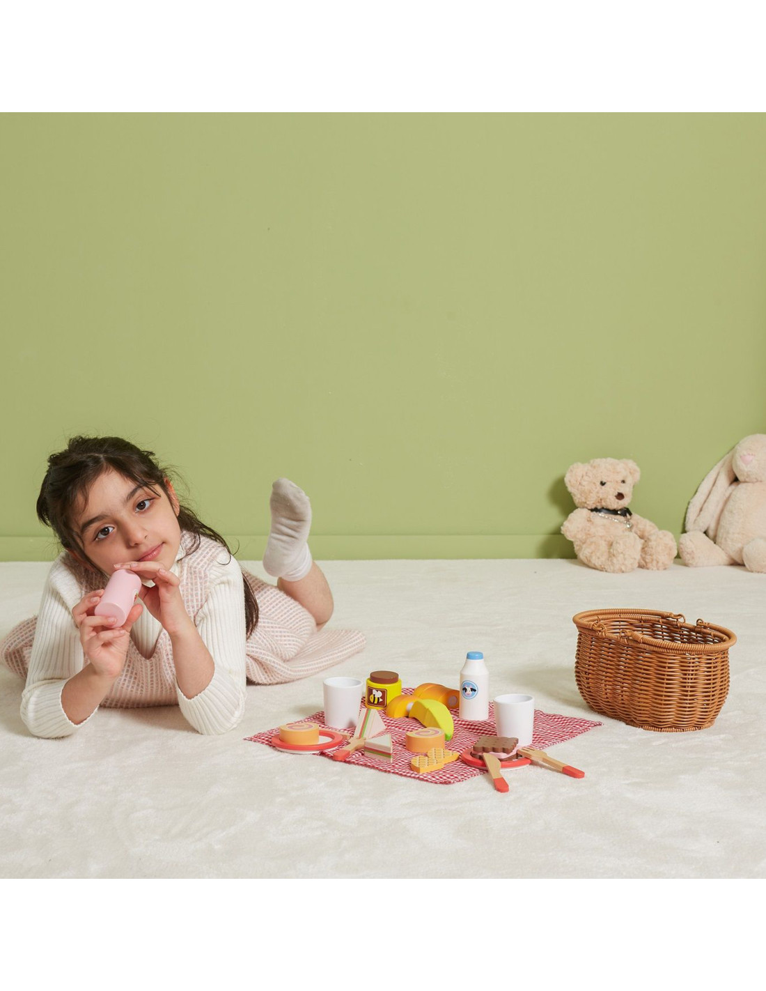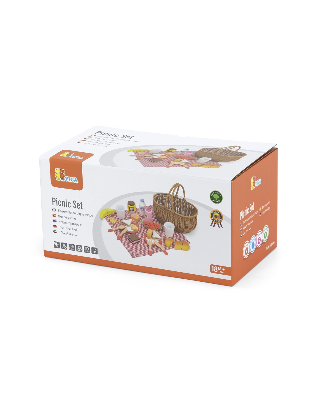 Go on a fun picnic with friends with the Wooden Picnic Set from VIGA . This beautiful basket made of artificial reed is filled with a selection of wooden accessories and a checkered fabric. Thanks to the sturdy handles, your child can easily take the entire set with them wherever they go . The included wooden snacks and accessories allow them to take their favorite toys, stuffed animals, or role-play with a friend. This set is suitable for both outdoor and indoor play. Some dishes consist of several pieces and are attached with Velcro. Using a wooden knife, your child can cut them into pieces, developing fine motor skills . Imitating adults will also contribute to the development of social skills .