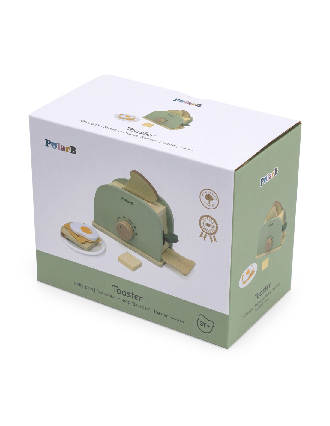 A stylish, wooden , green toaster from the PolarB series for creative cooking fun. It develops cognitive and manual skills, creativity, imagination, and a fascination with the world of food preparation. A wonderful addition to a child's kitchen. Turn the knob and then pull the lever. The finished toast will pop out just like real toast! Turning the knob produces realistic sounds. This beautifully crafted, safe toy is a beautifully crafted, safe toy.
