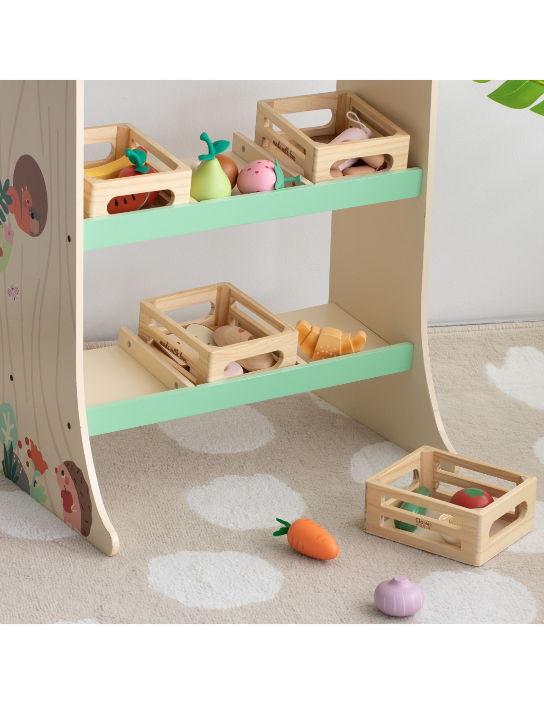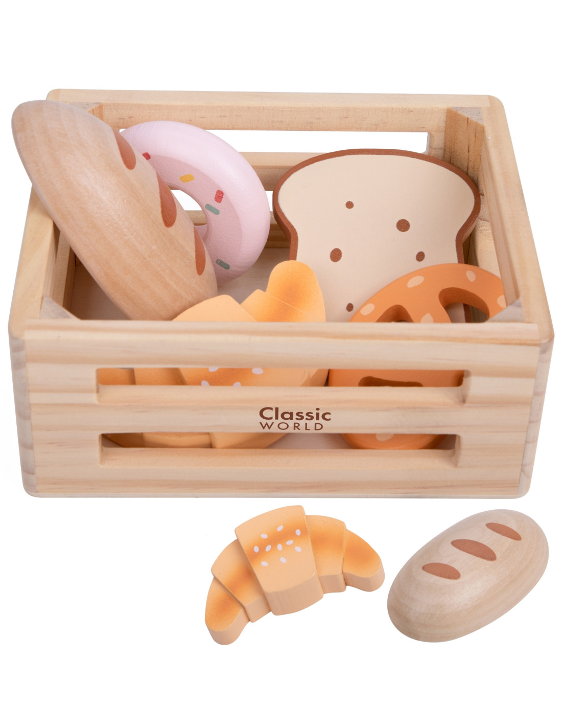 The Classic World Baked Goods Basket is a set for children who love creative play in the kitchen, shop, or bakery. Wooden elements representing different types of bread allow for open-ended role-play, developing imagination and social skills. Each element is made of high-quality wood. The set is perfect for both independent play and collaborative creations with peers or adults.