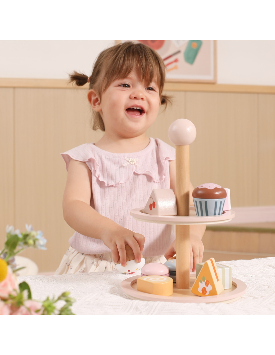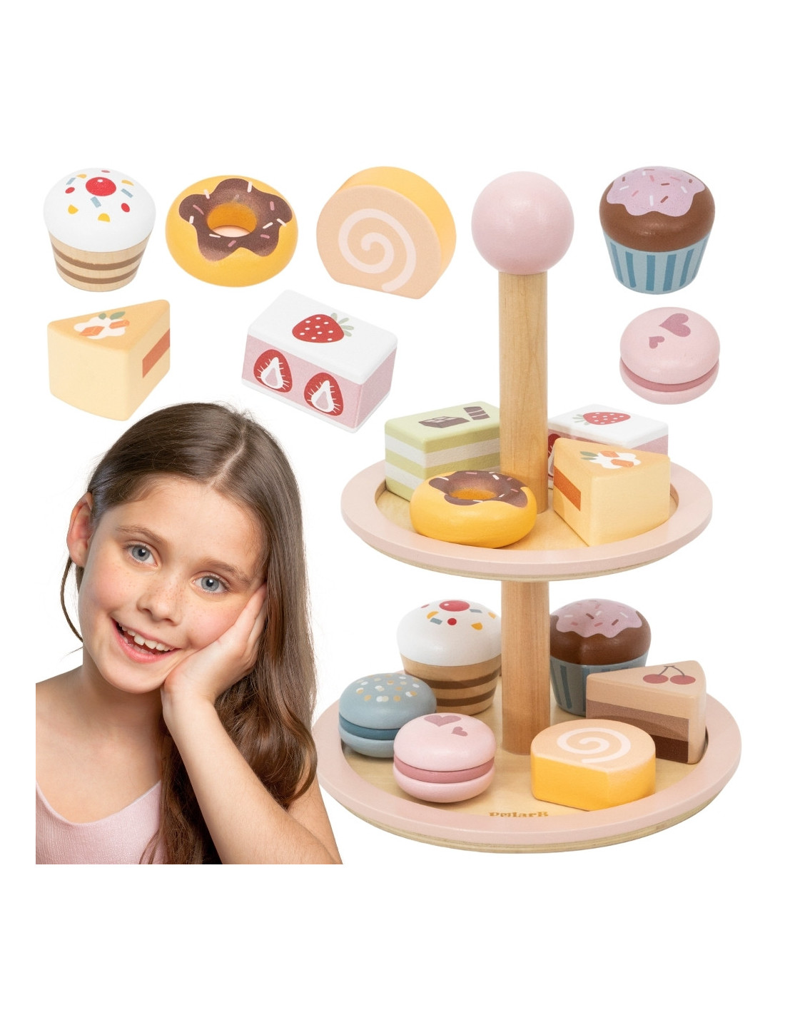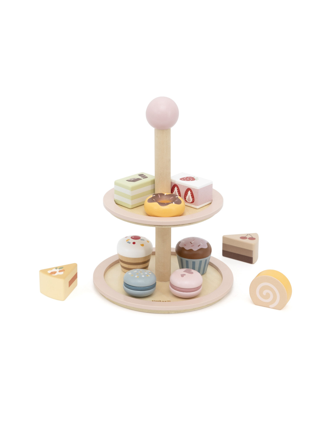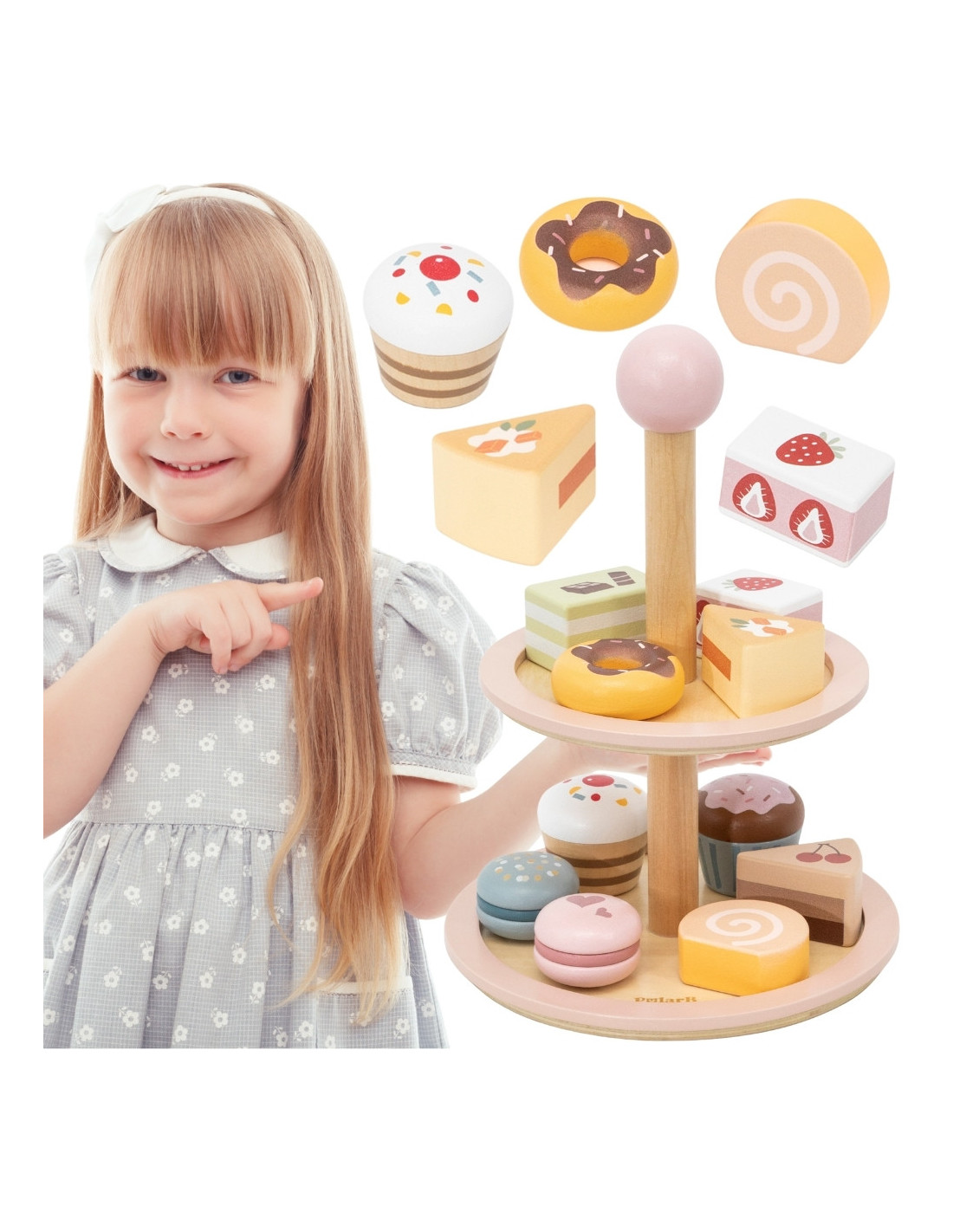 Invite your child into the world of café fun! The Viga PolarB wooden cake stand is an elegant, two-tiered cake stand filled with colorful sweets that will brighten up any afternoon tea party. The set includes 10 charming cookies and cakes, made from safe, non-toxic materials. Smooth edges and the perfect size make it easy for little hands to grasp. It's not only great fun but also a way to develop a child's imagination, creativity, and social skills.