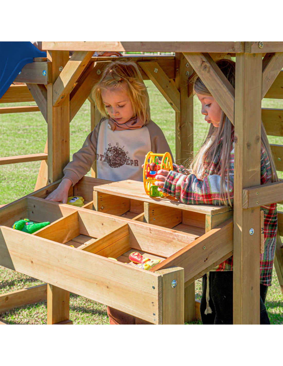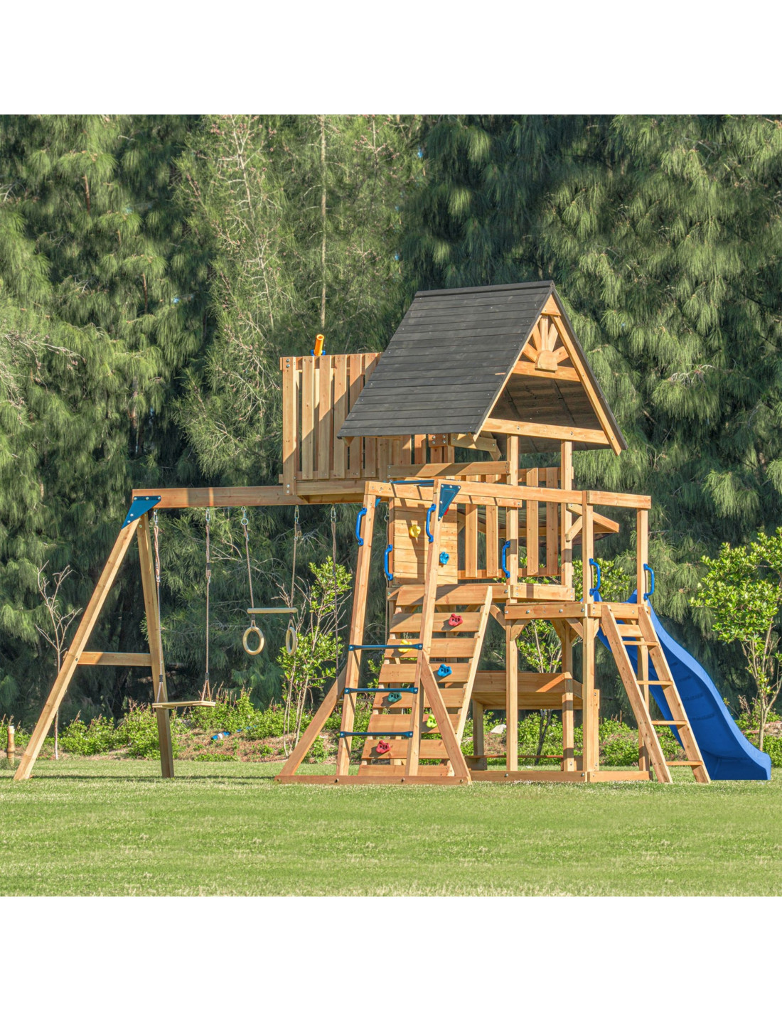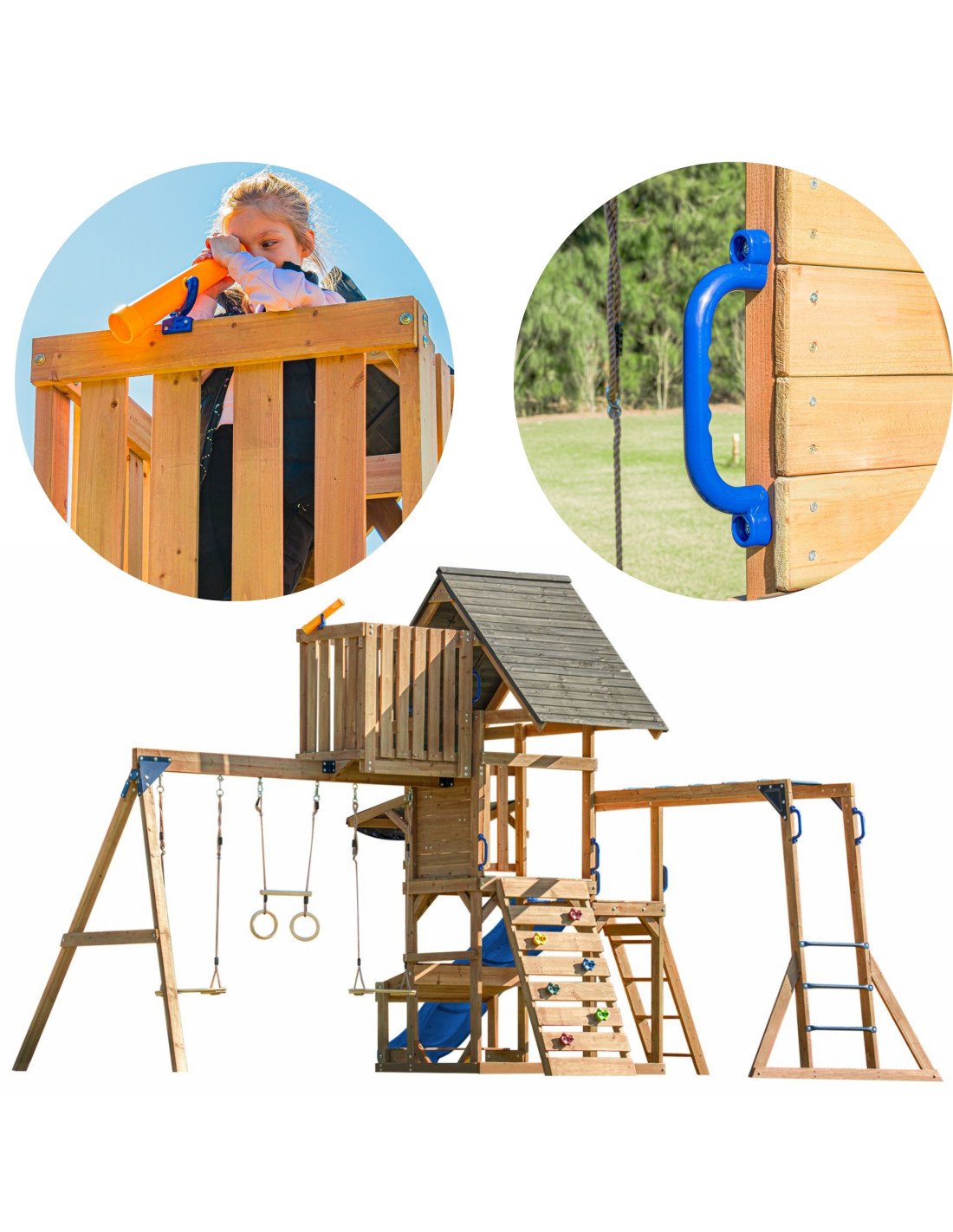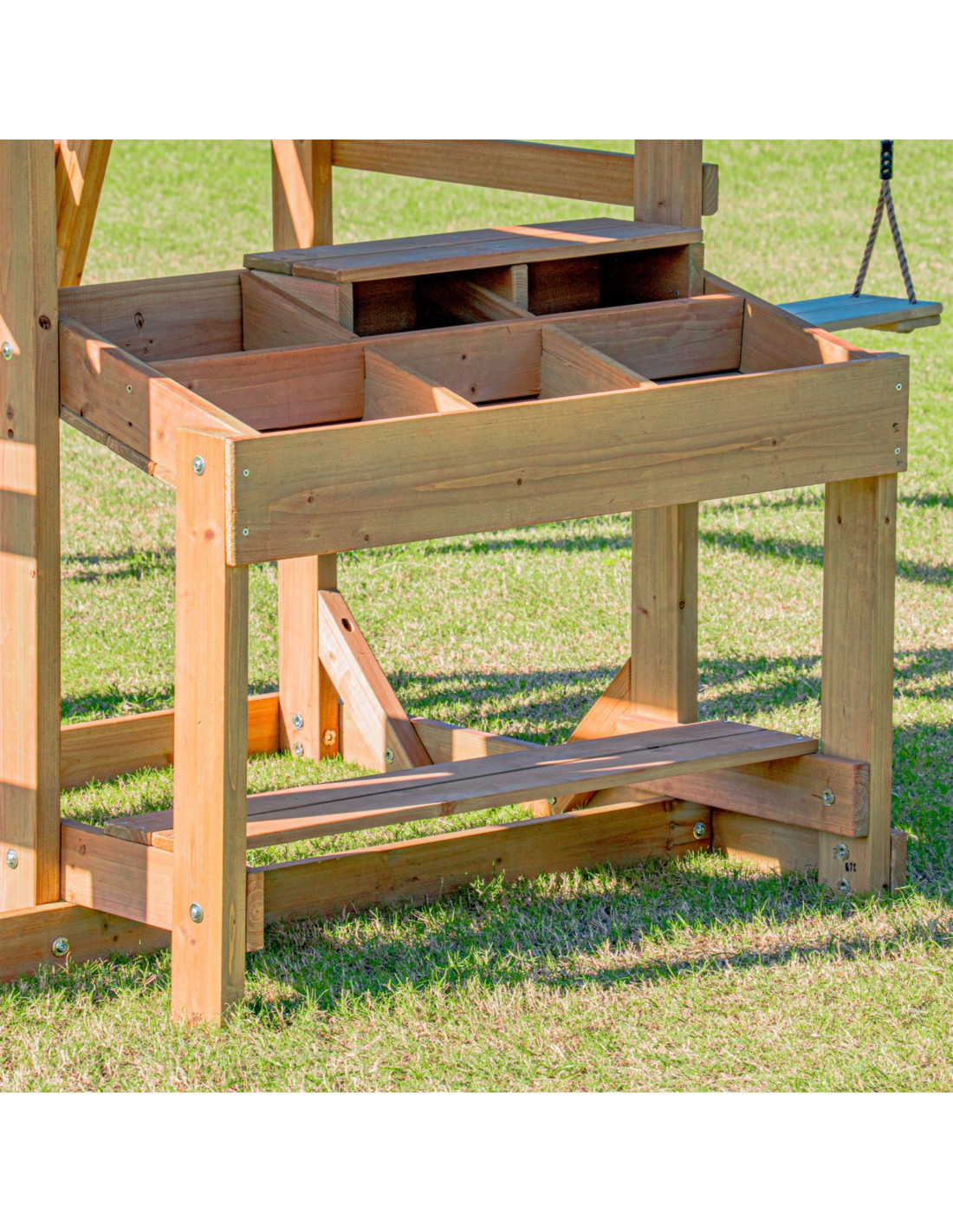 ✔ A multifunctional play set that combines a swing, slide, observation tower, trapeze and sandbox