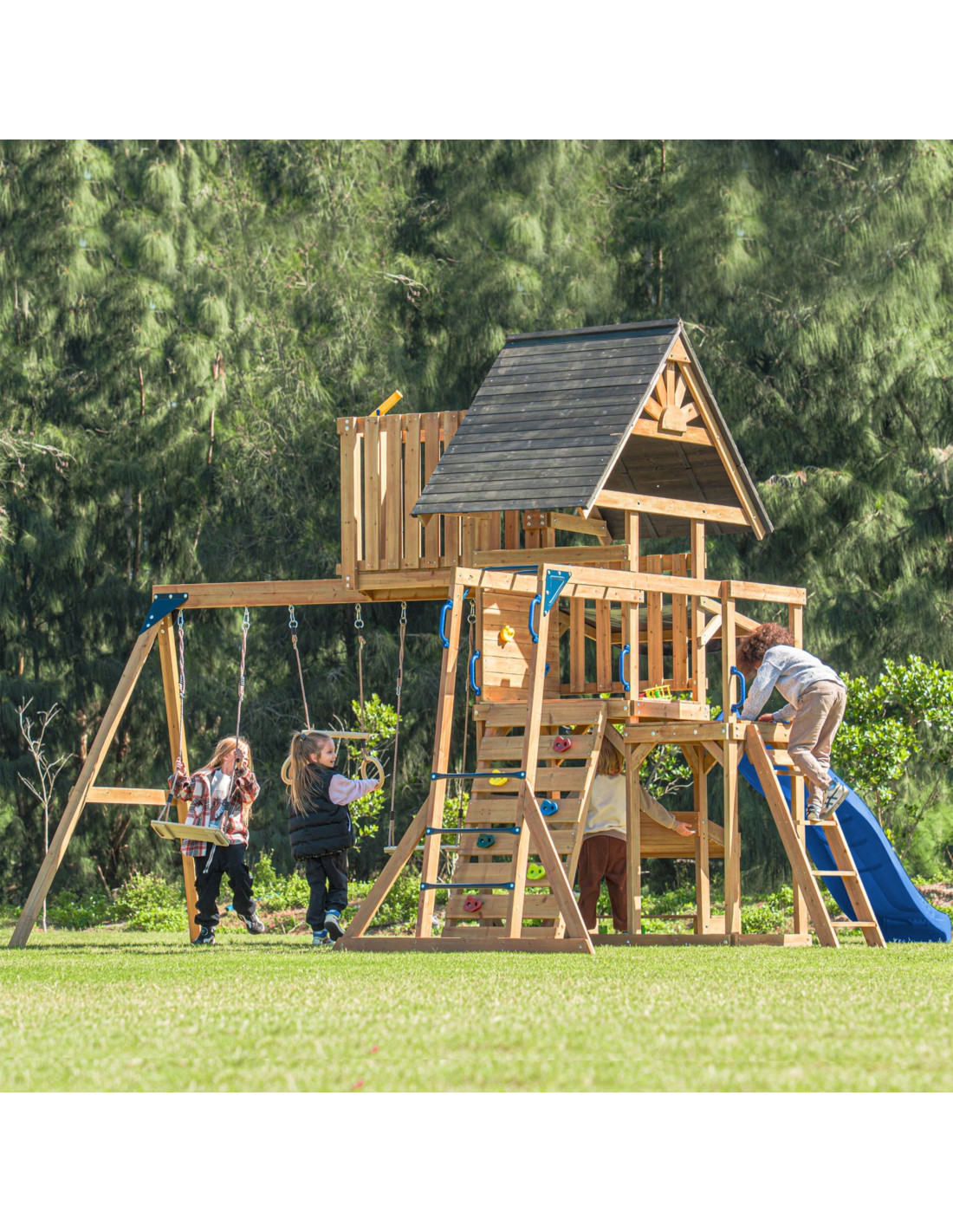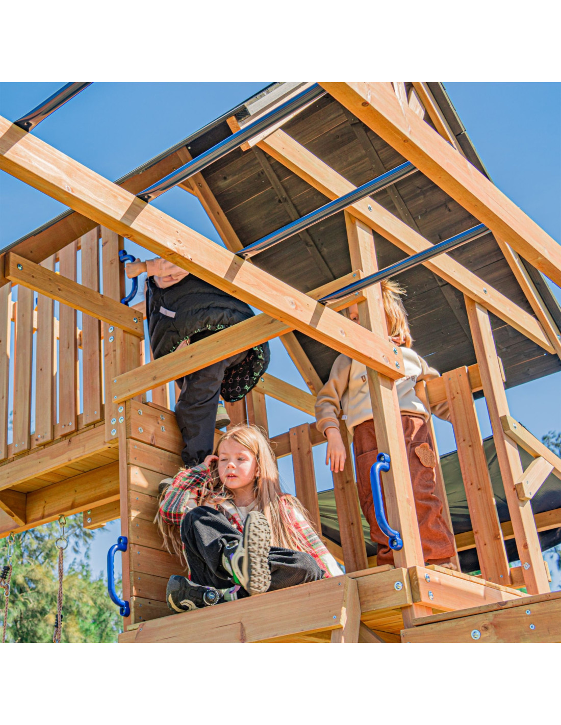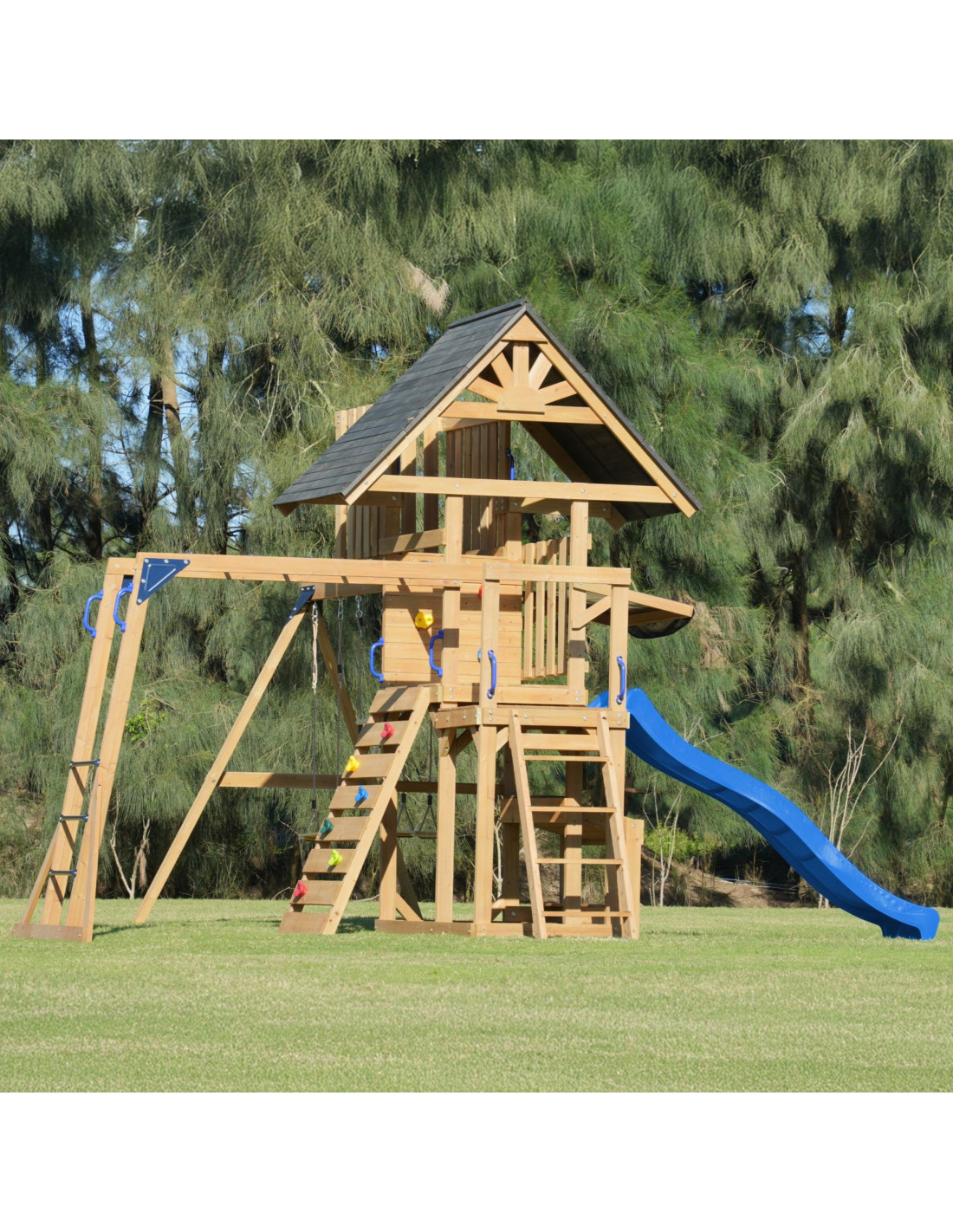 ✔ A multifunctional play set that combines a swing, slide, observation tower, trapeze and sandbox