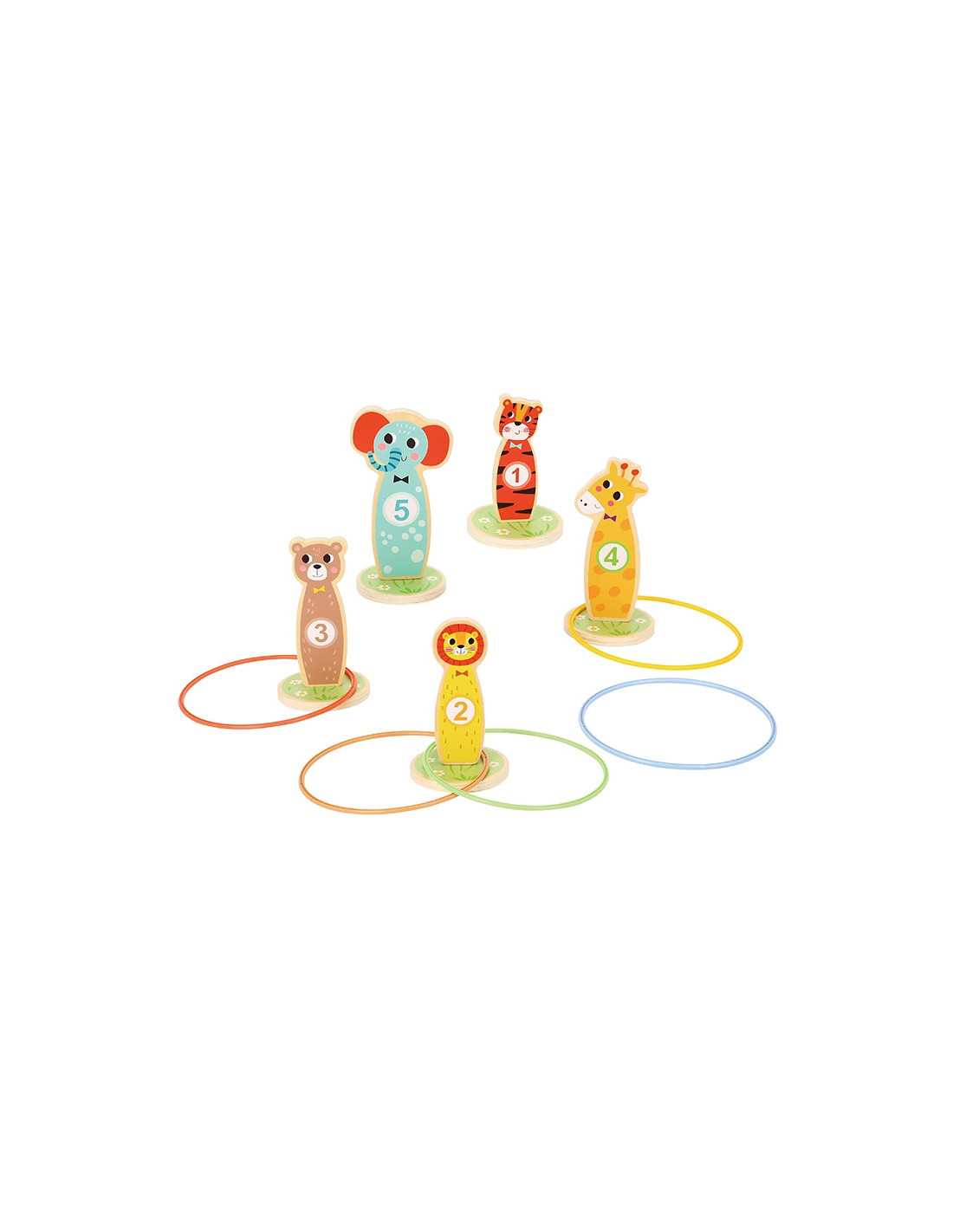 Tooky Toy Wooden Throwing Target Skill Game - This fun skill game is perfect for kids. As the game progresses, you can increase the difficulty by placing the pegs further apart. The set includes 5 adorable animal-shaped pegs on wheels and 5 throwing rings . Suitable for indoor and outdoor play, it can be played alone or with friends.