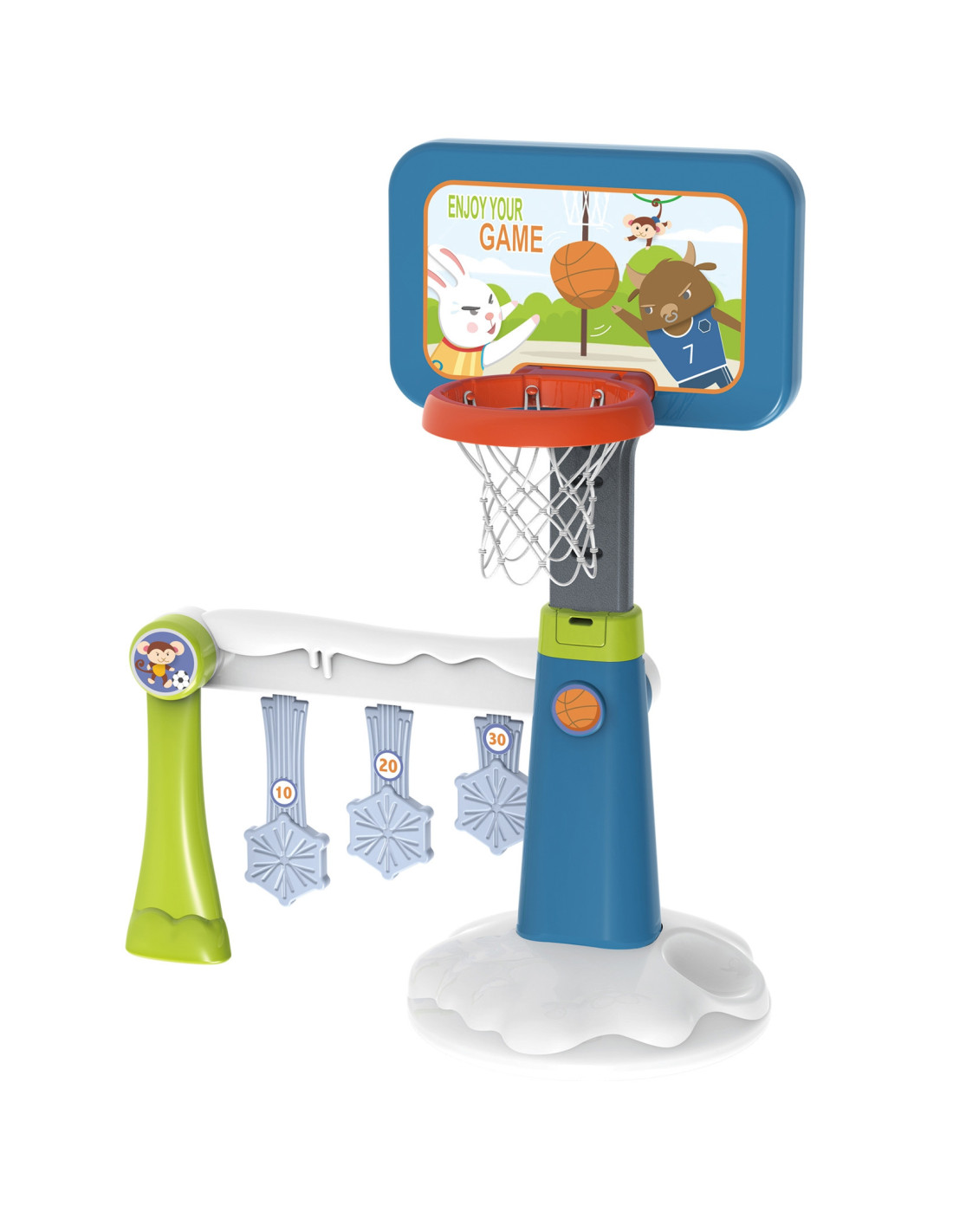 Zestaw sportowy 2w1 koszykówka i bramka marki Woopie jest super połączeniem sportowym dla najmłodszych dzieci! Dziecko może wybrać w co w danej chwili chce zagrać. Dziecko może grać samo w koszykówkę lub z przyjaciółmi w piłkę nożną - nigdy nie będzie się nudzić! W bramce znajduje się tarcza z punktacją, kto ustrzeli największą liczbę punktów - wygrywa. Zestaw na pewno zachęca Twoje dziecko do uprawiania sportu. Aktywność dostarczy twojemu dziecku rozwój tzw. dużej motoryki, co jest idealne dla prawidłowego rozwoju dziecka. Wielkim plusem jest to, że produkt może być używany zarówno w domu jak, i na zewnątrz - Twoje dziecko będzie mogło grać wszędzie bez względu na pogodę. Koszykówka jest wysokości 125 cm - doskonała dla najmłodszych graczy!