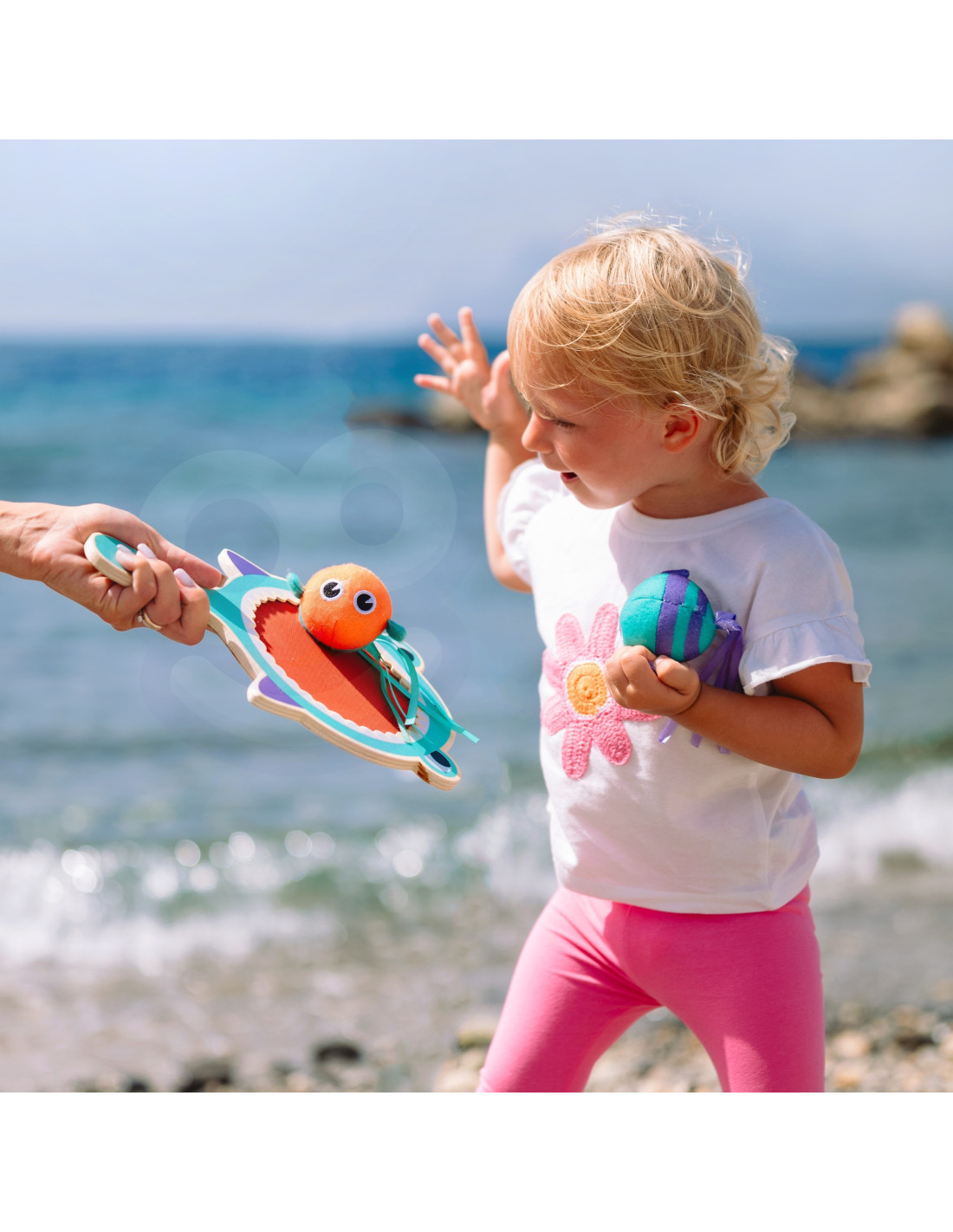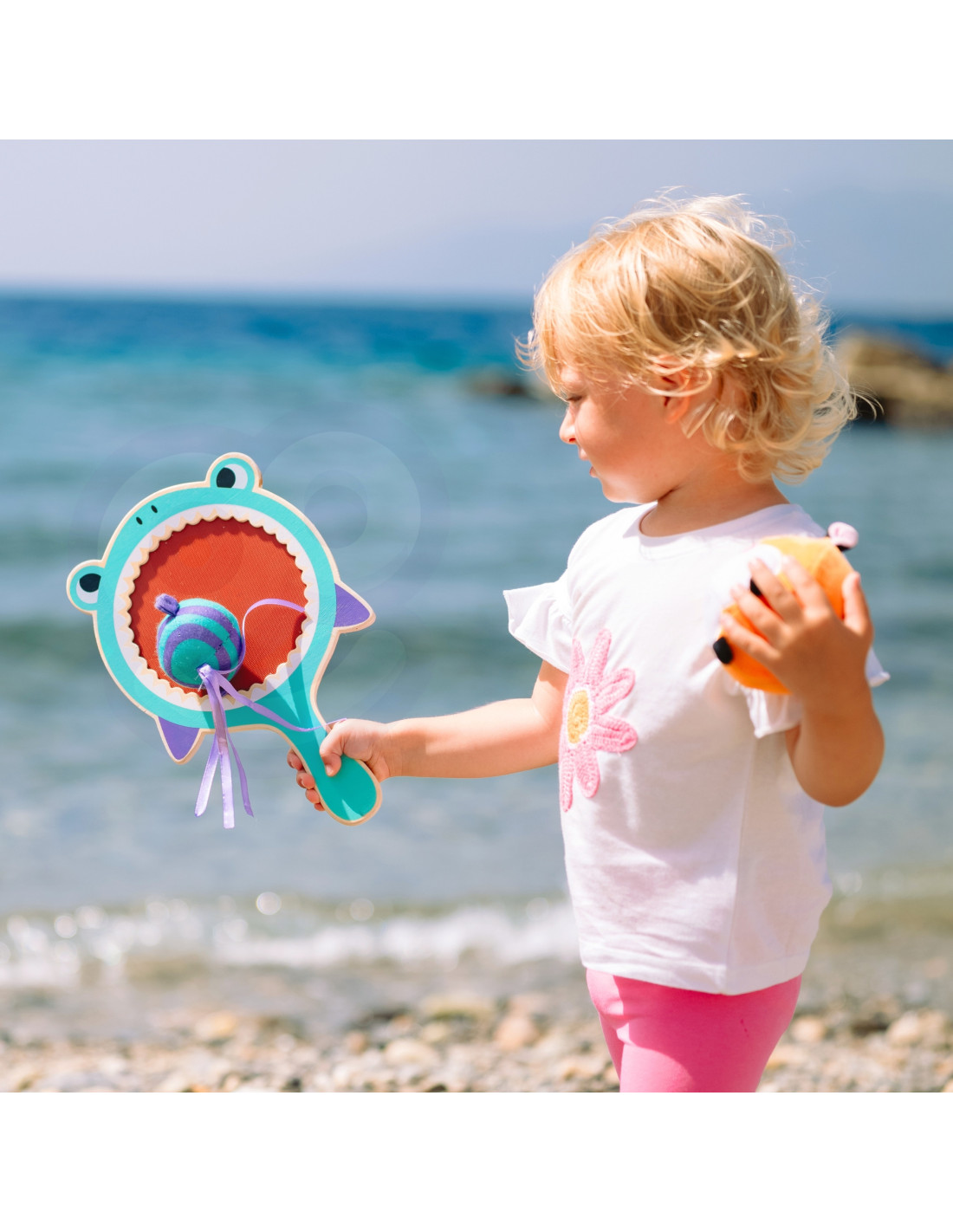 The CATCH BALL game from the WOOPIE brand from the GREEN series is fun for everyone , everywhere! The set includes a shark-shaped paddle with Velcro and two soft, colorful fish. The game involves catching the balls/fish with the Velcro paddle. You can play alone or with friends, for example, one or two people throw and one catch. You can play anywhere – indoors or outdoors. The vibrant colors will catch every child's eye and engage them in active play . An additional advantage is the lack of sharp edges , making the product safe for our children. This game fosters teamwork and competition, while also developing children's fine motor skills .
