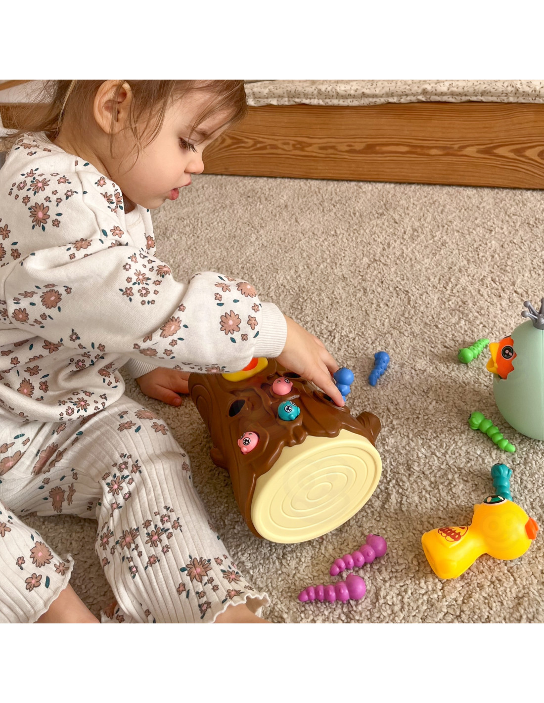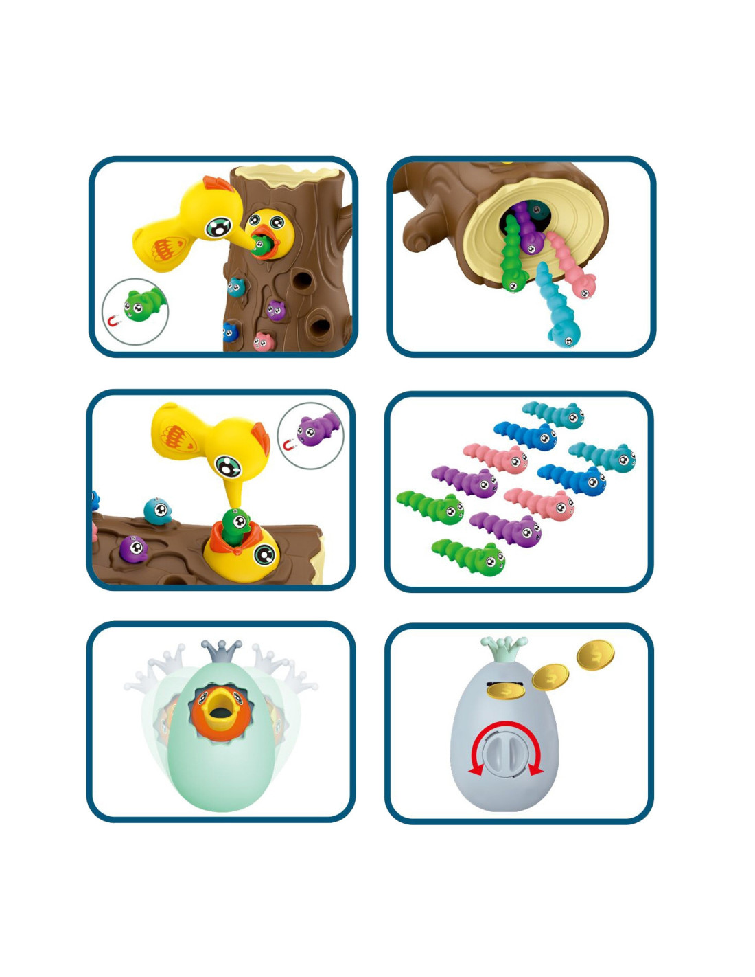 The game involves feeding a hungry chick with worms hidden in a tree trunk. Children use the woodpeckers' magnetic beaks to "catch" the worms and transfer them to the chick. The game requires precision and focus, allowing children to practice their manual dexterity while having a great time. After the game is over, the worms can be poured out of the tree trunk, preparing everything for the next round.