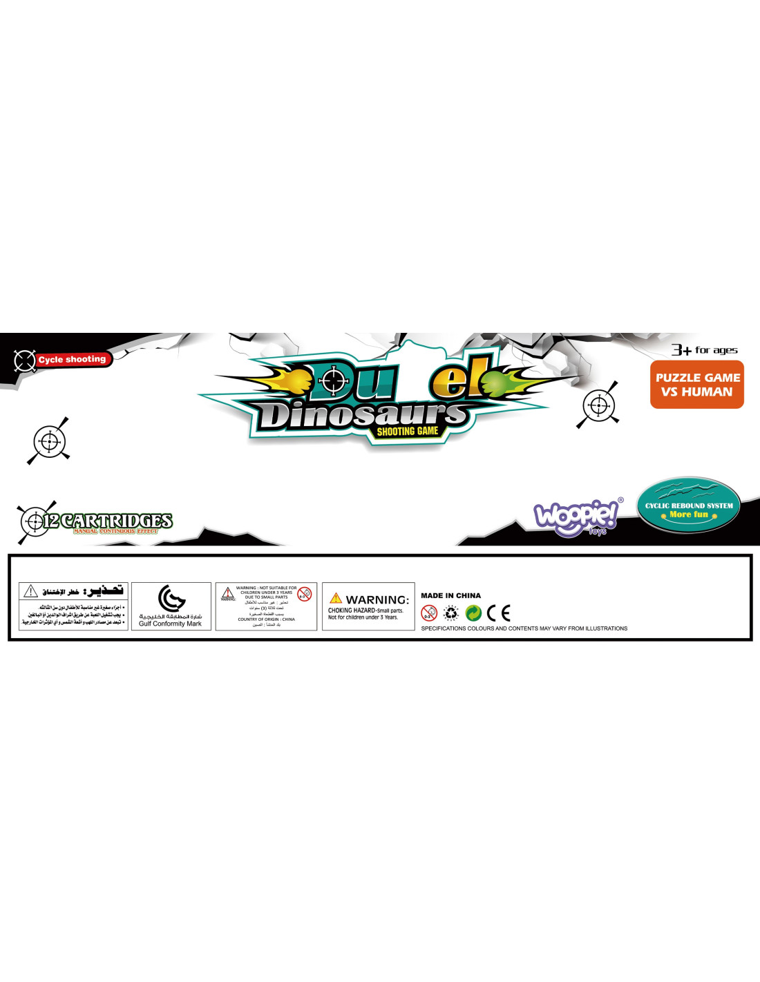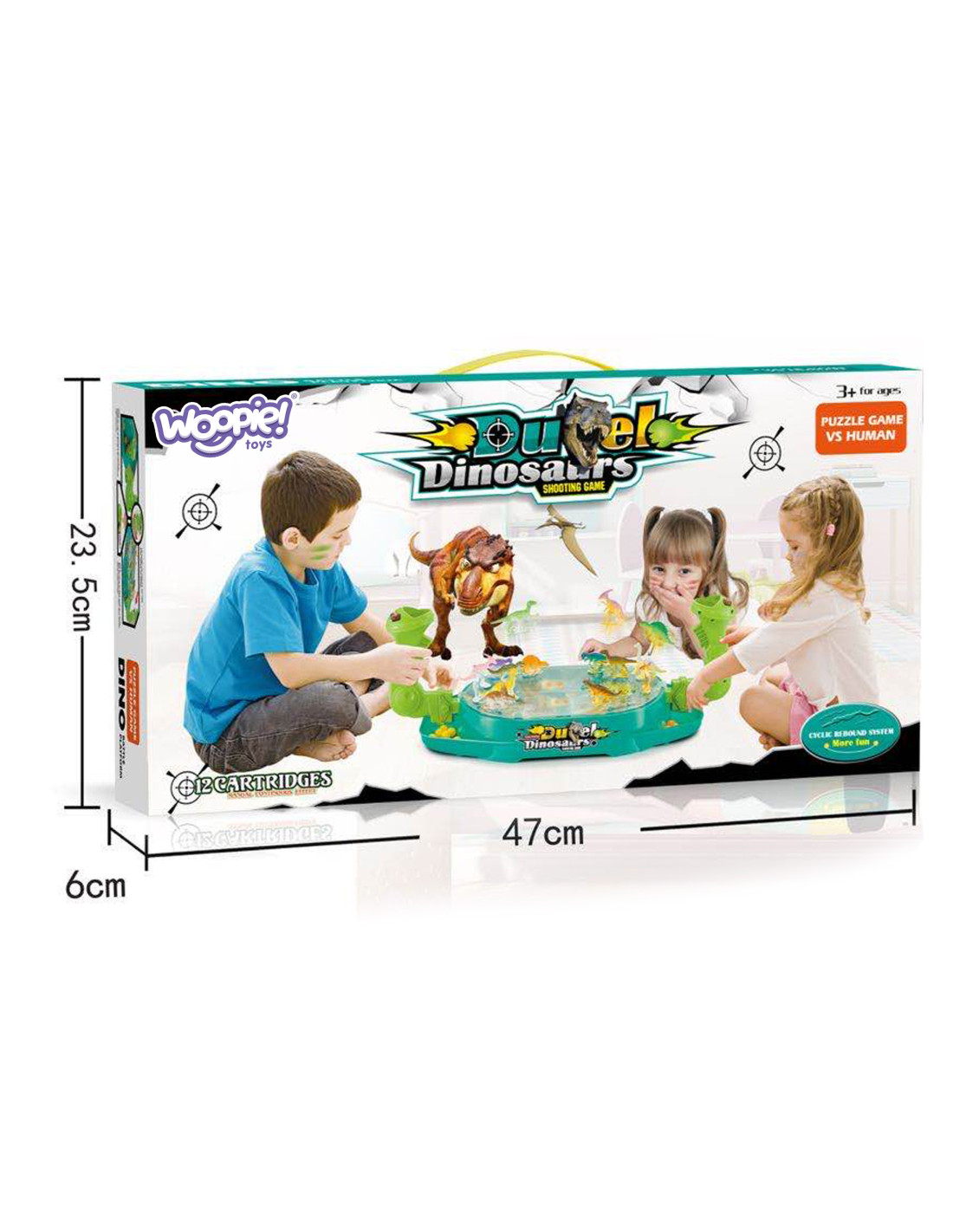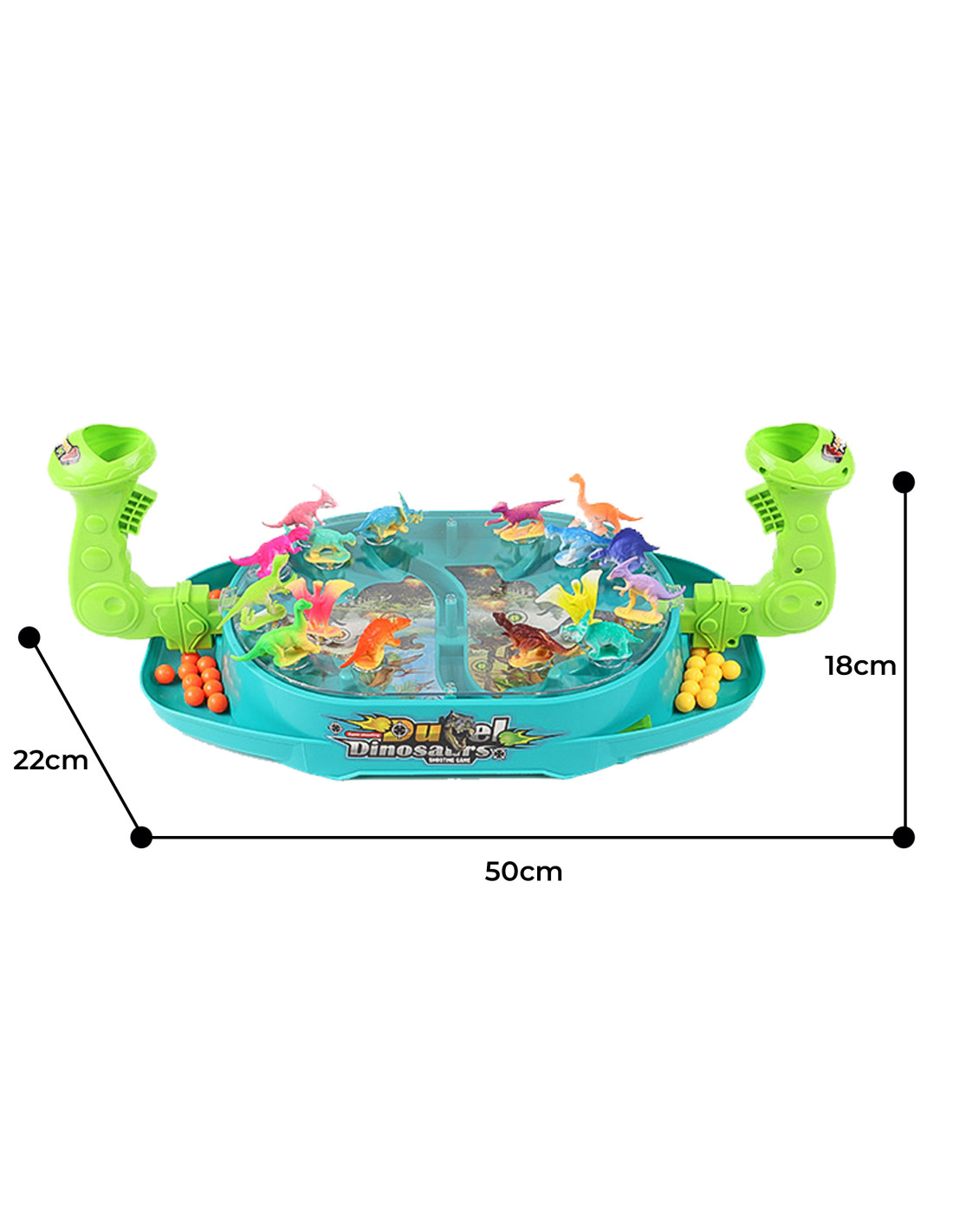 Dinosaur Battle is an arcade game from the Woopie brand. This two-player dinosaur shooter will significantly improve coordination skills . Place the dinosaurs on the board in the appropriate spots. Drop the balls into the holder and pull the trigger to knock the dinosaurs off. The player who knocks the dinosaurs off the opponent's board the fastest wins. The set includes a game board with a plastic cover that prevents the balls from falling out, 16 colorful dinosaurs, and 24 balls in two colors.