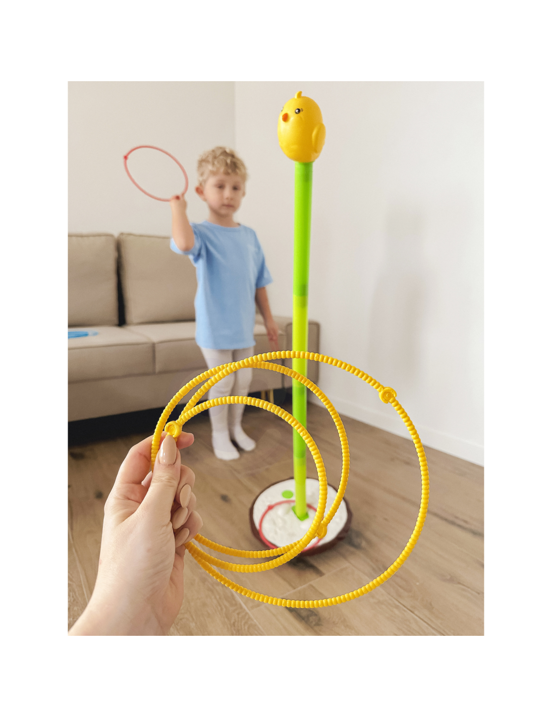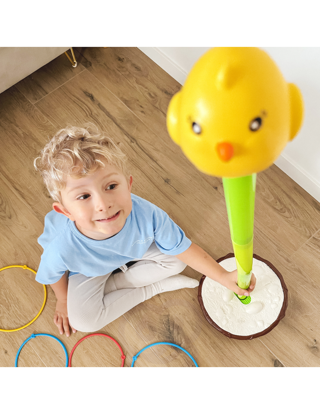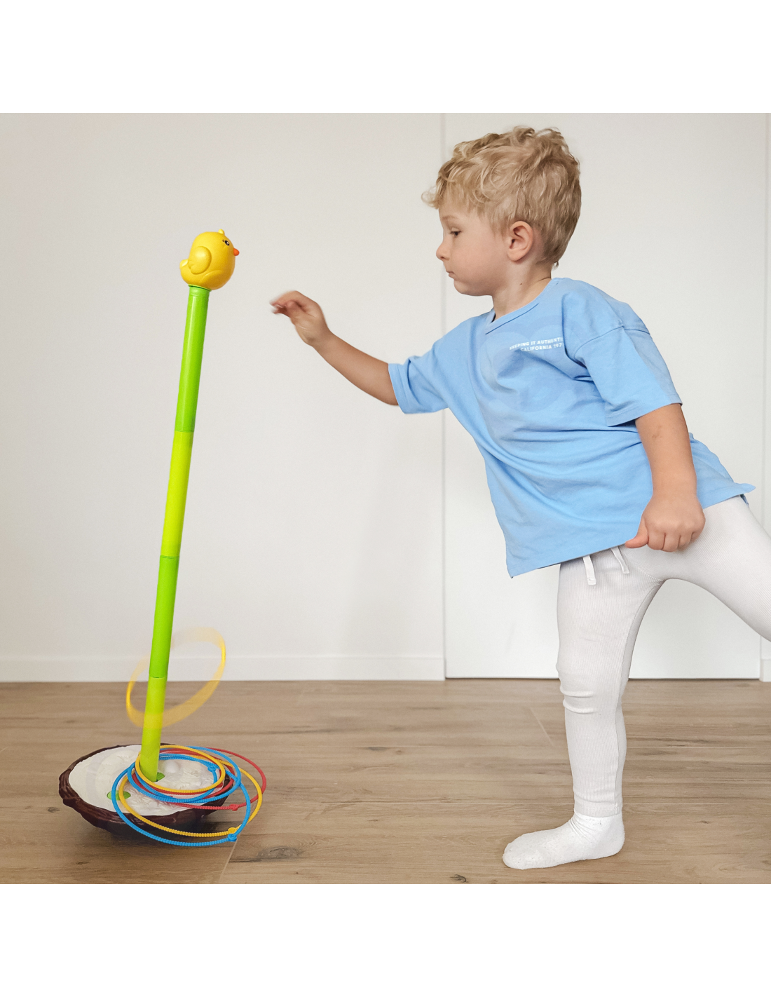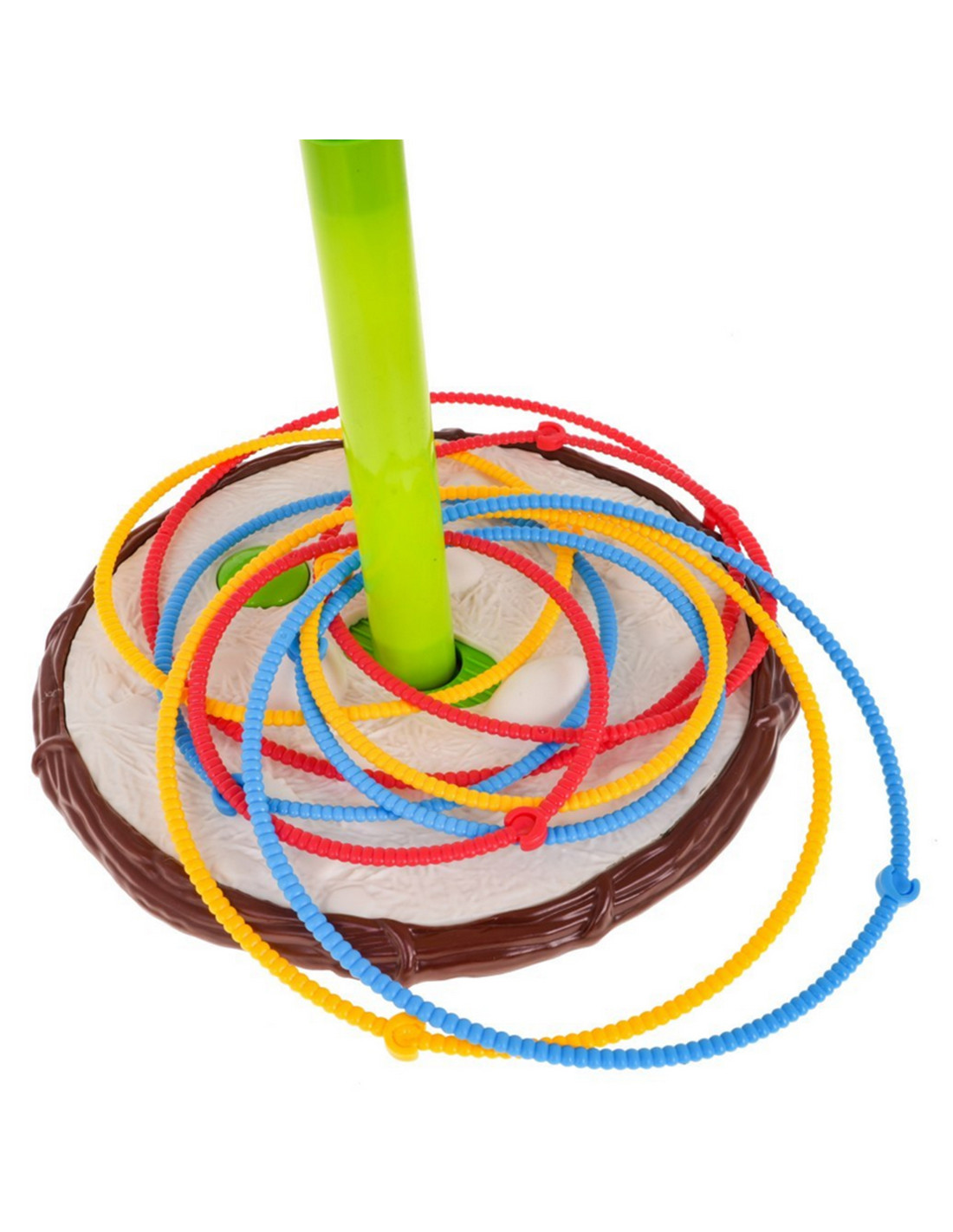 The Hoops Arcade Game from the WOOPIE brand is a multiplayer game for children aged 3 and up . Two or three players can play. A small bird teeters on a nest, and its task is to place all the hoops on a stem. The toy has three levels of height adjustment; the higher the stem, the higher the difficulty.