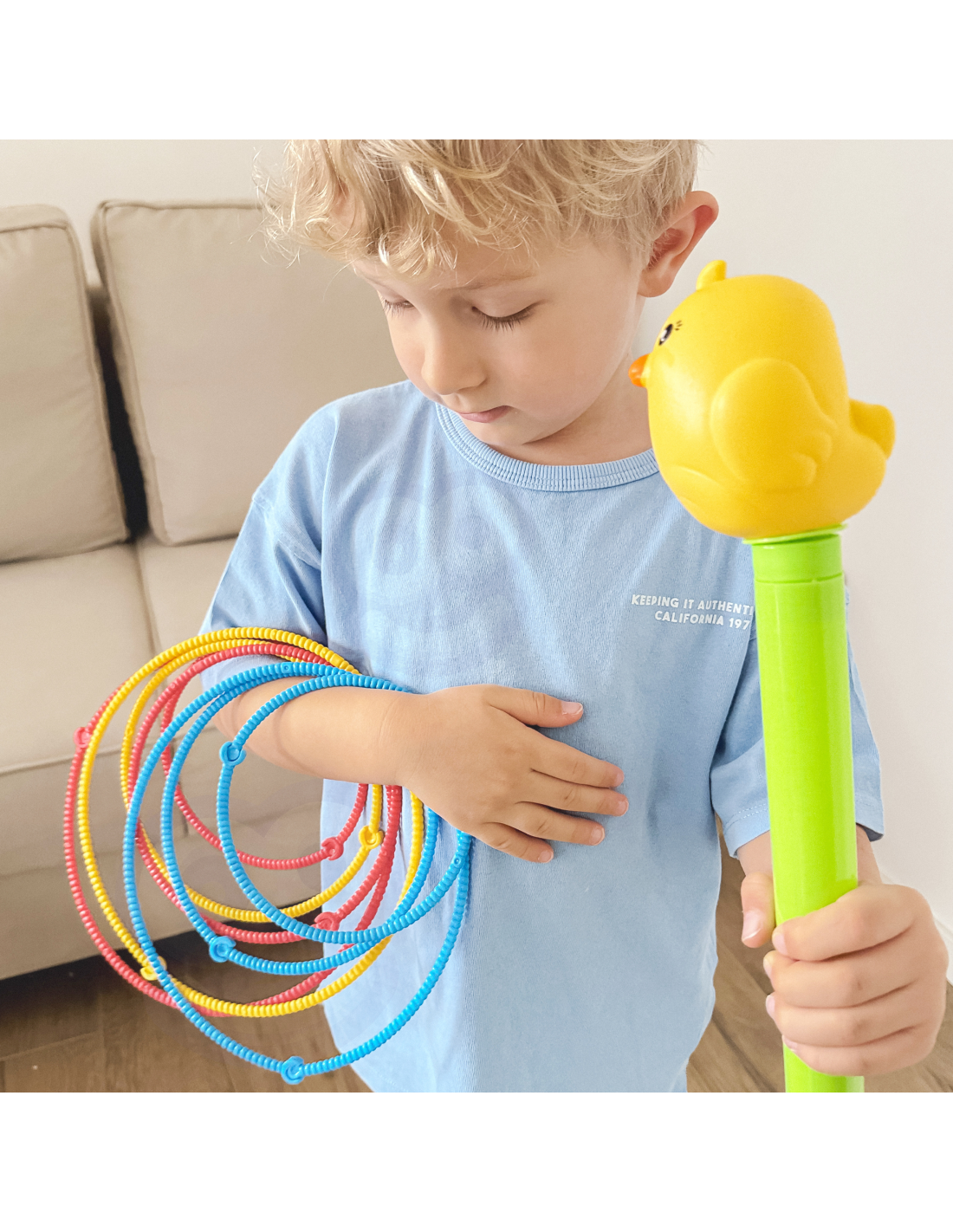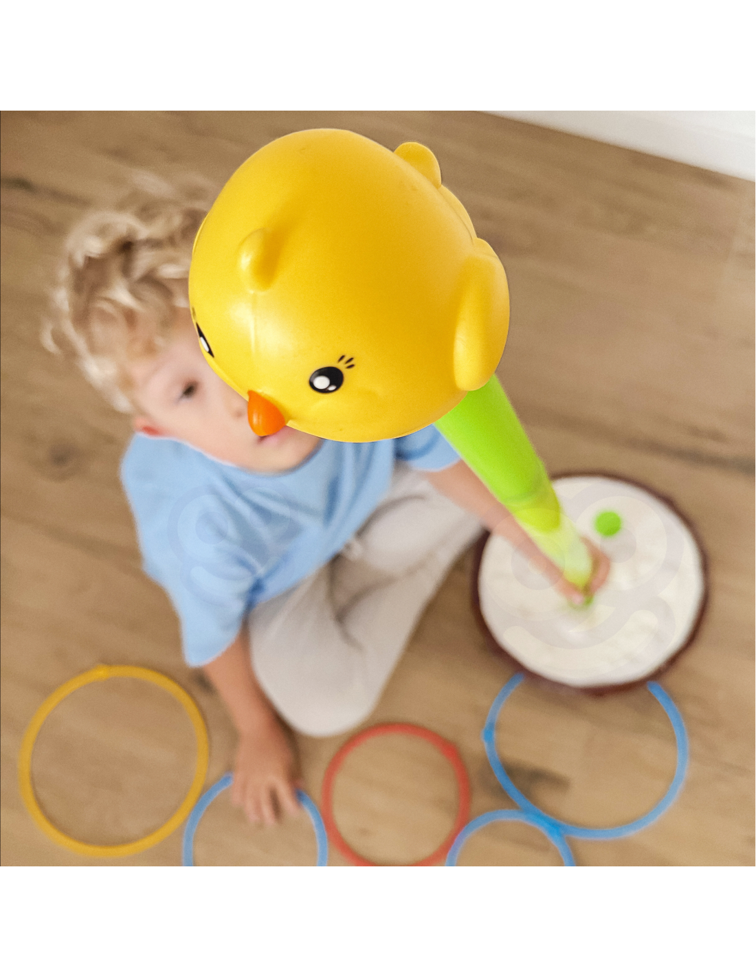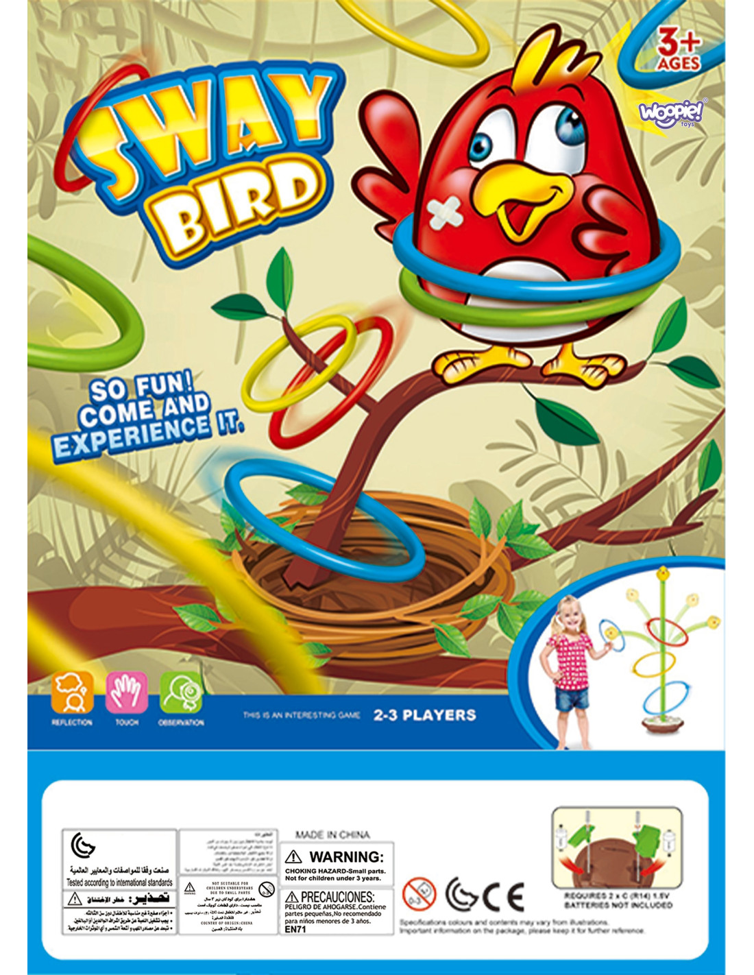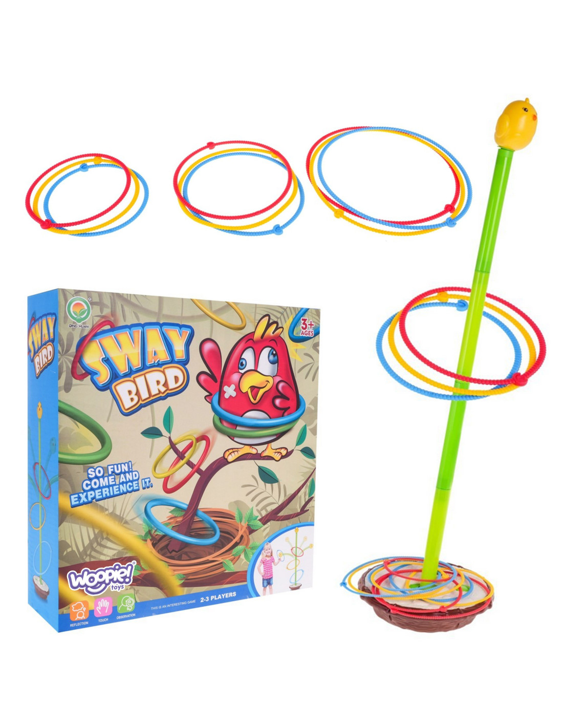 The Hoops Arcade Game from the WOOPIE brand is a multiplayer game for children aged 3 and up . Two or three players can play. A small bird teeters on a nest, and its task is to place all the hoops on a stem. The toy has three levels of height adjustment; the higher the stem, the higher the difficulty.