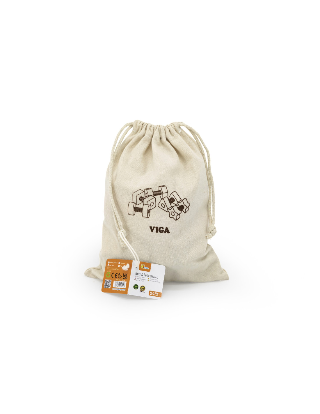 Nuts and Bolts is a VIGA dexterity toy that involves screwing and unscrewing colorful shapes. It's great fun for children to mix and match, while also teaching them counting , colors, and shapes . Screwing and unscrewing will improve their manual dexterity and visual coordination. The set includes 40 pieces, 20 pairs of nuts and bolts in 5 bright colors and shapes, and a cotton bag for easy storage.