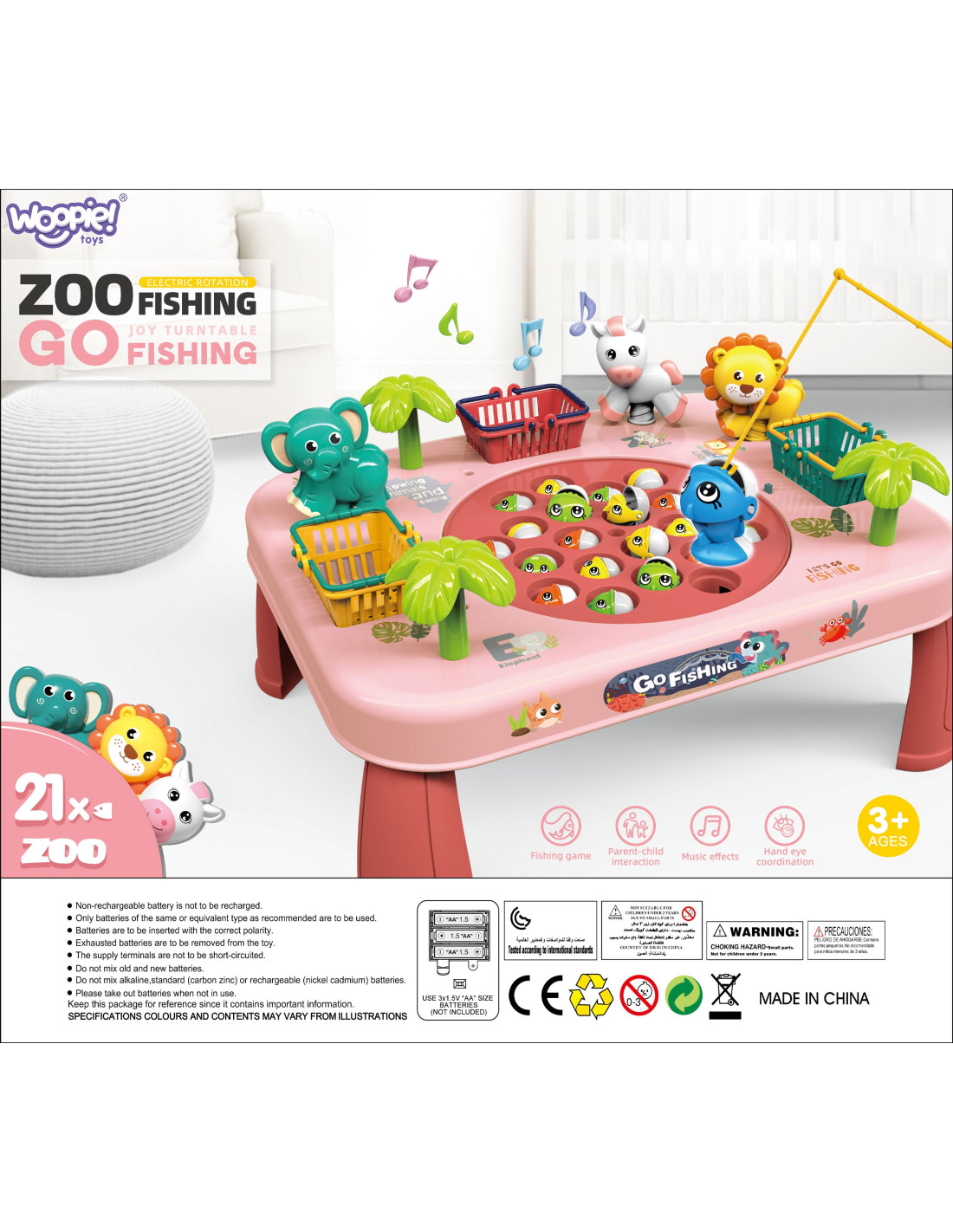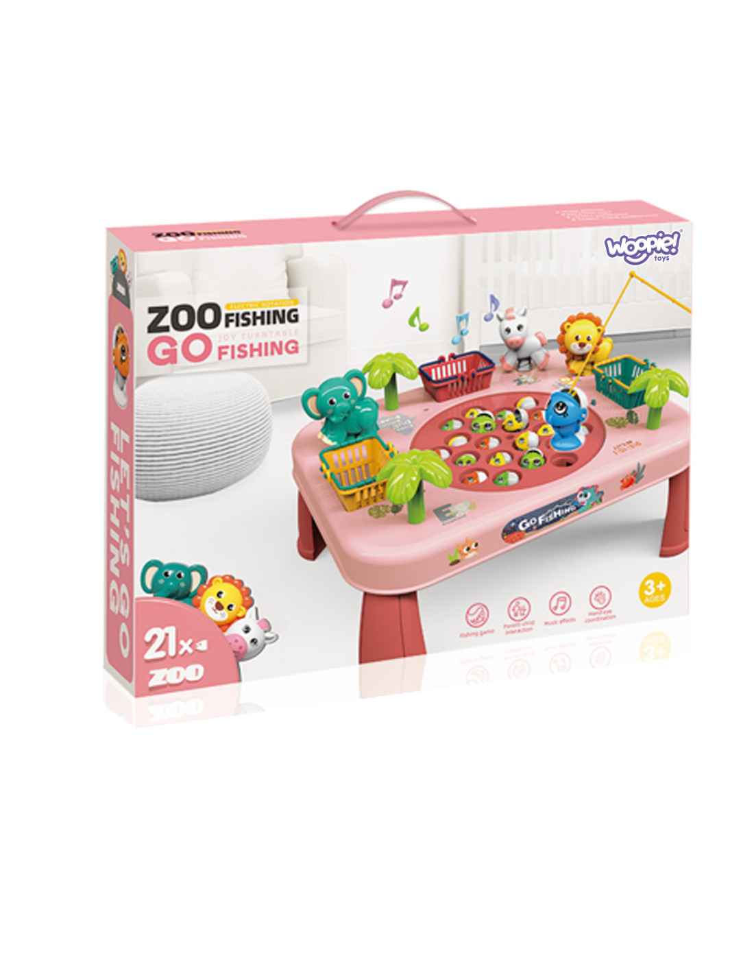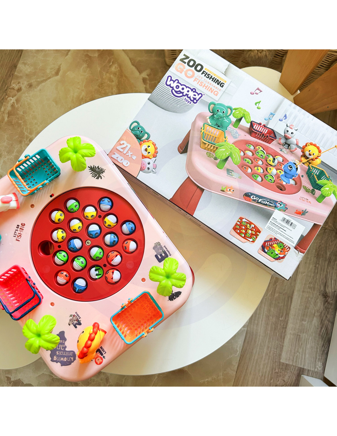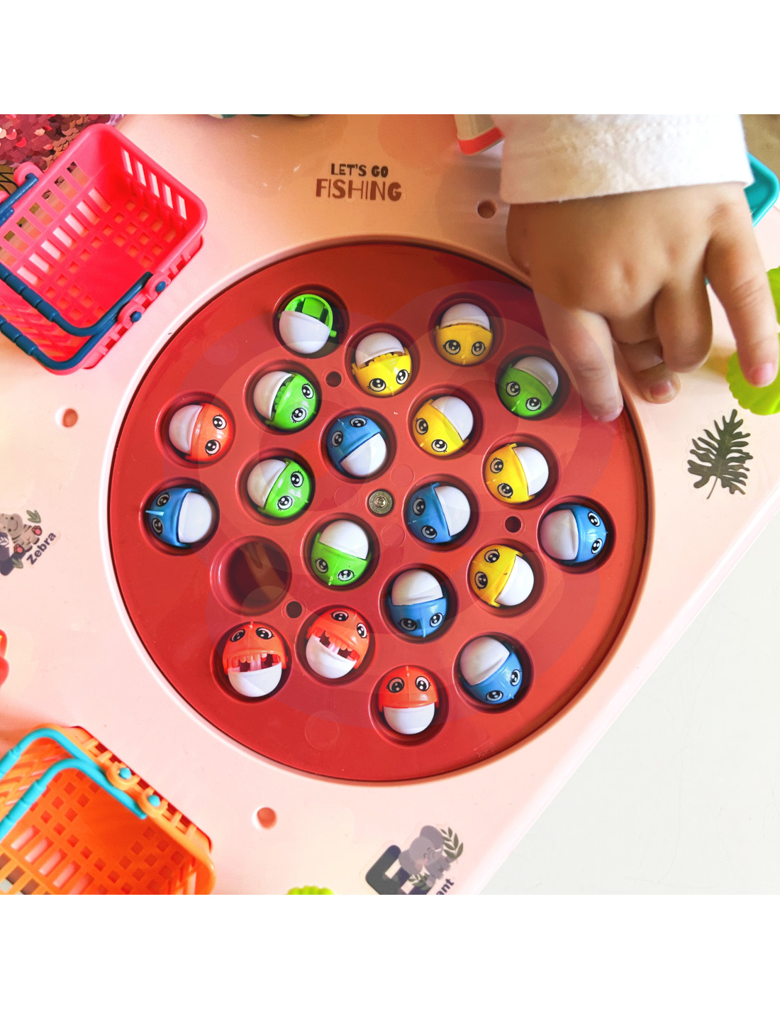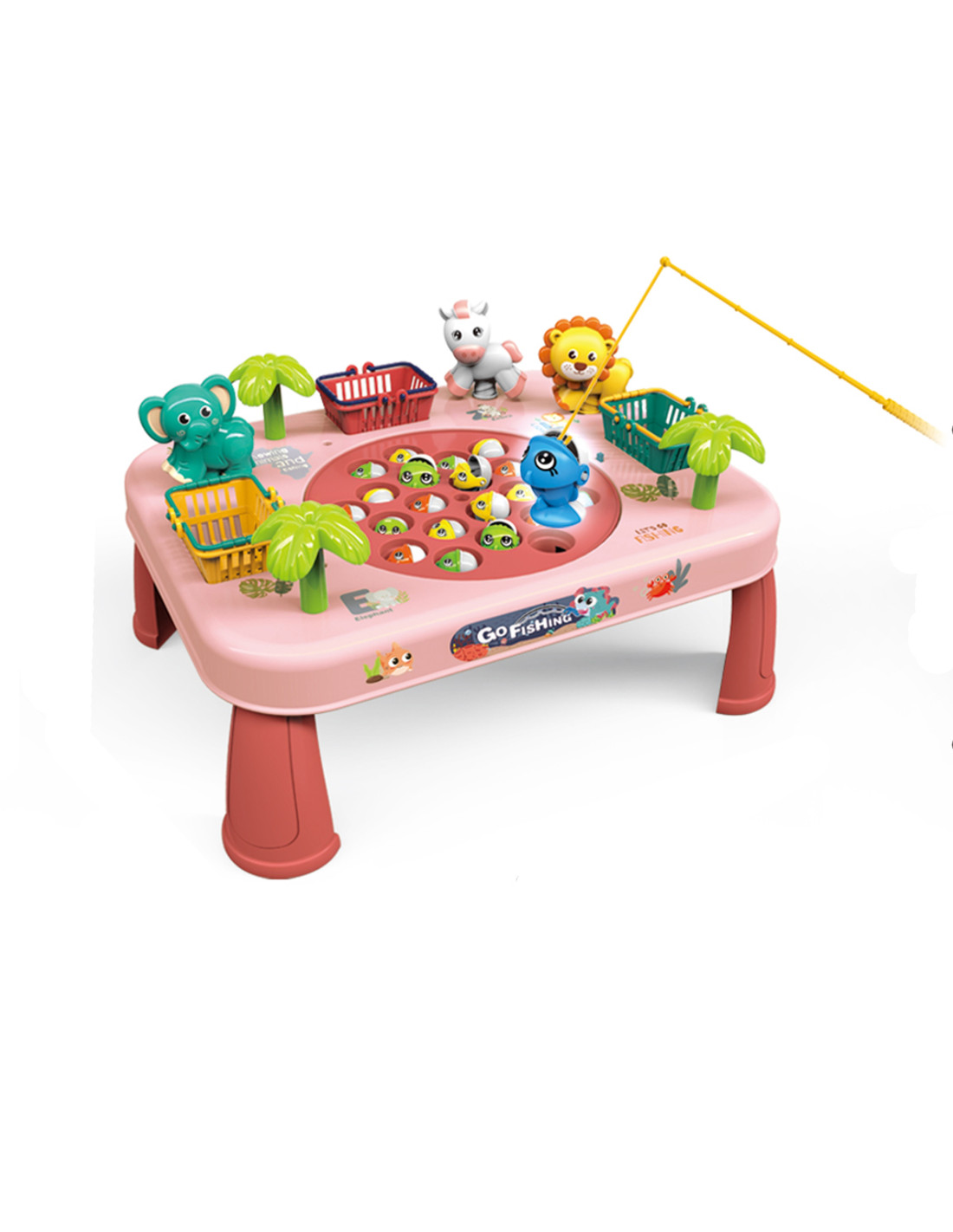 This unique table is a gateway to endless entertainment for the whole family and friends. Constructed from solid material, it's not only durable but also aesthetically pleasing . Its colorful design attracts attention and encourages shared play. The baskets on the sides of the table are not only practical but also a competitive element. Collect as many fish as possible, toss them into the baskets, and get ready to tally your points at the end of the game . The sides of the table also feature adorable animals that are pleasing to the eye. To make catching more challenging, the board containing the fish moves. To make the game more enjoyable, the table plays music and makes sound effects!