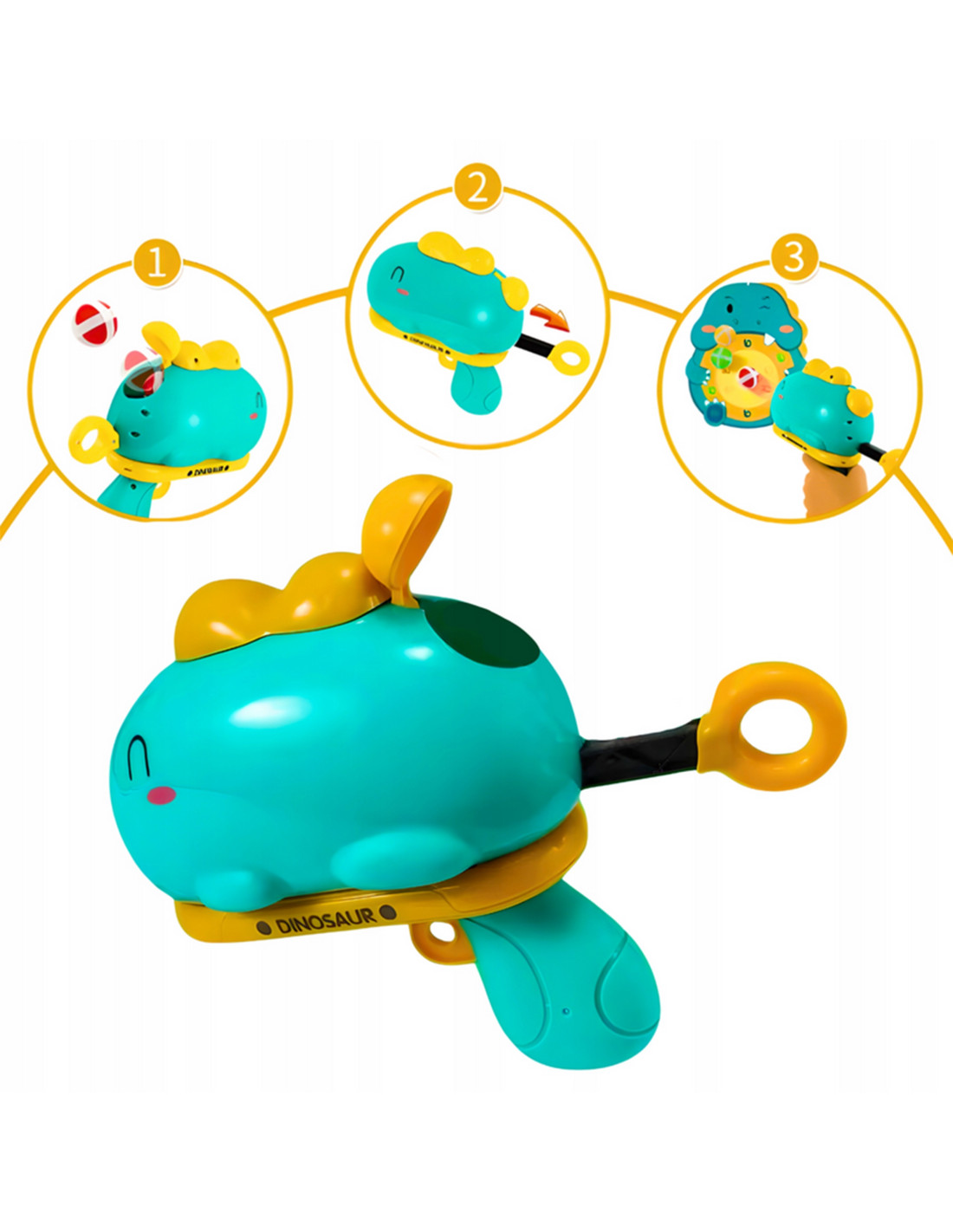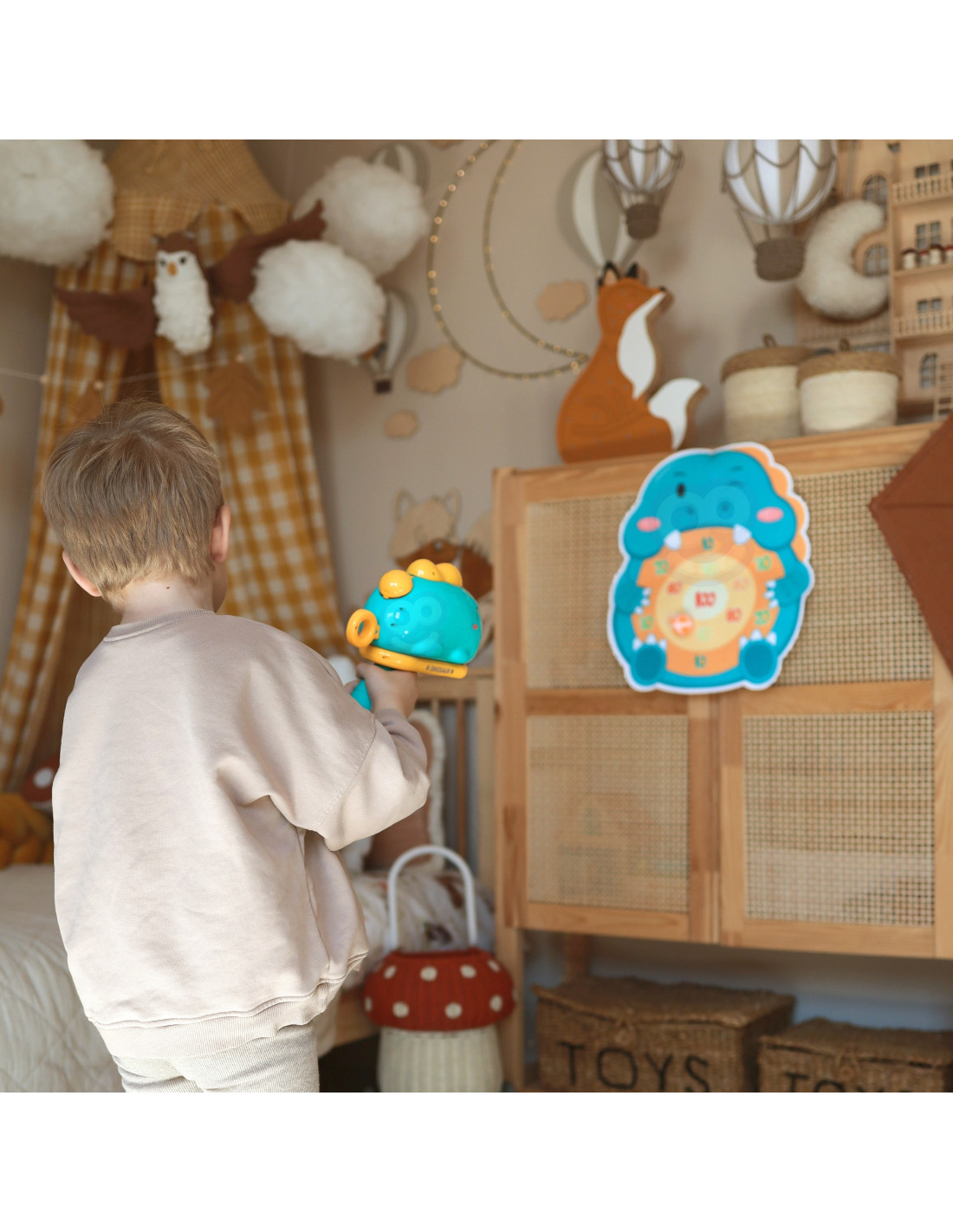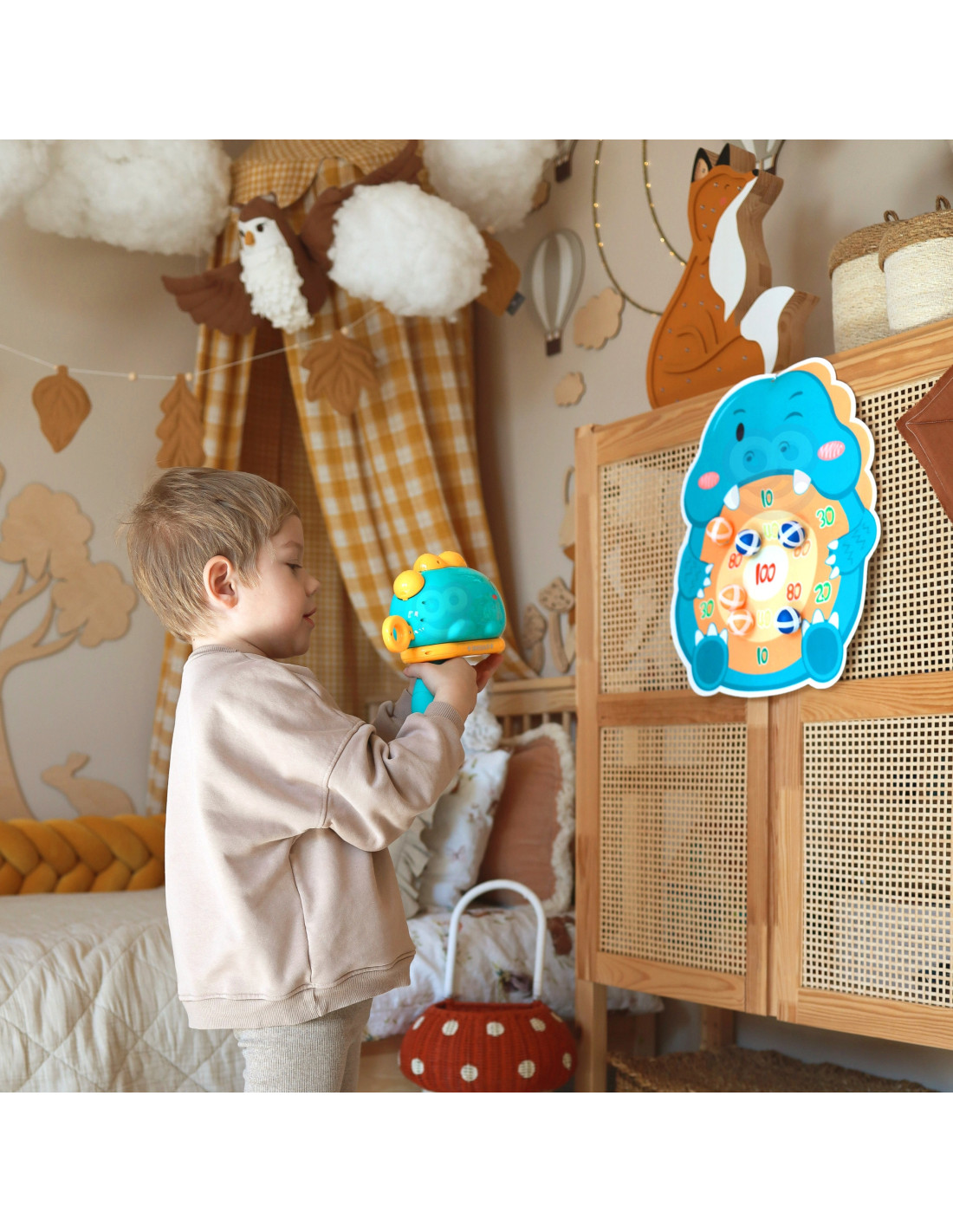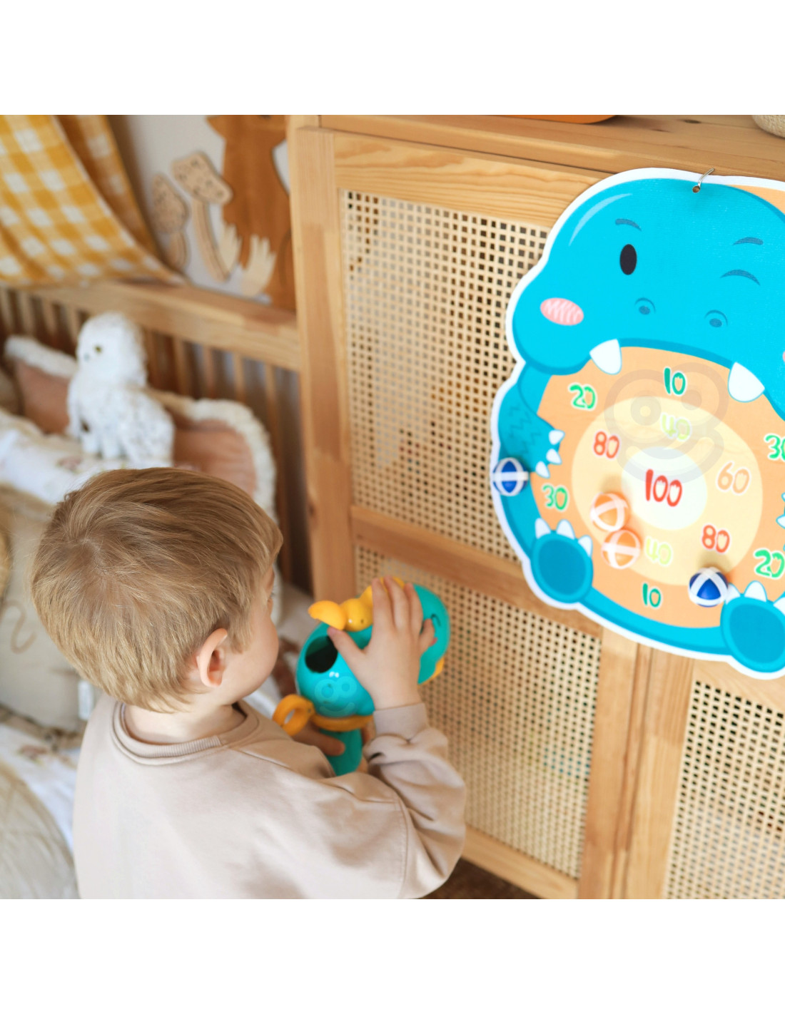 The WOOPIE dart gun features a prehistoric reptile design, making it perfect for all fans of this genre. Simply load the dinosaur-shaped gun with balls, pull the lever, and then aim at the target on the dartboard. The dartboard is lightweight and portable , allowing you to play anywhere – both indoors and outdoors. Equipped with a mounting hook , the dartboard easily attaches to various surfaces, and after play, you can quickly fold it up and store it neatly. The set includes six colorful darts. This game is perfect for developing fine motor skills and coordination in youngsters, and for fostering competitive spirit in older ones. The dartboard, divided into scoring zones, adds a competitive element – see who in your family or group of friends will become the marksmanship champion.