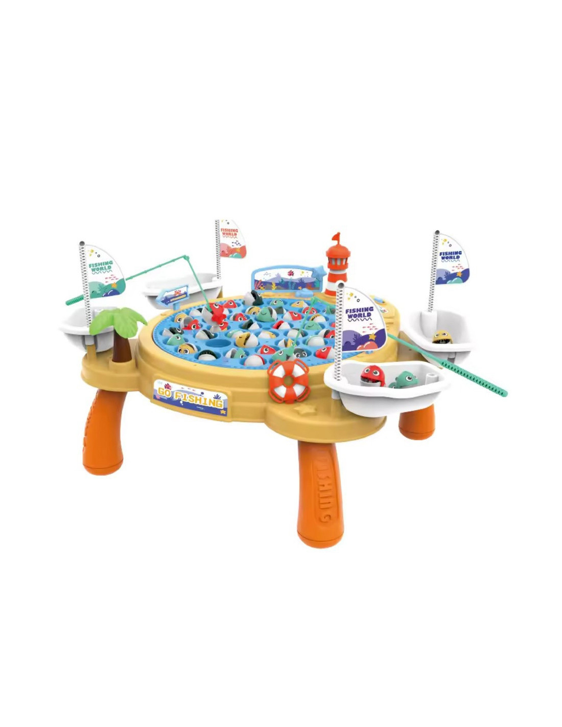"PIRATE SHIP" Magnetic Fishing Game from Woopie is a play table that transports children to the fascinating world of fishing, teaching patience, concentration , and dexterity . This interactive table offers the opportunity to play fishing with magnetic rods, but also features a rotating base with fish. Music plays during play , adding even more variety! The table is equipped with seating for four players, each with a personal fishing rod and a pirate ship for depositing caught fish . The winner is the player with the most fish.