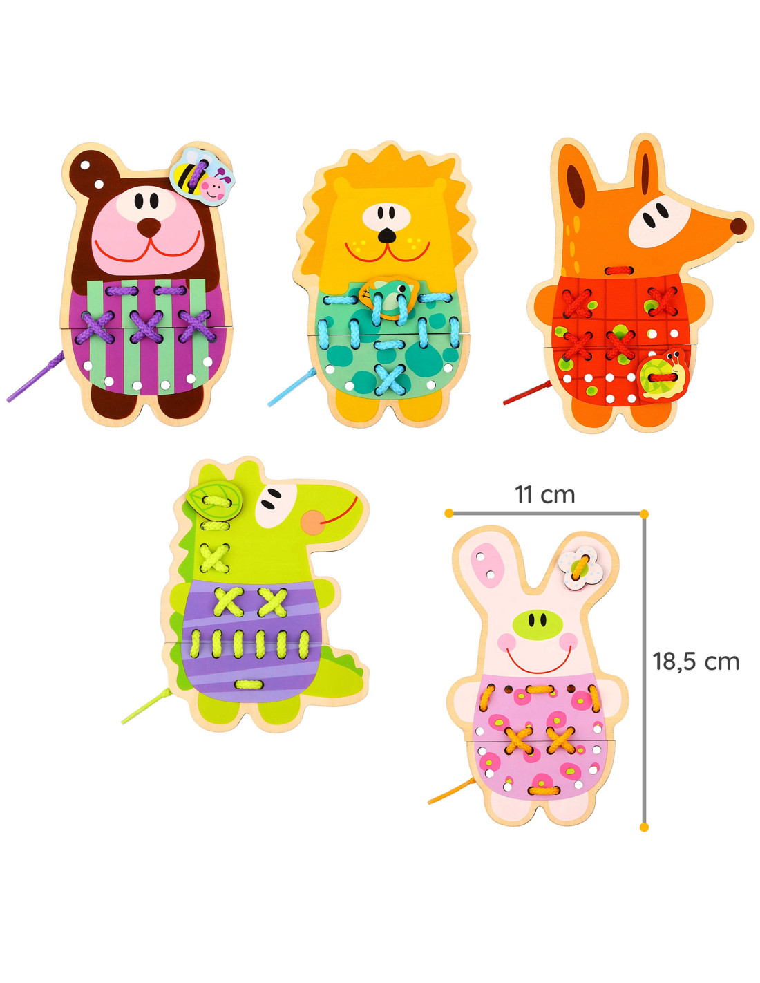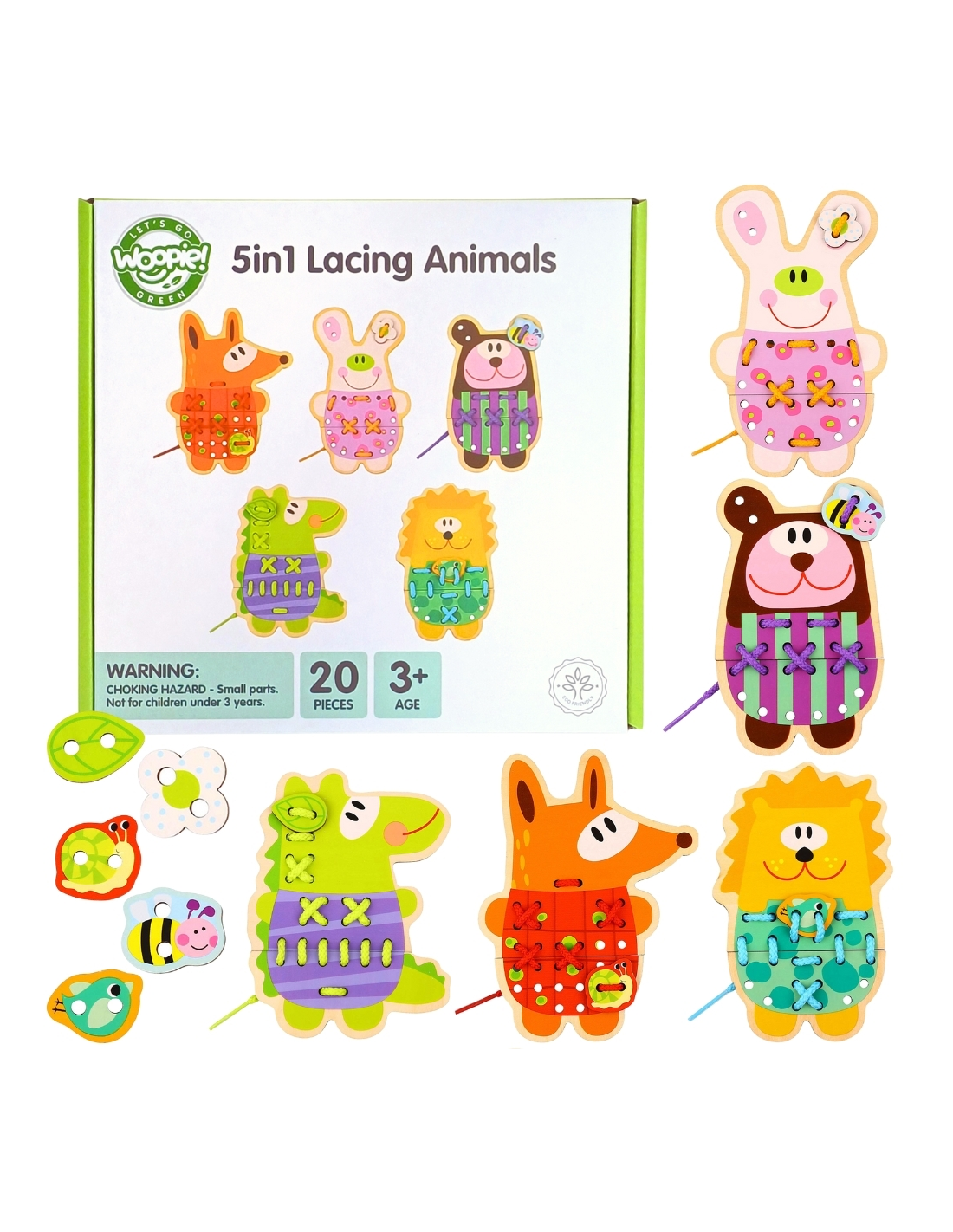 The 5-in-1 Wooden Threading Animals from WOOPIE GREEN is a charming and educational set that transports children to a world of creative play. Colorful wooden animals with threading holes encourage toddlers to practice dexterity and develop fine motor skills. As an added bonus, they can "sew" details onto each animal – a great introduction to learning to write and work with small objects. The set is made of high-quality wood and painted with non-toxic paints, making it completely safe for children. Perfect for little hands and big imaginations!