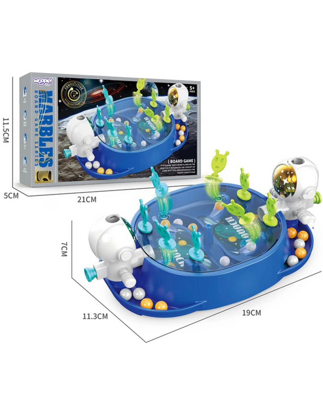 UFO Battle is a skill game from the Woopie brand. This two-player UFO battle will significantly improve your child's motor skills . Place the aliens on the board in the appropriate spots and toss the balls into the holder! Pull the trigger to knock the opposing aliens off the board. The player who knocks the aliens off the board the fastest wins. The set includes a game board with a plastic cover that prevents the balls from falling out, 16 colorful aliens, and 24 balls in two colors.