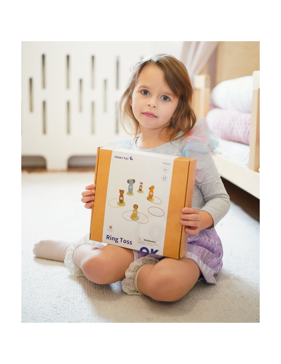 Tooky Toy 's Ring Throw is a skill game that provides hours of fun while developing hand-eye coordination. The set includes five animal figures mounted on bases – a tiger, a bear, a lion, an elephant, and a giraffe – and five rings . The wooden pieces can be arranged in any configuration, and as you progress, you can increase the difficulty by placing the rings further apart, allowing you to creatively design your own version of the game. Perfect for playing with friends and family, the game encourages social interaction.