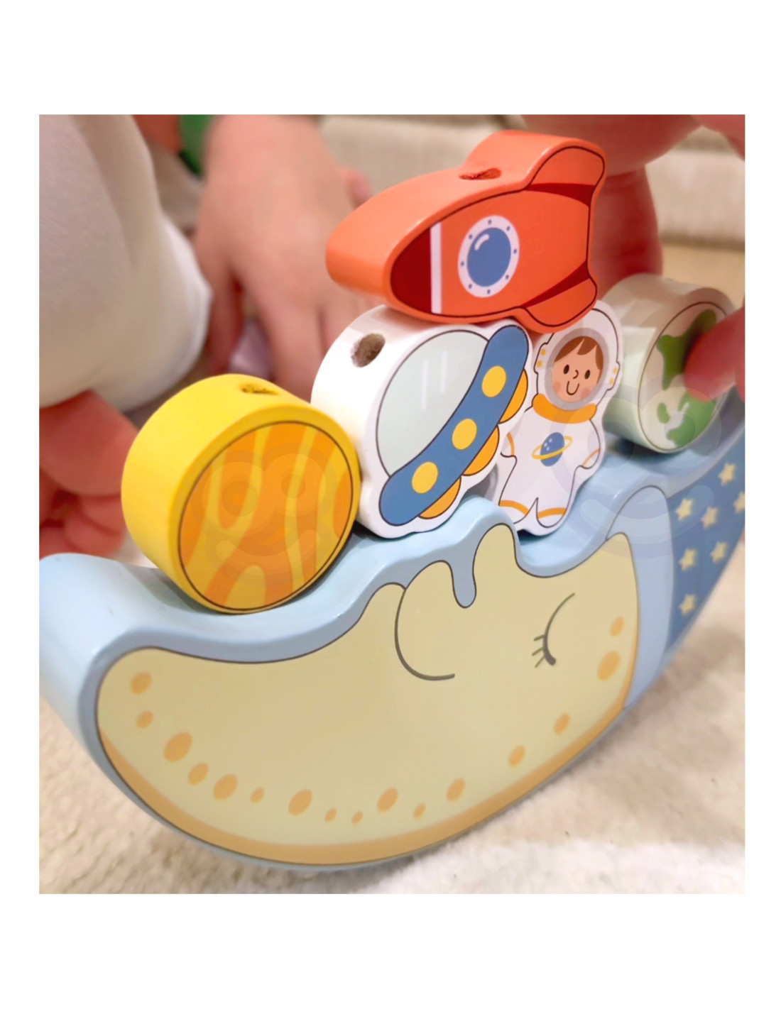 The first part of the set is a balancing challenge: children try to place 10 colorful blocks —a rocket, an astronaut, stars, a UFO, planets, and a cheerful cloud—on a sleeping moon face, trying to keep the structure from tipping over. It's a great opportunity to practice precision and patience.