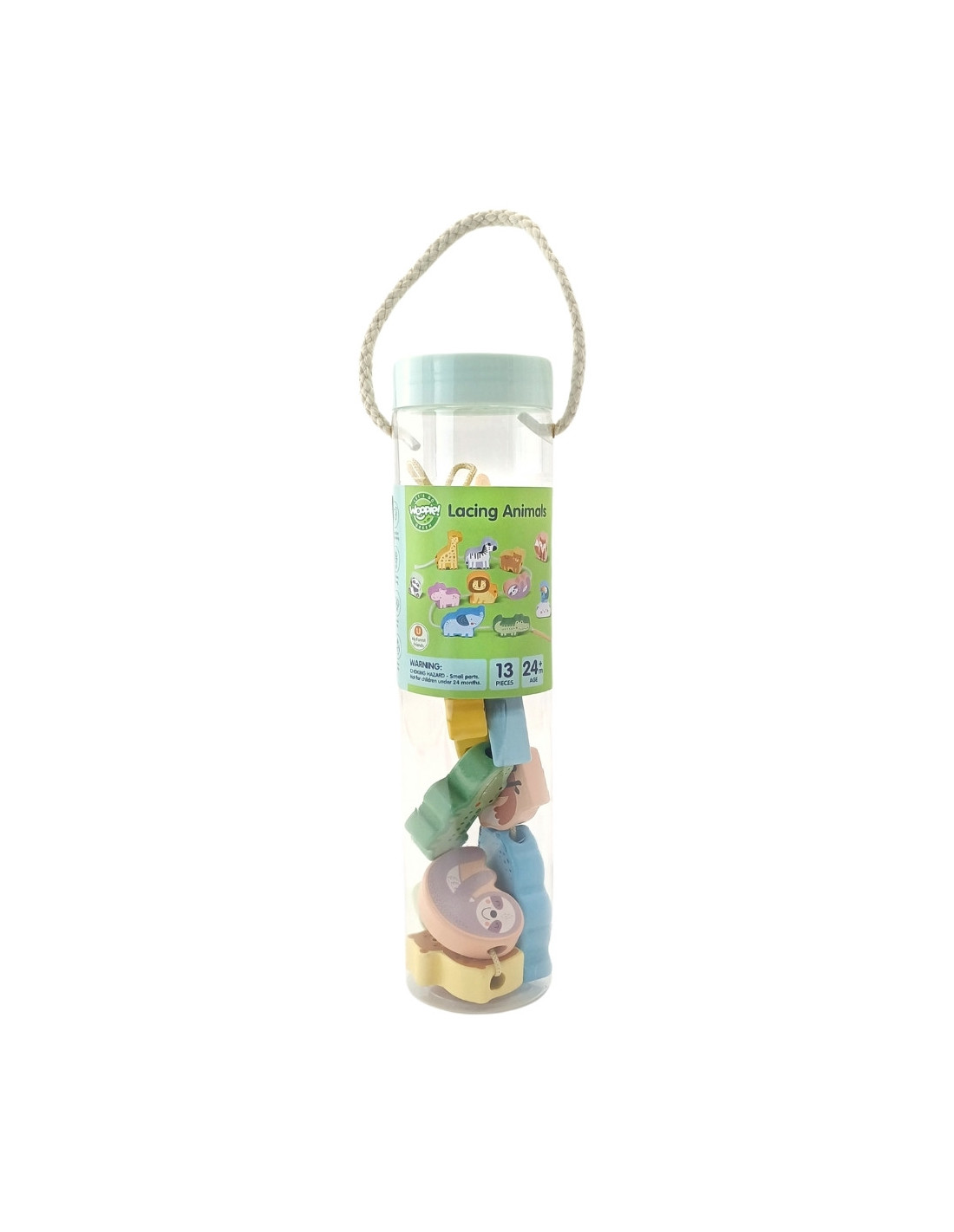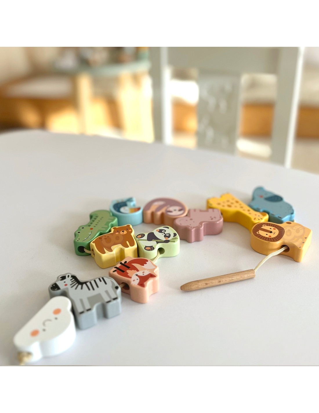 The Zoo Animals Threading Blocks by WOOPIE GREEN are the perfect toy for developing manual skills and creative thinking. The set includes 11 adorable wooden animals and a cheerful cloud, which can be threaded onto the included string. Each animal has special holes that encourage precise threading . This classic game with a modern, pastel twist will engage your child for hours while supporting motor and cognitive development . All pieces are made of safe wood and painted with non-toxic paints – with the youngest explorers in mind.