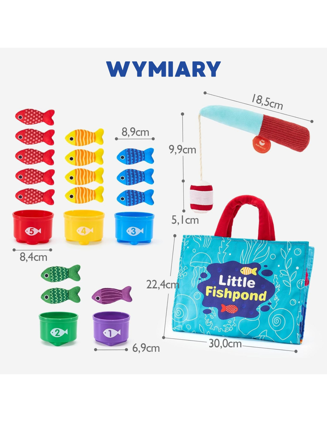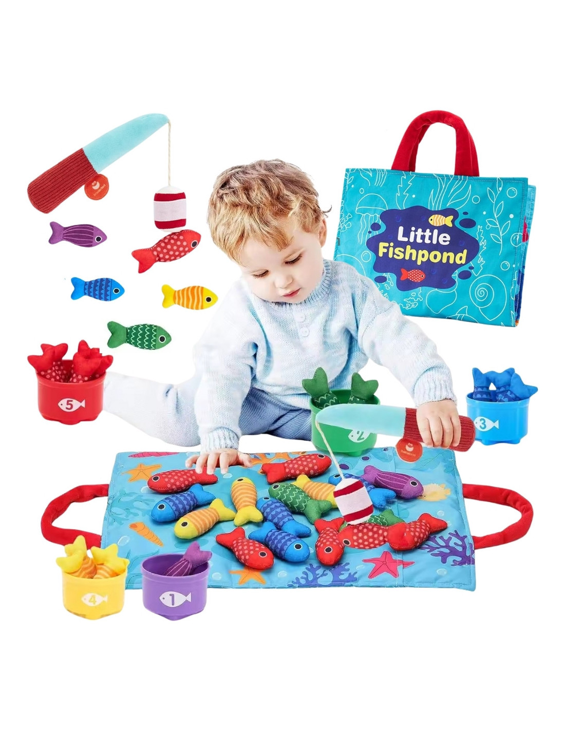 The Little Angler Set by WOOPIE is a soft, safe, and engaging fishing set for toddlers aged 6 months and up. Colorful plush fish, a lightweight fishing rod with Velcro bait , numbered sorting cups, and a foldable mat transform any space into a mini playland. As your child catches fish, sorts them into the appropriate cups, and learns colors, counting, and patterns , while also developing fine motor skills and coordination.