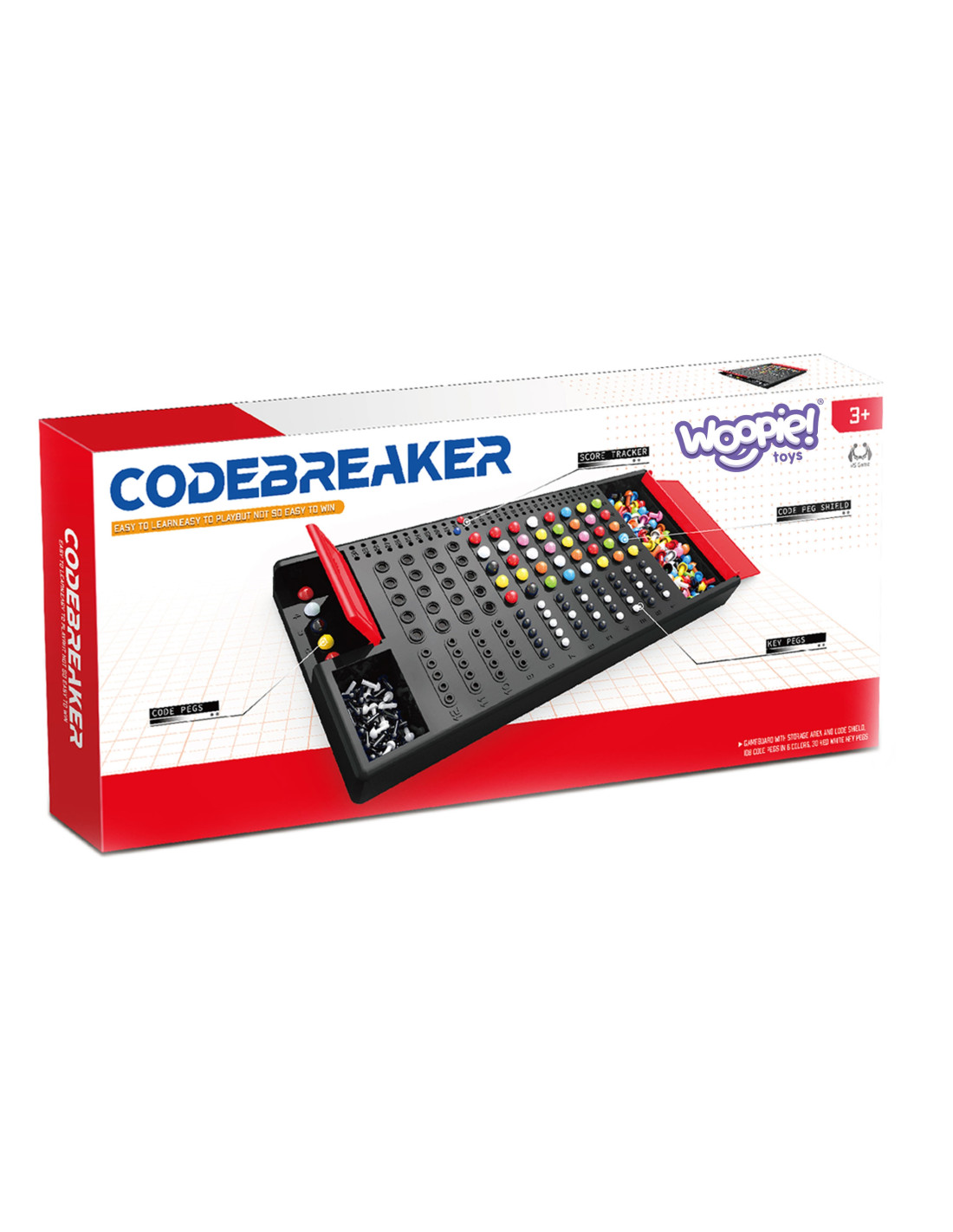 WOOPIE Codebreaker Logic Game was created by the renowned Woopie brand. It's a fun, competitive puzzle game that can be played by two players simultaneously . The game begins by establishing a color code. Players "write" the code with pieces on the side of the board. Players attempt to guess their opponent's code by presenting their answers using colored pieces. Matched colors are marked on the other side of the board with white and black pieces. The game develops logical thinking , memory, and color recognition .