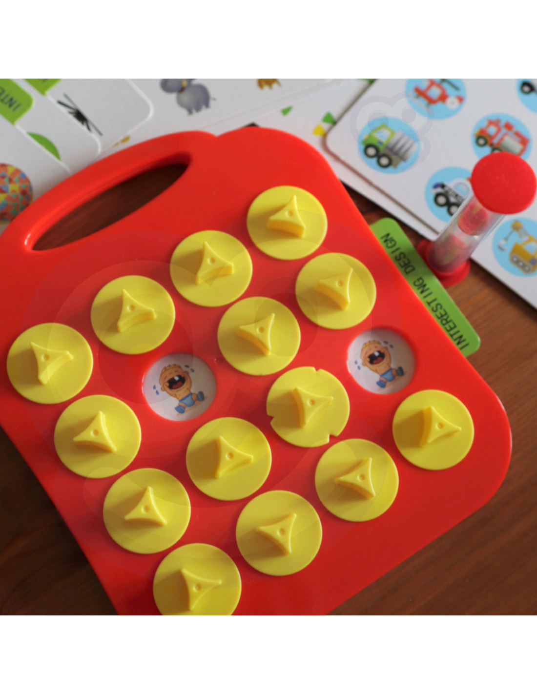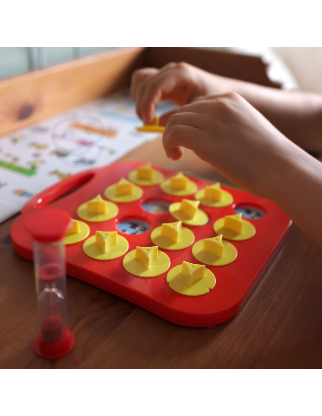 The Match Pairs game from WOOPIE is a great game that's both fun and memory-building! Simple rules : 16 holes are covered on the board, each with two matching pictures underneath. Each player must uncover a point for each pair – the player with the most pairs wins! The time for each round is marked by an hourglass; when the sand runs out, it's the end of the round. The game includes 10 themed cards to play with. I guarantee hours of fun!