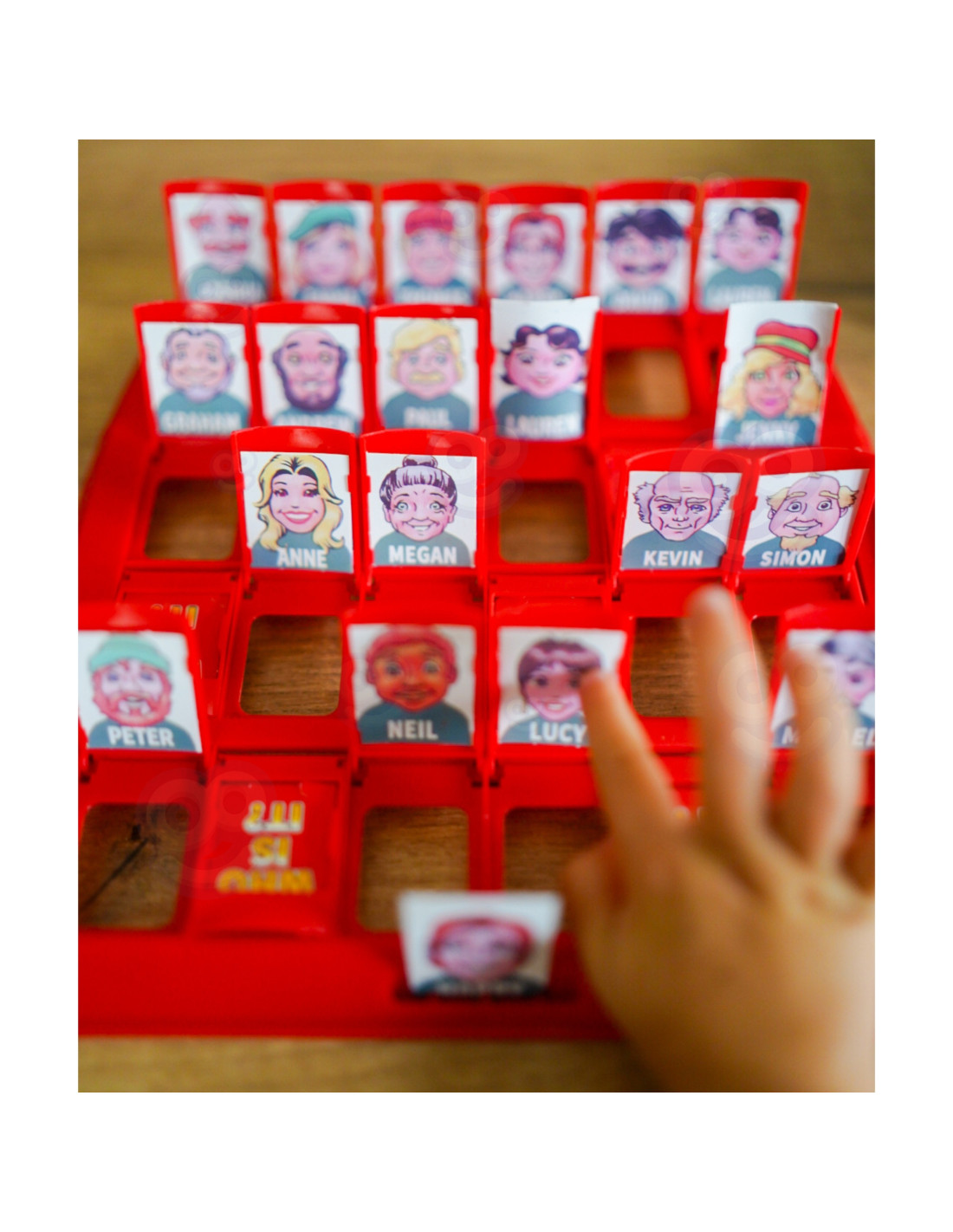Before you start playing for the first time, lay out the cards and look at all the characters, paying attention to details such as the shape of the nose, hairstyle, and grimace.