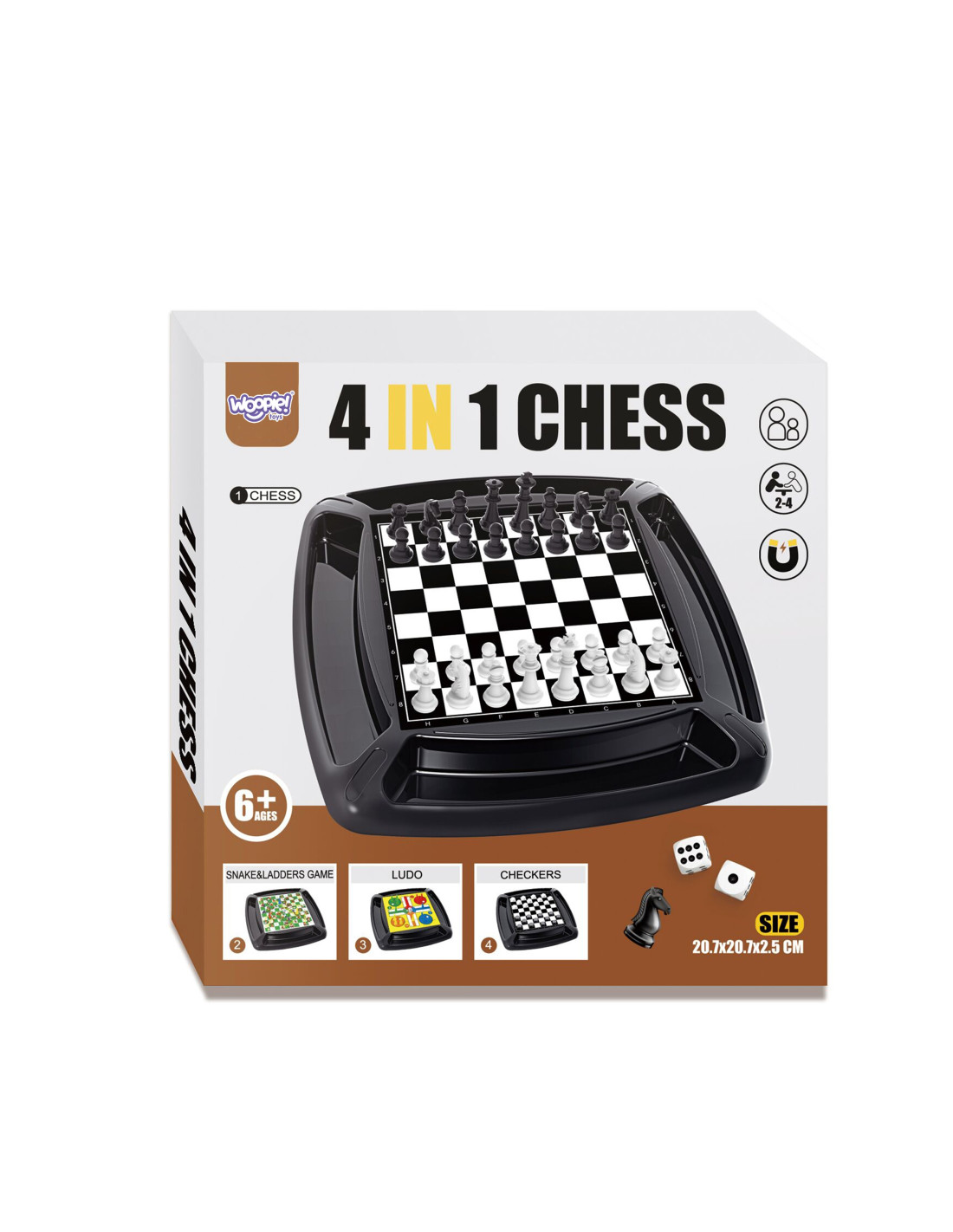 This fantastic board game set from WOOPIE is a product that will keep you entertained! Three boards, four different games – choose what you like. The boards are placed on a comfortable base, ensuring stability during play. Each side of the board features a recessed area where you can place your pawns.