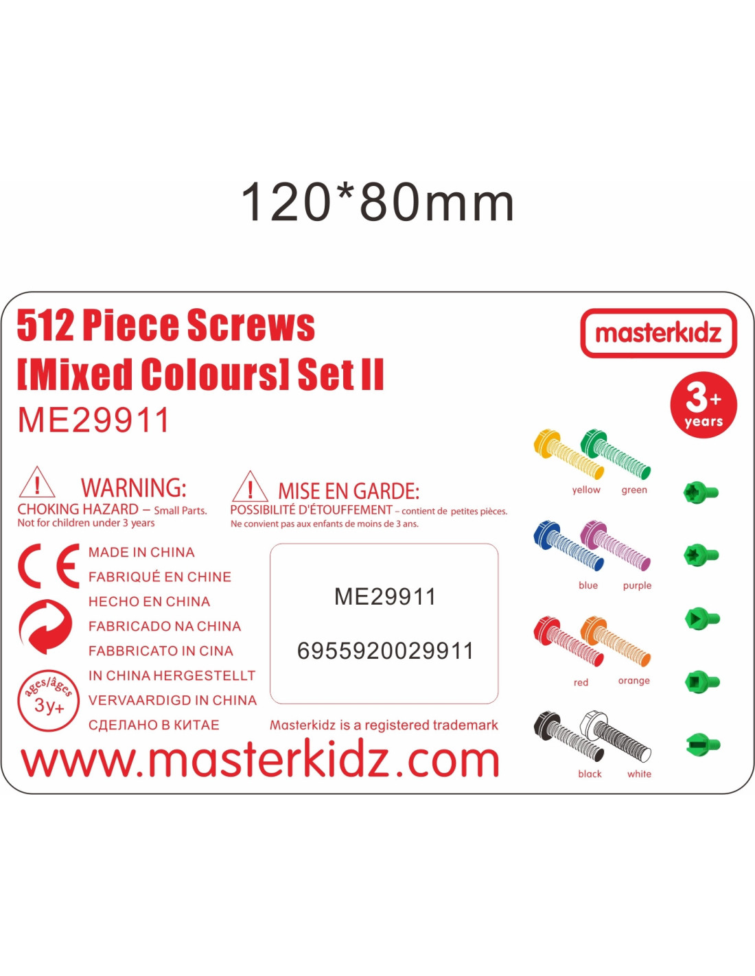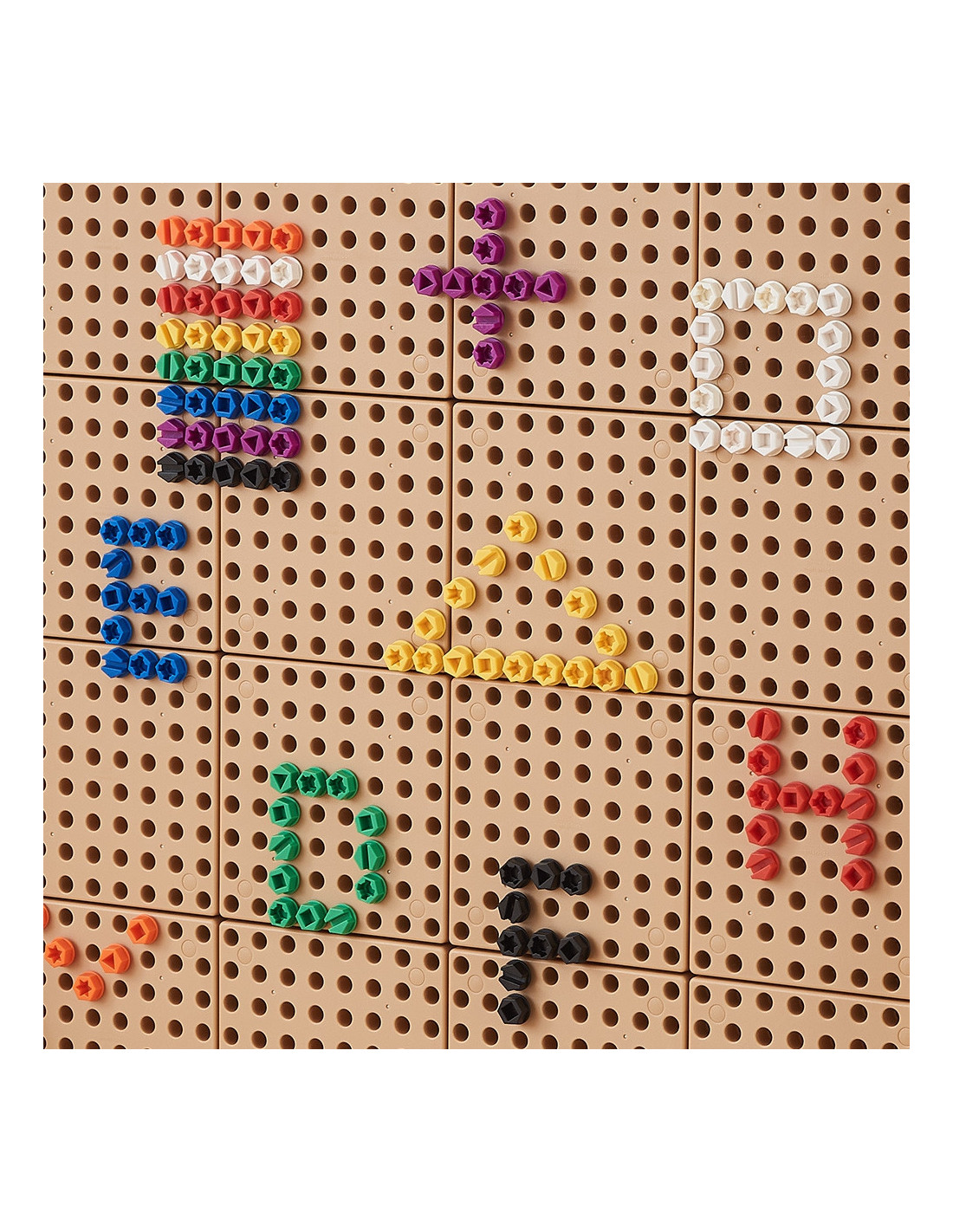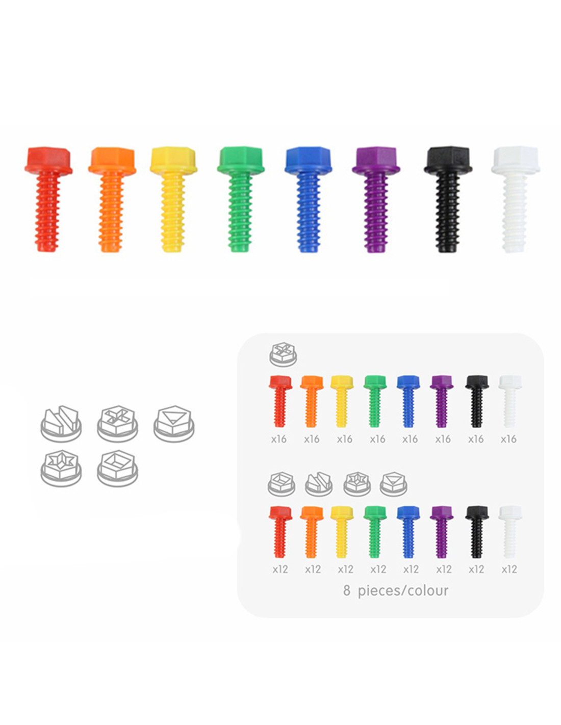 Colorful screws for screwing into the Masterkidz STEM wooden educational board are a great addition. Your child will not only be able to beautifully decorate their board and create amazing drawings, but thanks to special tools (purchased separately), they'll also learn to use hand tools and an electric screwdriver. This set includes five types of screws in eight colors with different recesses: 128 standard Phillips screws and an additional four types of screws, each with 96 recesses: flat, triangular, star, and square.