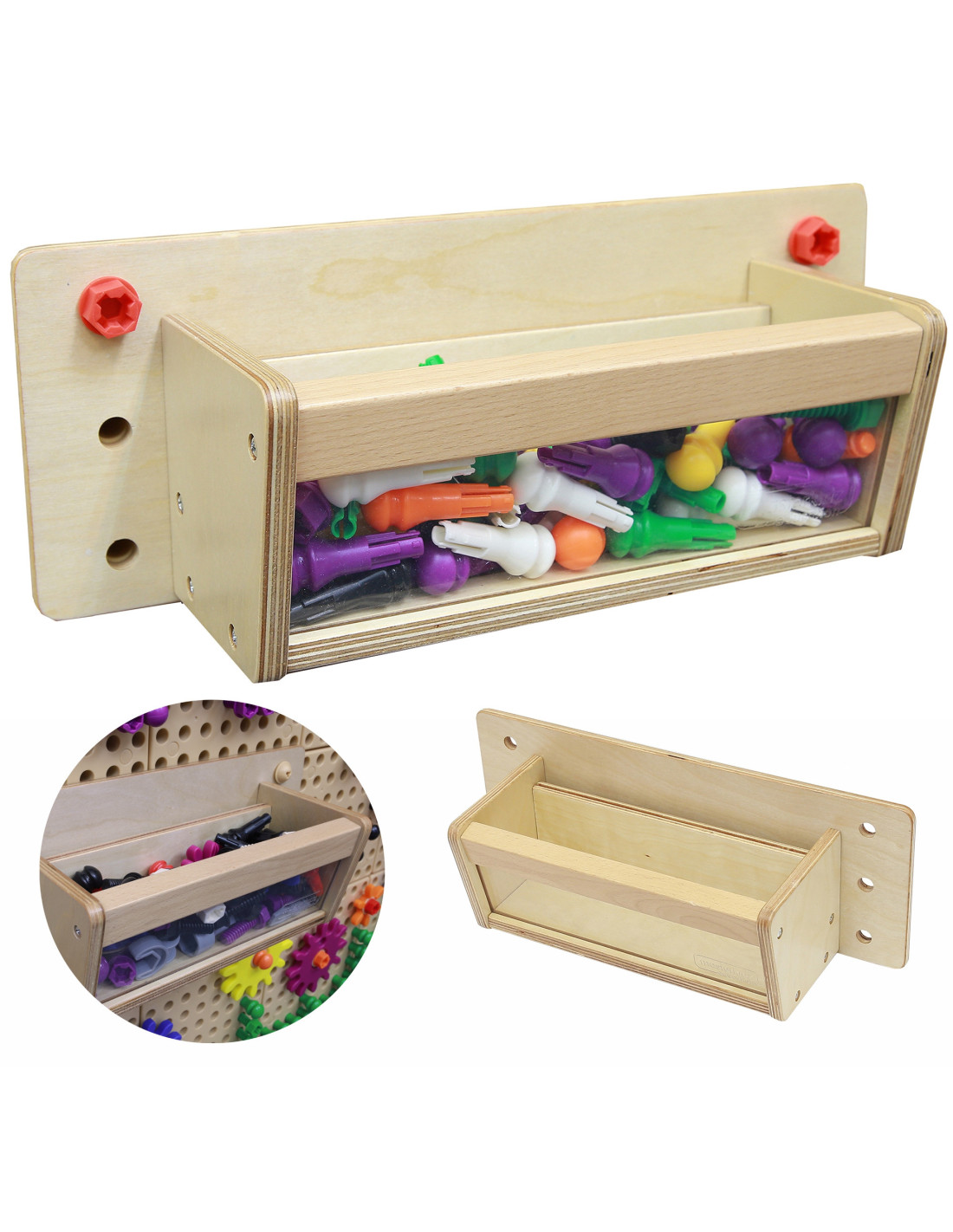 - - Masterkidz STEM boards can be filled with a variety of items, so to avoid clutter, it's worth stocking up on accessories that will help keep things organized. One such item is a wooden container with a transparent side.