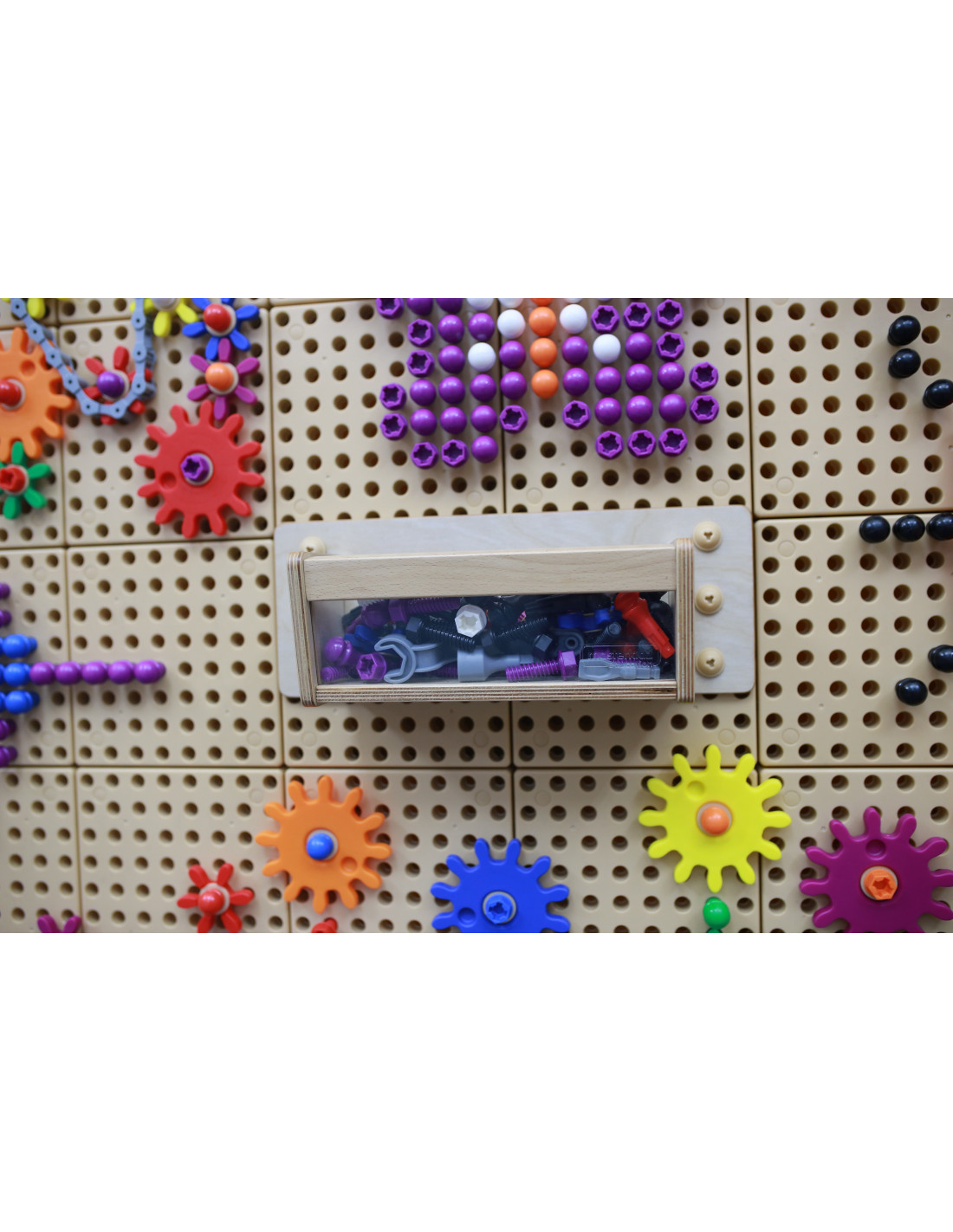 A container where you can store your current Masterkidz STEM board accessories, keeping them handy while creating new pictures. You can also store any Masterkidz pegs, screws, or strings in it, so you don't have to reach for the shelf with the containers each time.