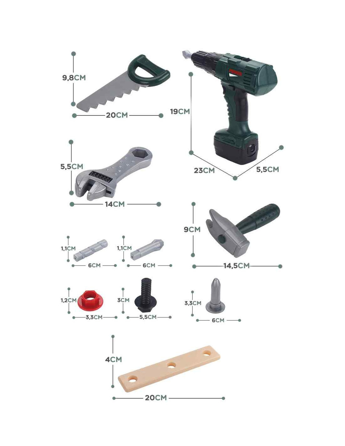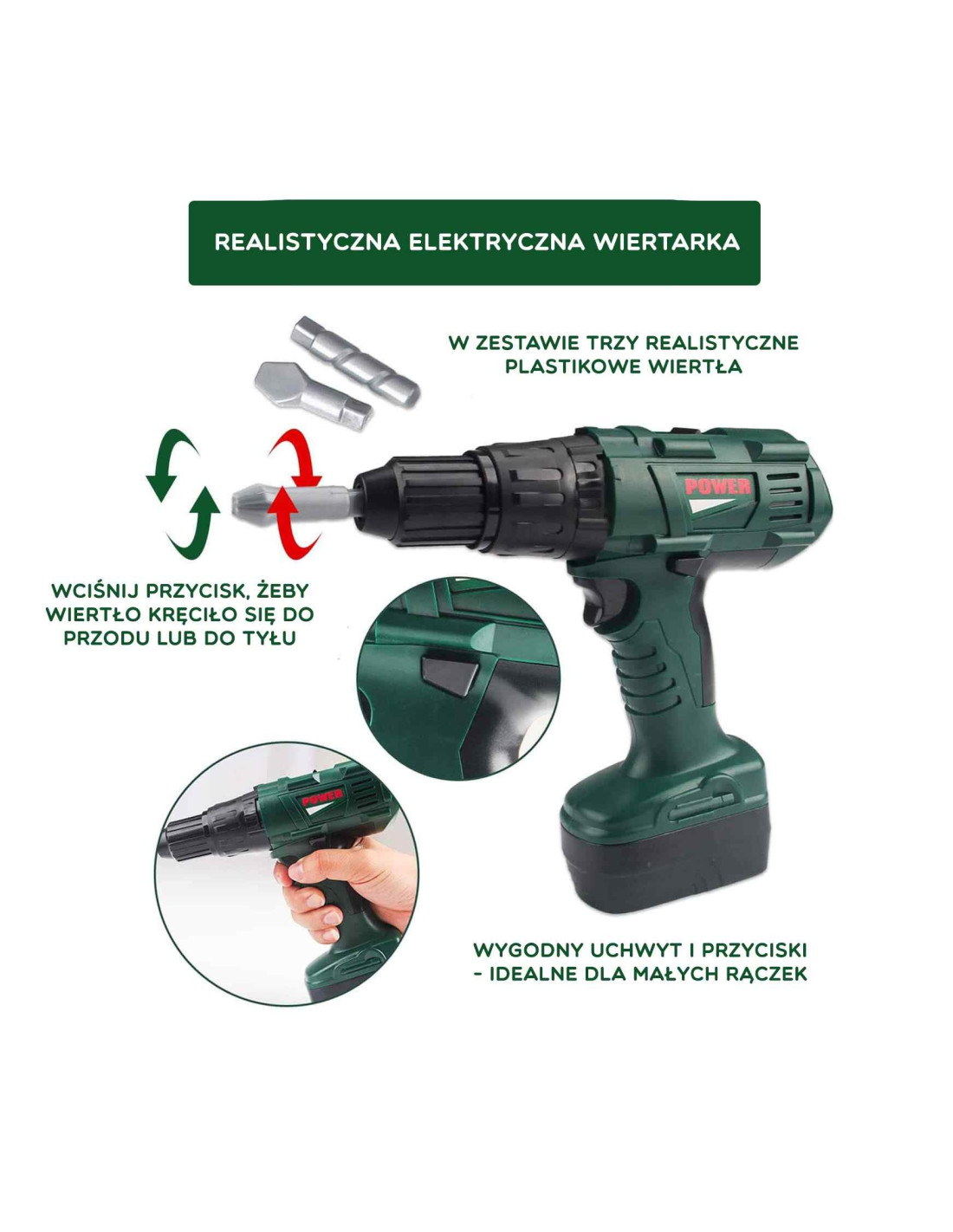 The toolbox with the screwdriver and drill was created by the company loved by children , WOOPIE The set includes dark green, spacious toolbox With comfortable, yellow handle and 15 elements . Among the tools, children will find cordless screwdriver-drill battery-powered with 3 interchangeable tips . The drill driver imitates the real device, thanks to sounds and a rotating screw . Additionally, the set includes a saw with a comfortable handle, a hammer, a wrench, two plastic boards with holes for screwing in screws (4 in set) or hammering nails (2 in a set). This set will provide great fun for any little DIY enthusiast while also helping develop manual skills.