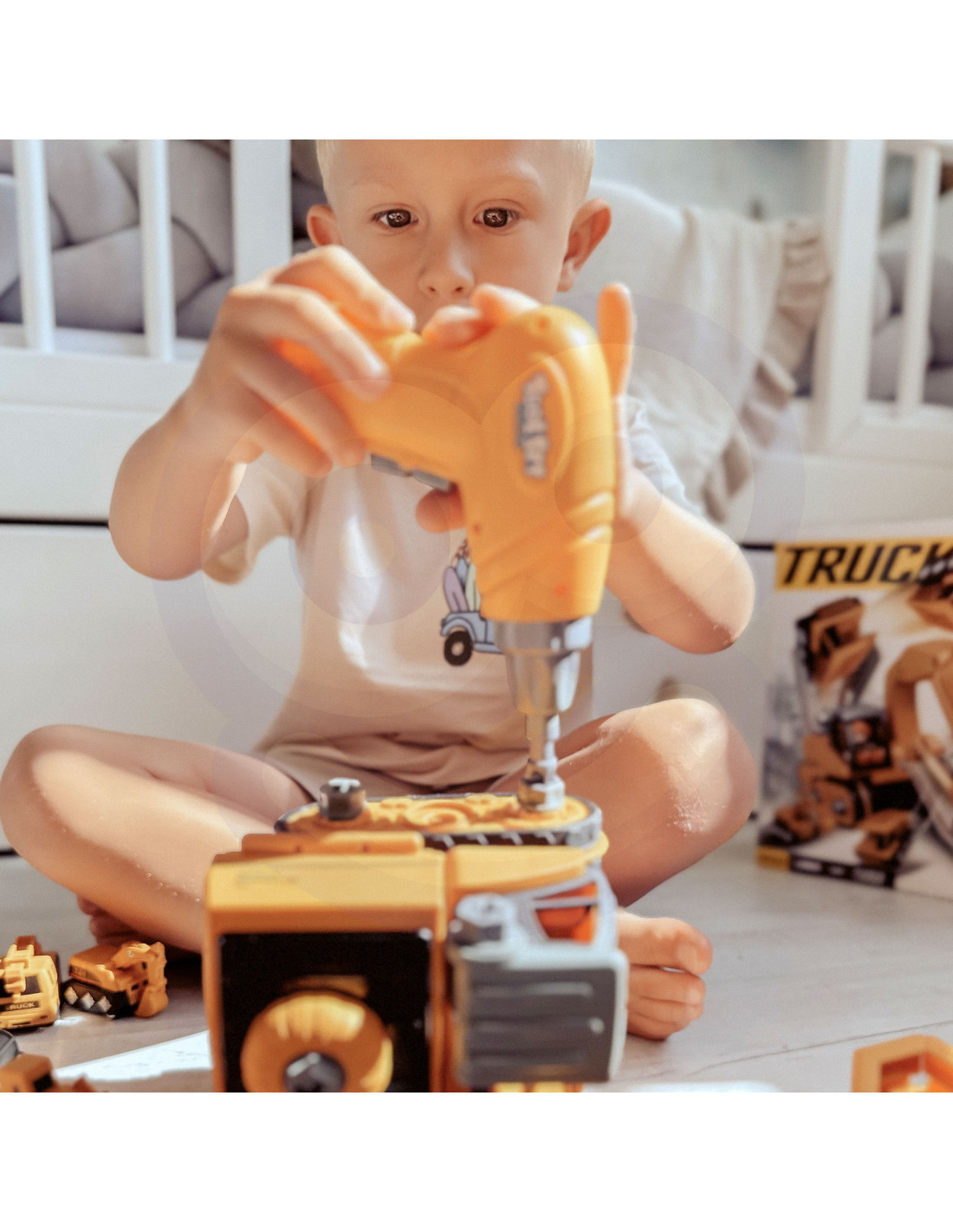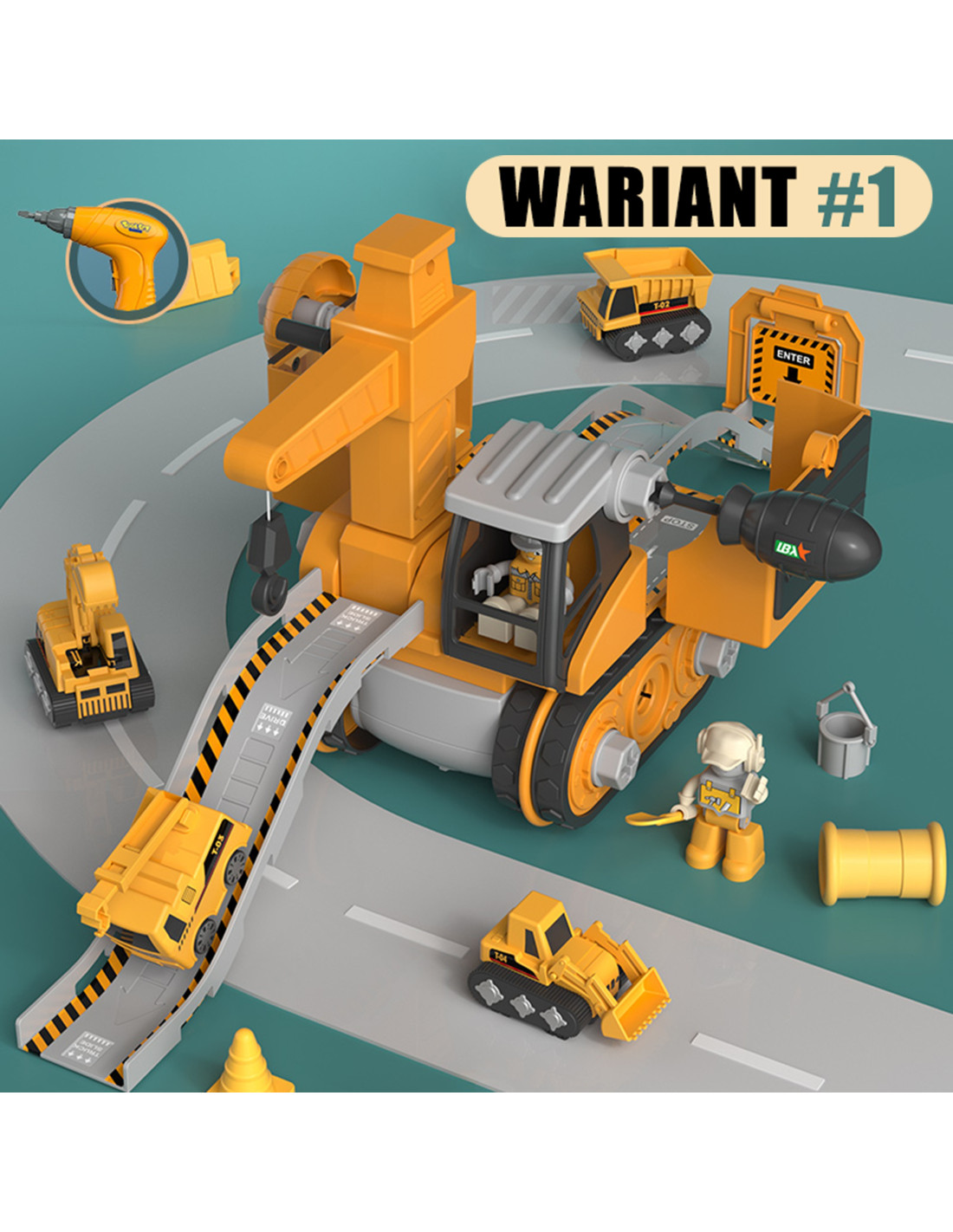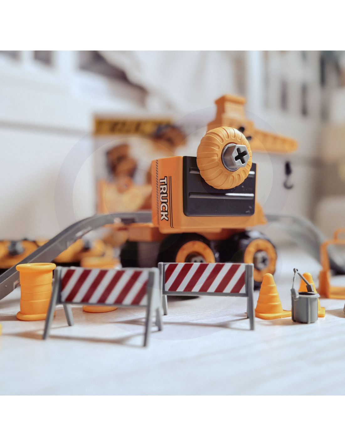 The Mega Construction Site 5-in-1 from WOOPIE is a complete set for every fan of extreme vehicles! The fun involves assembling one of five vehicle types using a drill or screwdriver, and then building with numerous accessories, including a construction worker figure, four mini vehicles, and rubble. The set is meticulously crafted down to the smallest detail, and most of the vehicle components are movable , such as the excavator's canopy. In "Construction Site with Track" mode, children can launch one of four mini vehicles from the launcher at the beginning of the track. Besides creativity and imagination , this toy also develops children's fine motor skills through twisting and turning. The set can be played with anywhere, even in the sandbox !