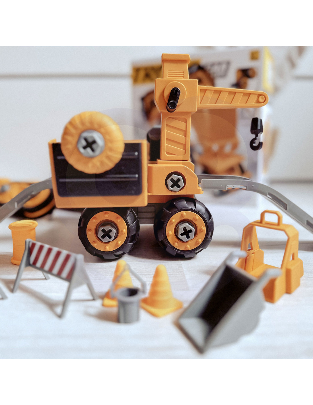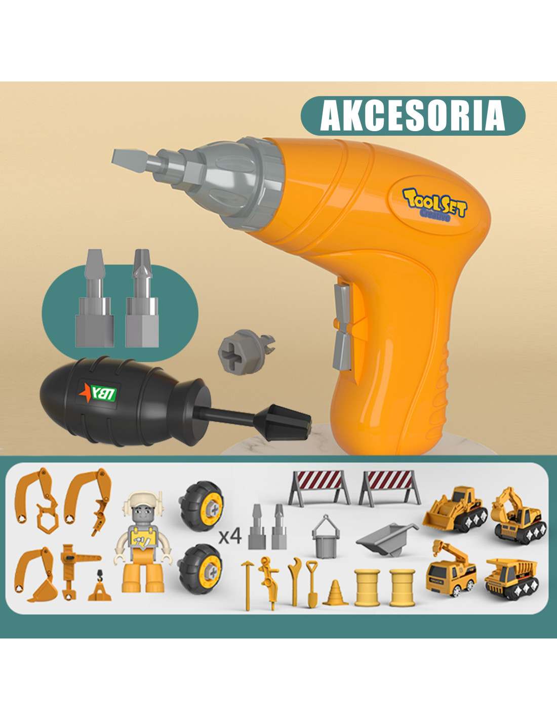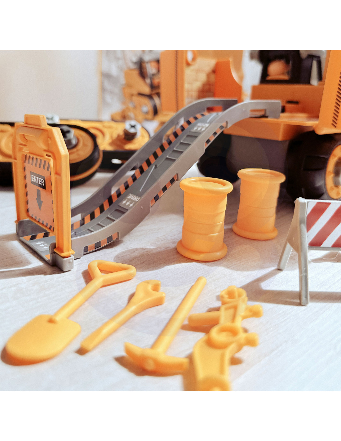 The Mega Construction Site 5-in-1 from WOOPIE is a complete set for every fan of extreme vehicles! The fun involves assembling one of five vehicle types using a drill or screwdriver, and then building with numerous accessories, including a construction worker figure, four mini vehicles, and rubble. The set is meticulously crafted down to the smallest detail, and most of the vehicle components are movable , such as the excavator's canopy. In "Construction Site with Track" mode, children can launch one of four mini vehicles from the launcher at the beginning of the track. Besides creativity and imagination , this toy also develops children's fine motor skills through twisting and turning. The set can be played with anywhere, even in the sandbox !