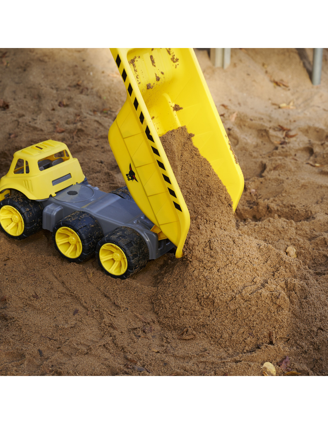 The Mega Dumper Power Worker from BIG is a toy for active kids. Designed with little hands in mind, this dump truck is bigger than ever and exceeds all expectations with its enormous dump bed. It can carry all kinds of cargo, whether it's sand, water, or other toys.