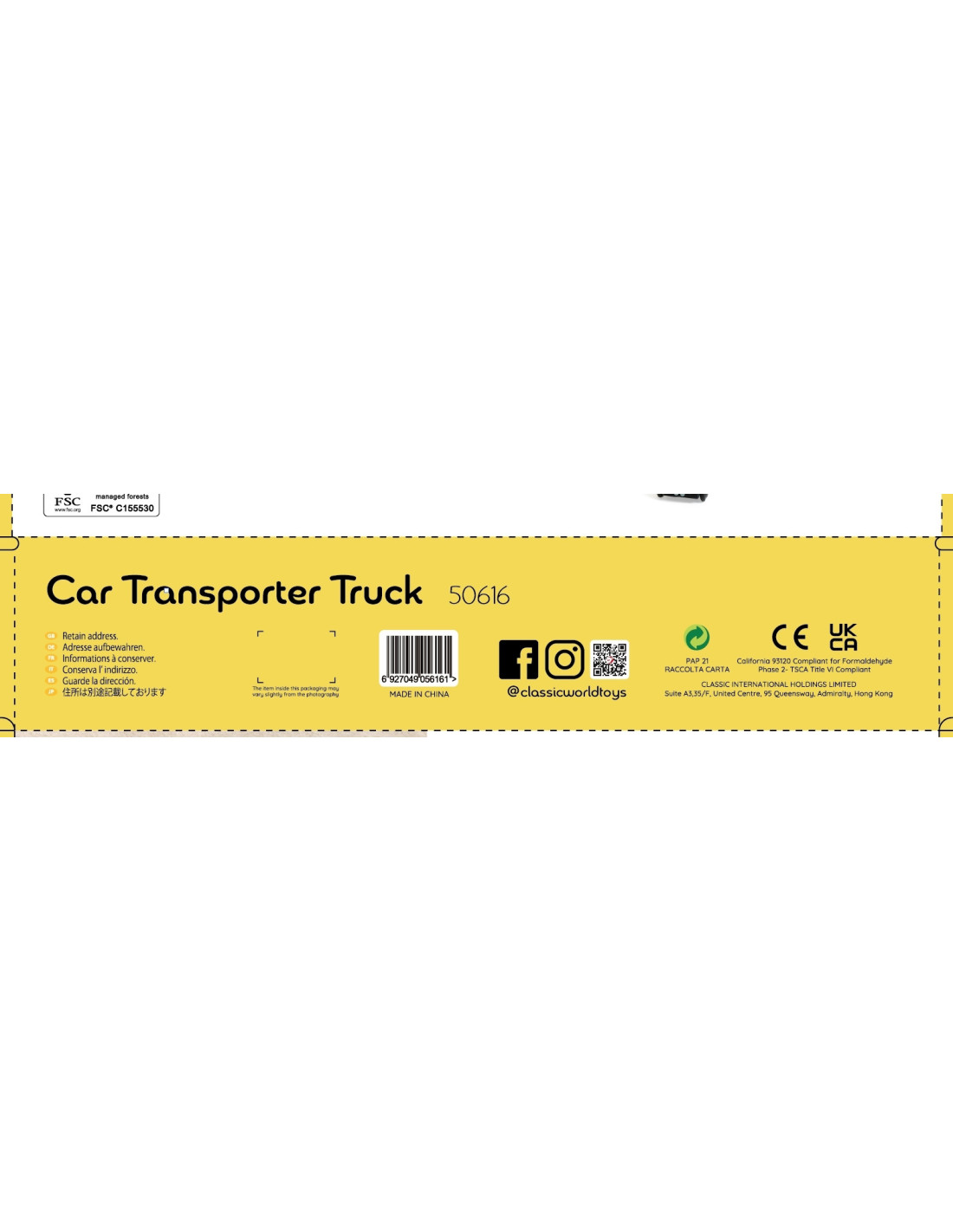 The Wooden Car Transporter from CLASSIC WORLD is a durable and high-quality toy set that includes one truck, a ramp with a flatbed, and three vehicles. This toy helps children develop fine motor skills and hand-eye coordination while providing hours of fun loading and unloading.