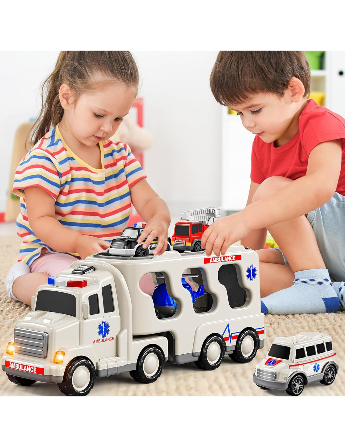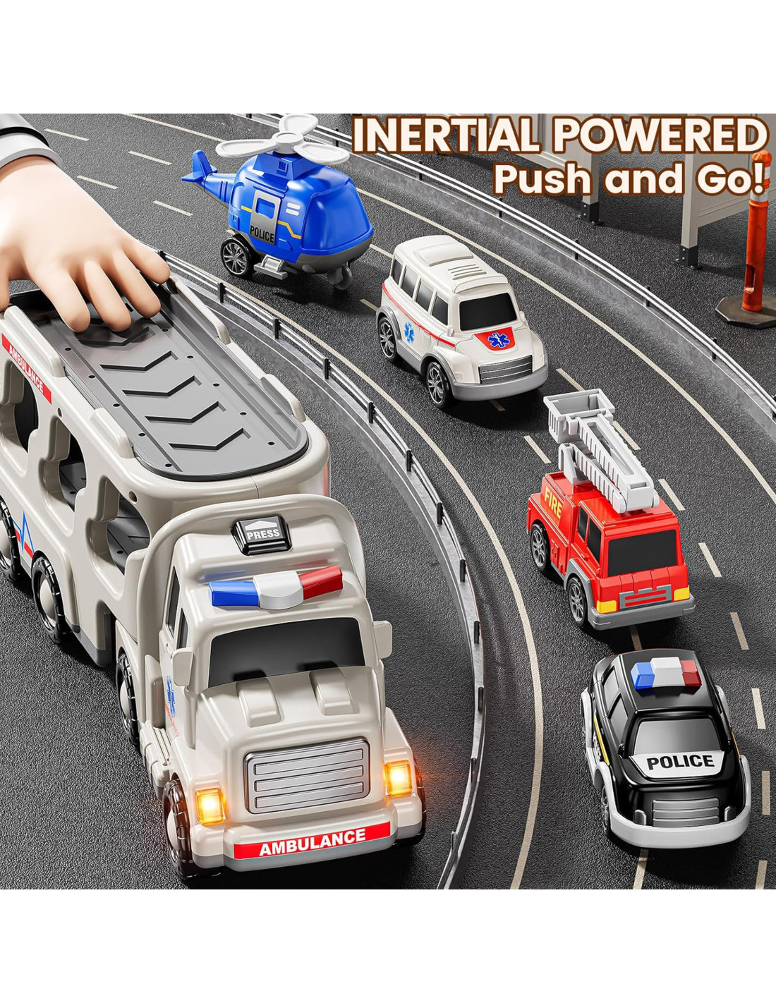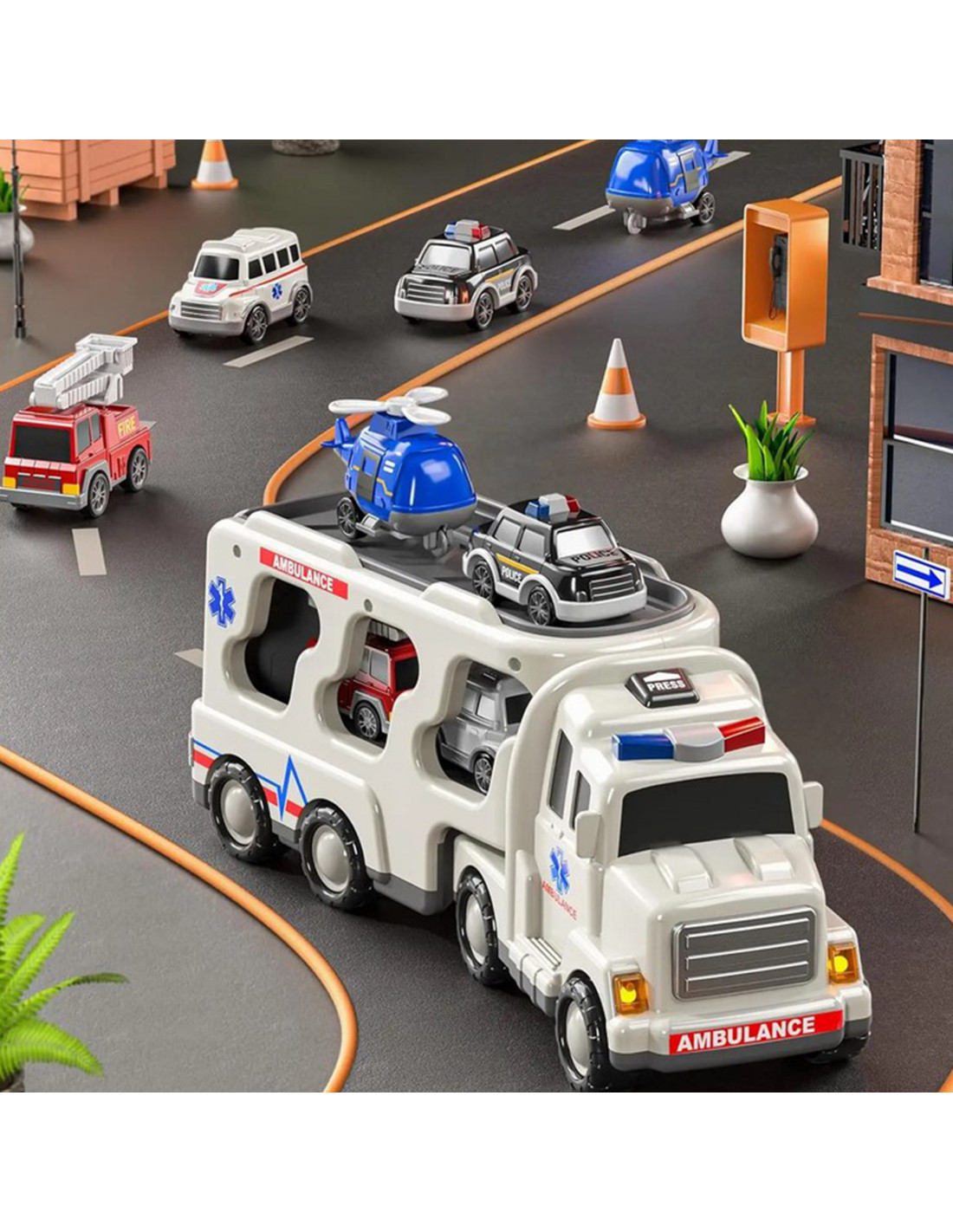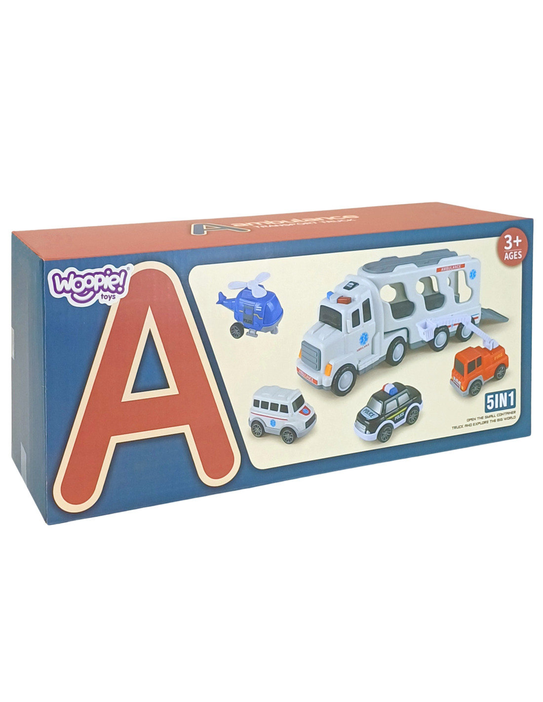 Woopie Large Rescue Truck + 4 Cars Set. Designed with young fire , police, and ambulance enthusiasts in mind, this 5-in-1 toy is the perfect set for any little rescuer! Press the button on top of the truck cab to see bright flashing lights and hear realistic sirens , very appealing to children . The set includes a large transport truck and four rescue vehicles: a fire truck, a police car, a police helicopter, and an ambulance. Each vehicle has movable parts that will let your child feel like a real hero during rescue operations! The set makes a great gift for a birthday, holiday, or any other occasion.