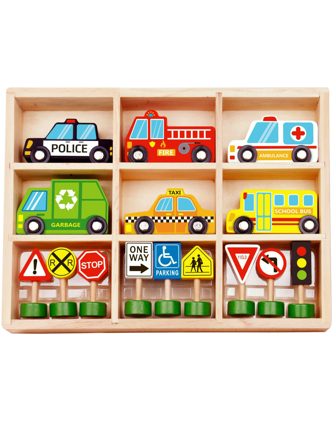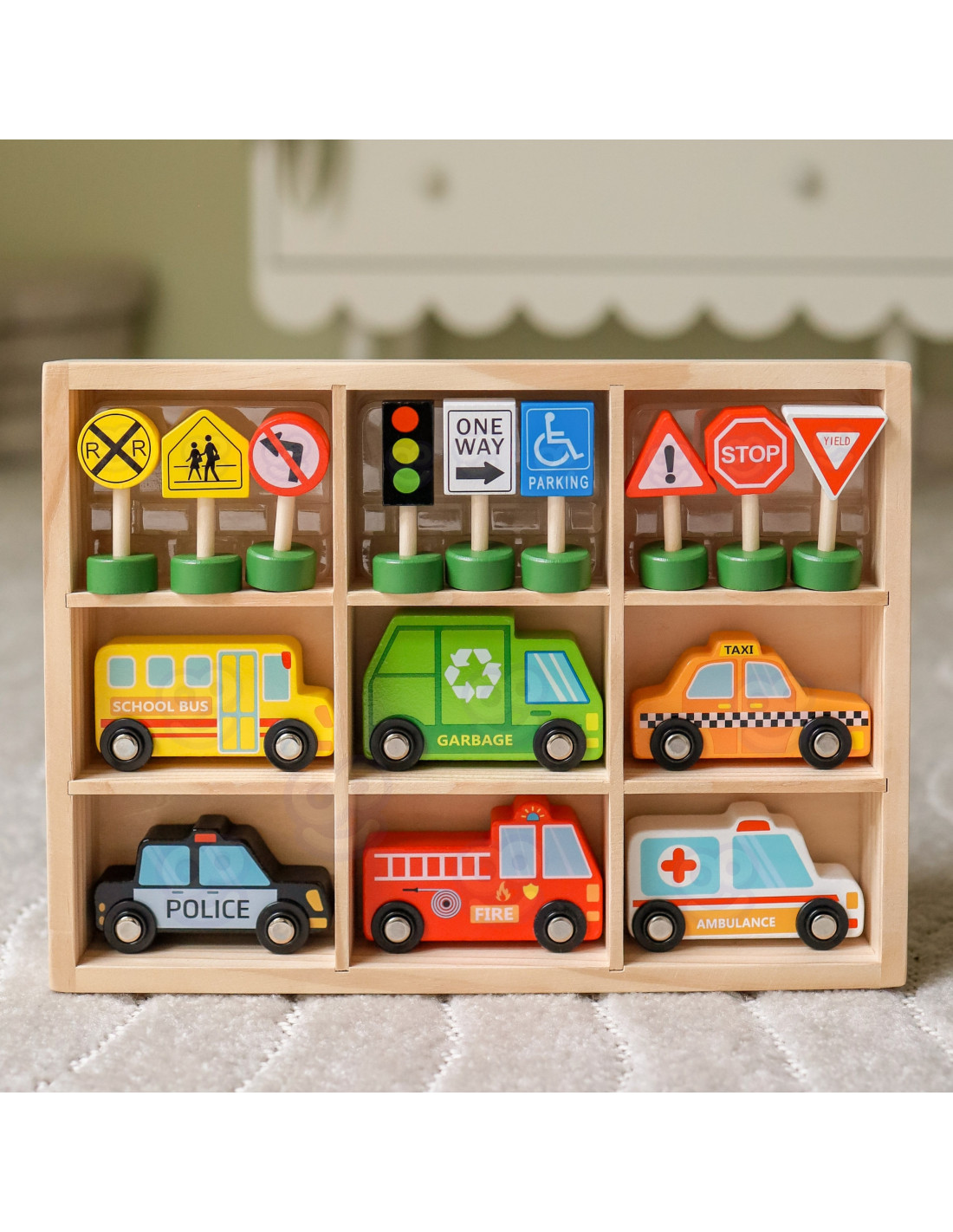 This wooden set from Woopie Green is an excellent educational tool that introduces children to traffic rules through play. The set includes 6 colorful vehicles and 9 road signs that help toddlers learn basic road safety rules. The entire set is made of durable wood and safe, non-toxic paints .