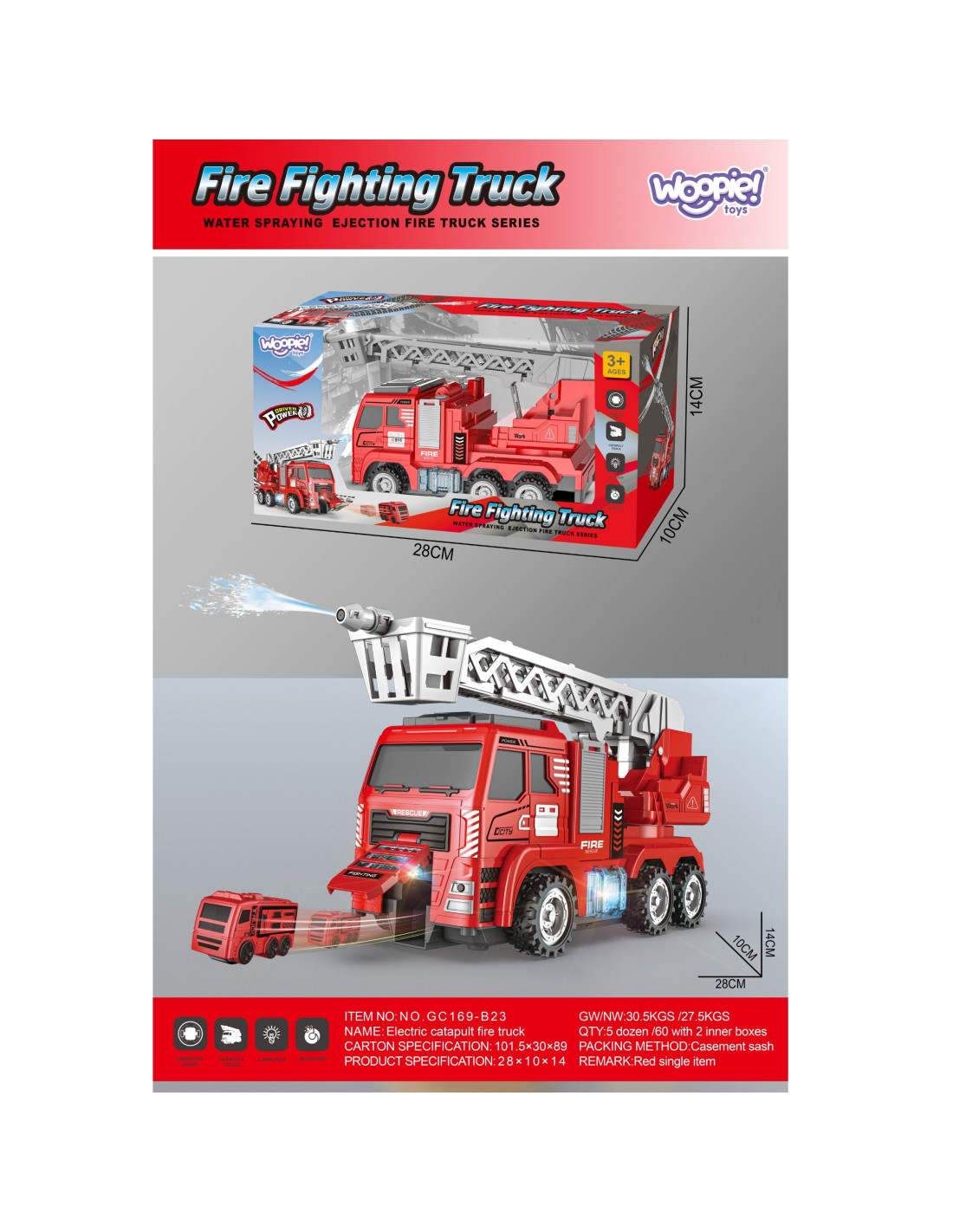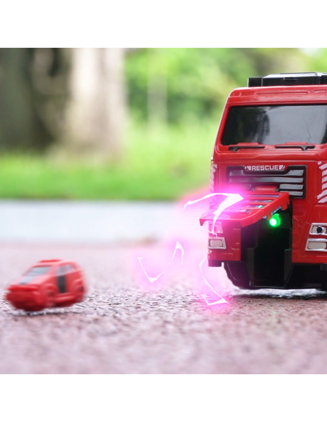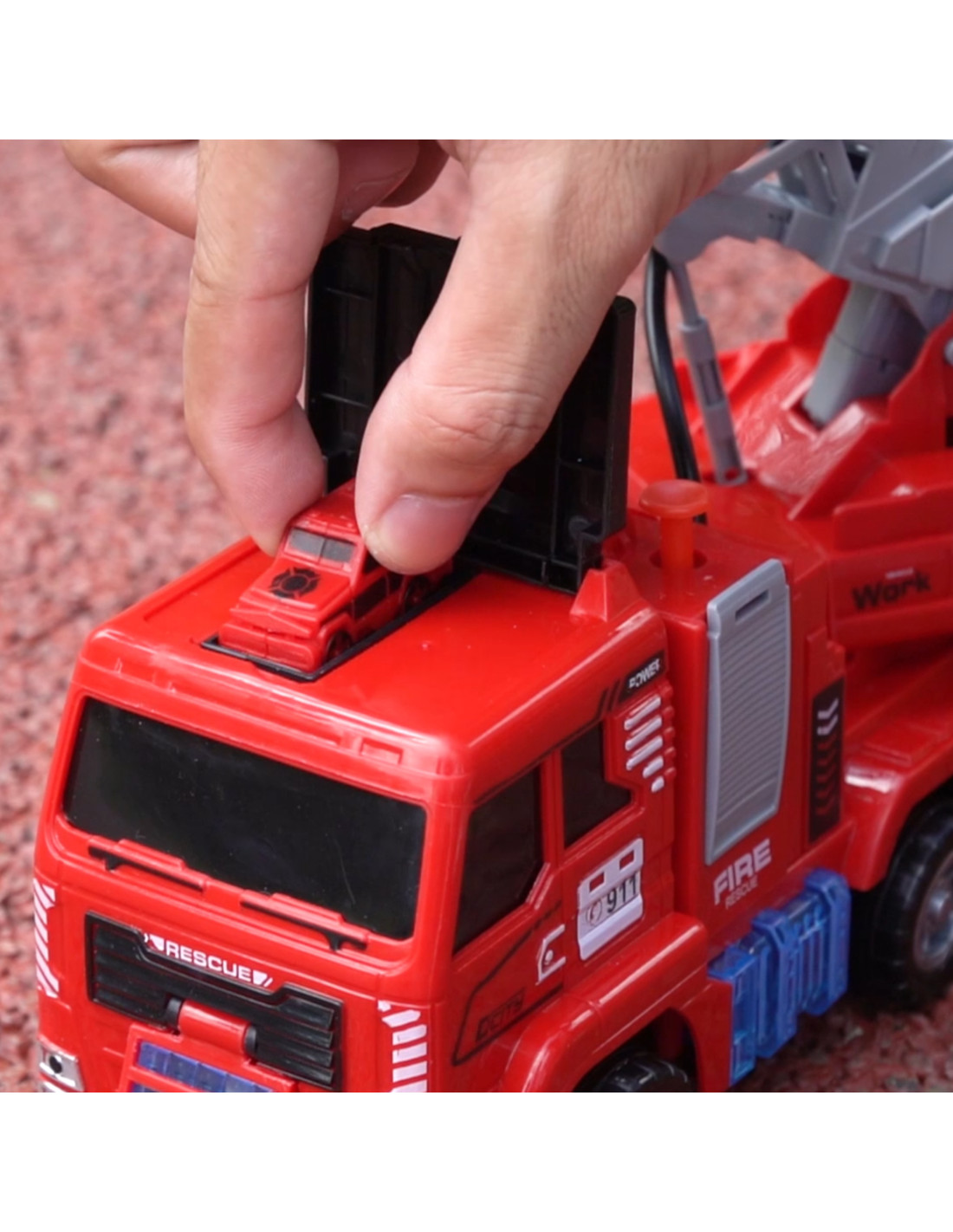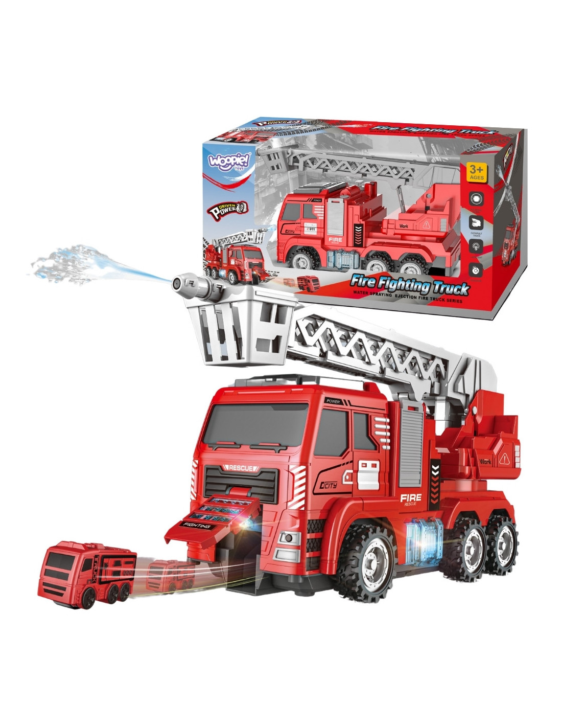 This self-driving fire truck is a perfect toy that will make any little emergency vehicle enthusiast feel like a true hero. The toy was designed with attention to the smallest details, faithfully replicating a real fire truck. The model is equipped with an extending ladder and a water cannon. When activated, the vehicle begins to drive across the floor, swinging the ladder and water cannon sideways, occasionally firing mini fire trucks from the front of the vehicle.