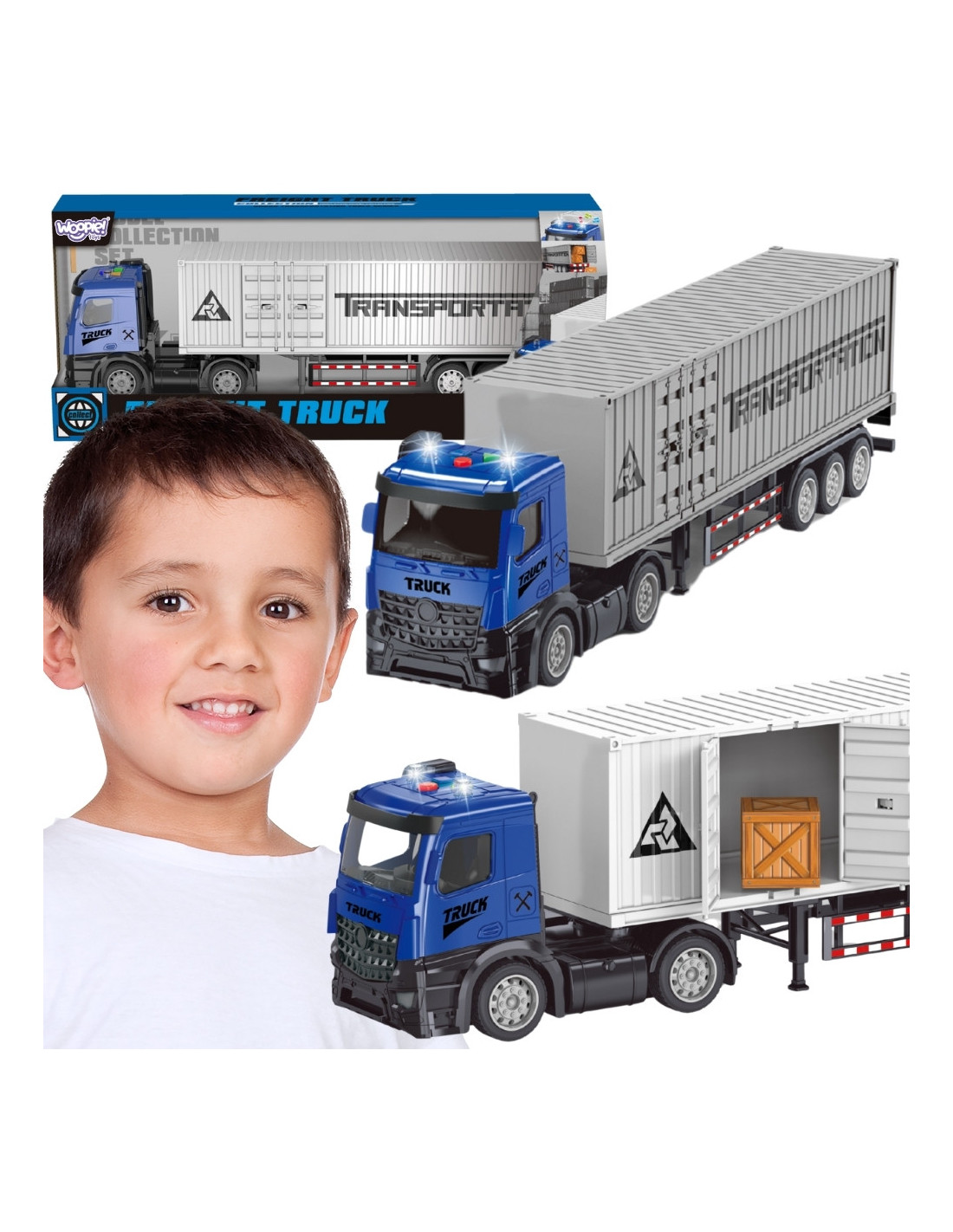 The Woopie Freight Truck with a container provides hours of exciting play, combining realism with functionality. Light and sound effects let children feel like real transport drivers. The inertial drive (pull-back) allows for dynamic driving, while the opening container and loading boxes allow for realistic scenarios. It's not just a toy, but also a tool that supports the development of children's motor skills, imagination, and creativity!