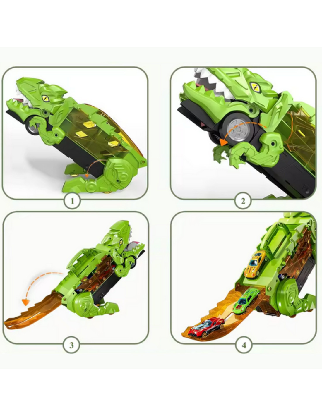 Immerse yourself in the fascinating world of prehistoric adventures and automotive fun! This amazing Dinosaur Eater with cars from Woopie is a real treat for every little fan of vehicles and prehistoric creatures. The dinosaur truck not only holds a whole set of cars inside, but also functions as an interactive slide and serves as a convenient suitcase with a handle . When unfolded, the toy transforms into racetracks on which the included cars can race. The set includes 12 small vehicles , so the fun can last for hours – solo or with friends! Movable elements, such as the opening mouth, dinosaur paws, and lowering ramp , add an extra dimension of interactivity, while developing children's manual skills and imagination. The entire set is made of durable, safe material that withstands intense play. Thanks to its foldable design and comfortable handle, the set is perfect for both home and travel. This is the perfect toy for kids who love vehicles, dinosaurs, creative construction, and dynamic gameplay. This set is sure to become a favorite in any child's collection!