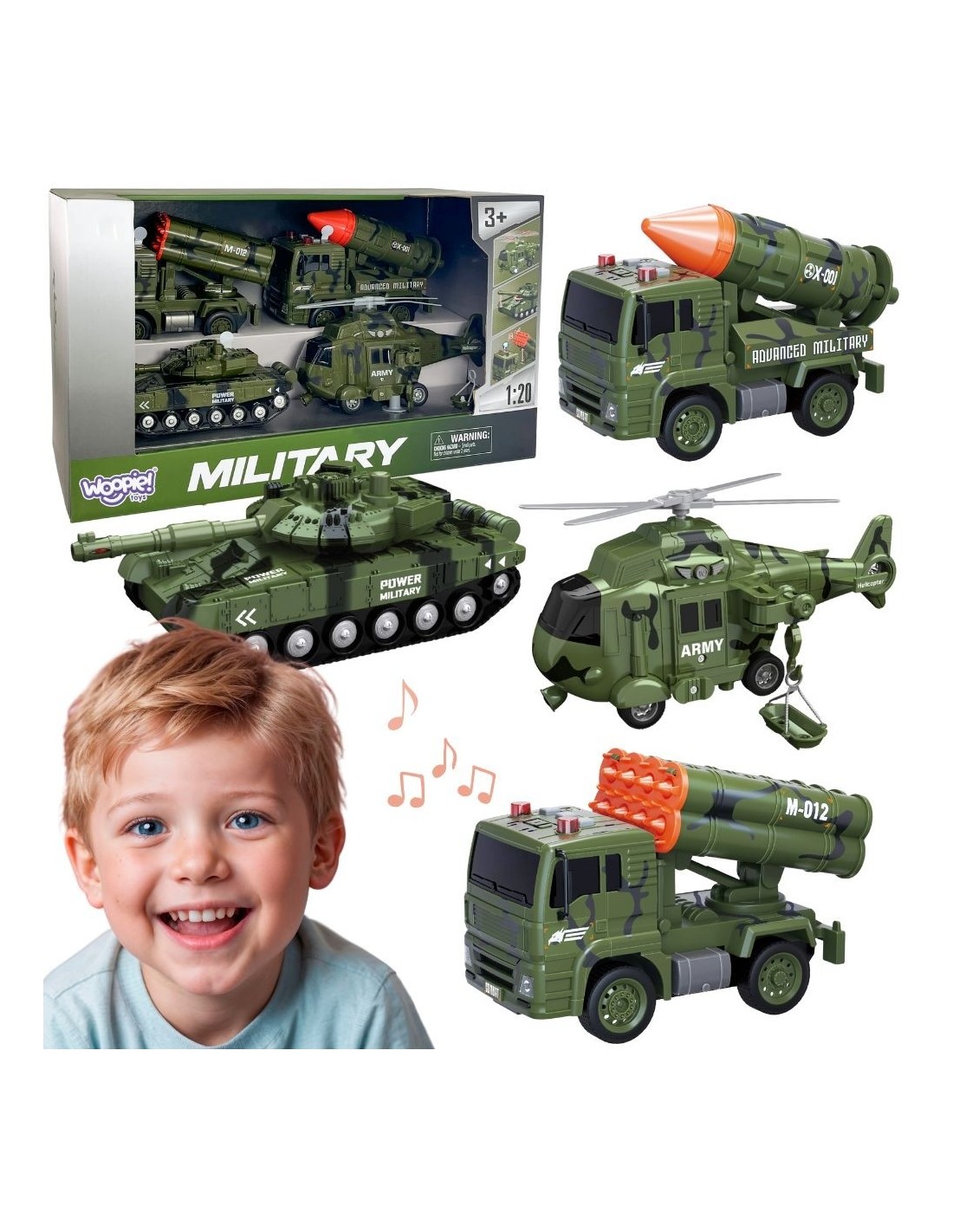 Kompletny zestaw wojskowych pojazdów armijnych od marki Woopie to idealna propozycja dla każdego małego fana militariów i akcji! Ten 4-częściowy zestaw wysokiej jakości zawiera realistyczne modele maszyn, takie jak czołg, helikopter oraz dwie potężne ciężarówki z wyrzutniami rakiet. Ciężarówki zostały wyposażone w efekty świetlne i dźwiękowe, co sprawia, że zabawa staje się niezwykle dynamiczna i wciągająca. Helikopter posiada ruchome śmigła oraz hak ratunkowy, inspirując do odgrywania misji ratunkowych. Zestaw rozwija wyobraźnię, kreatywność i doskonale nadaje się do zabawy w grupie. Zabawka przeznaczona dla dzieci od 3 roku życia.