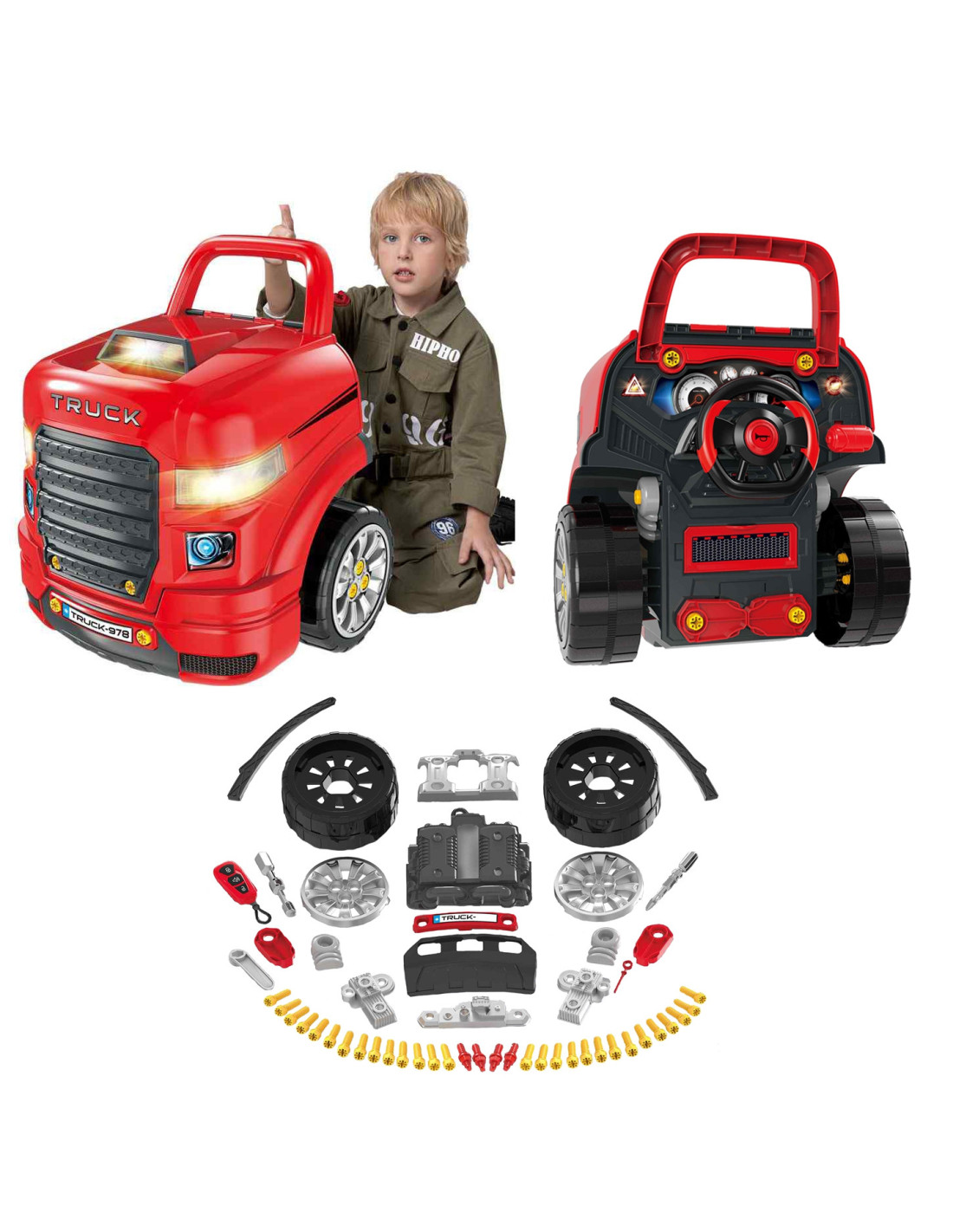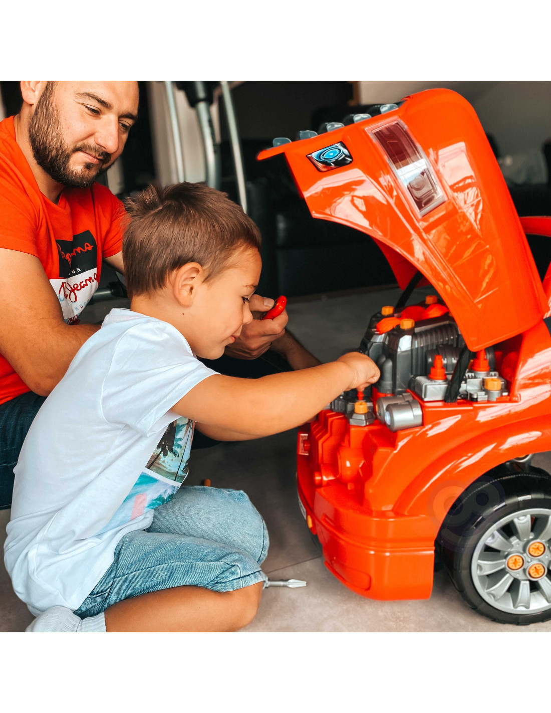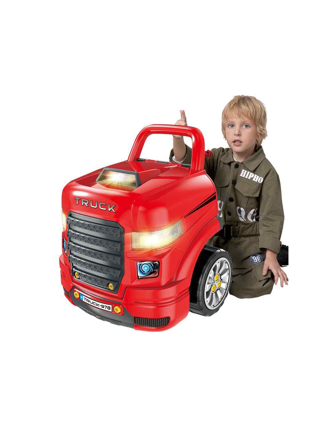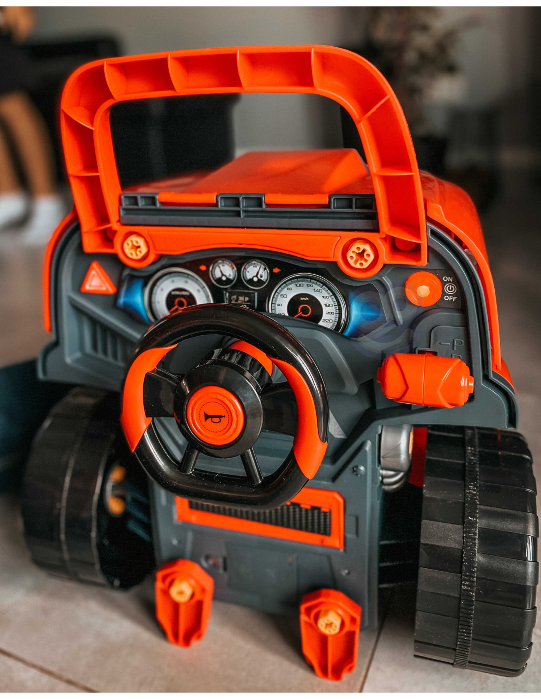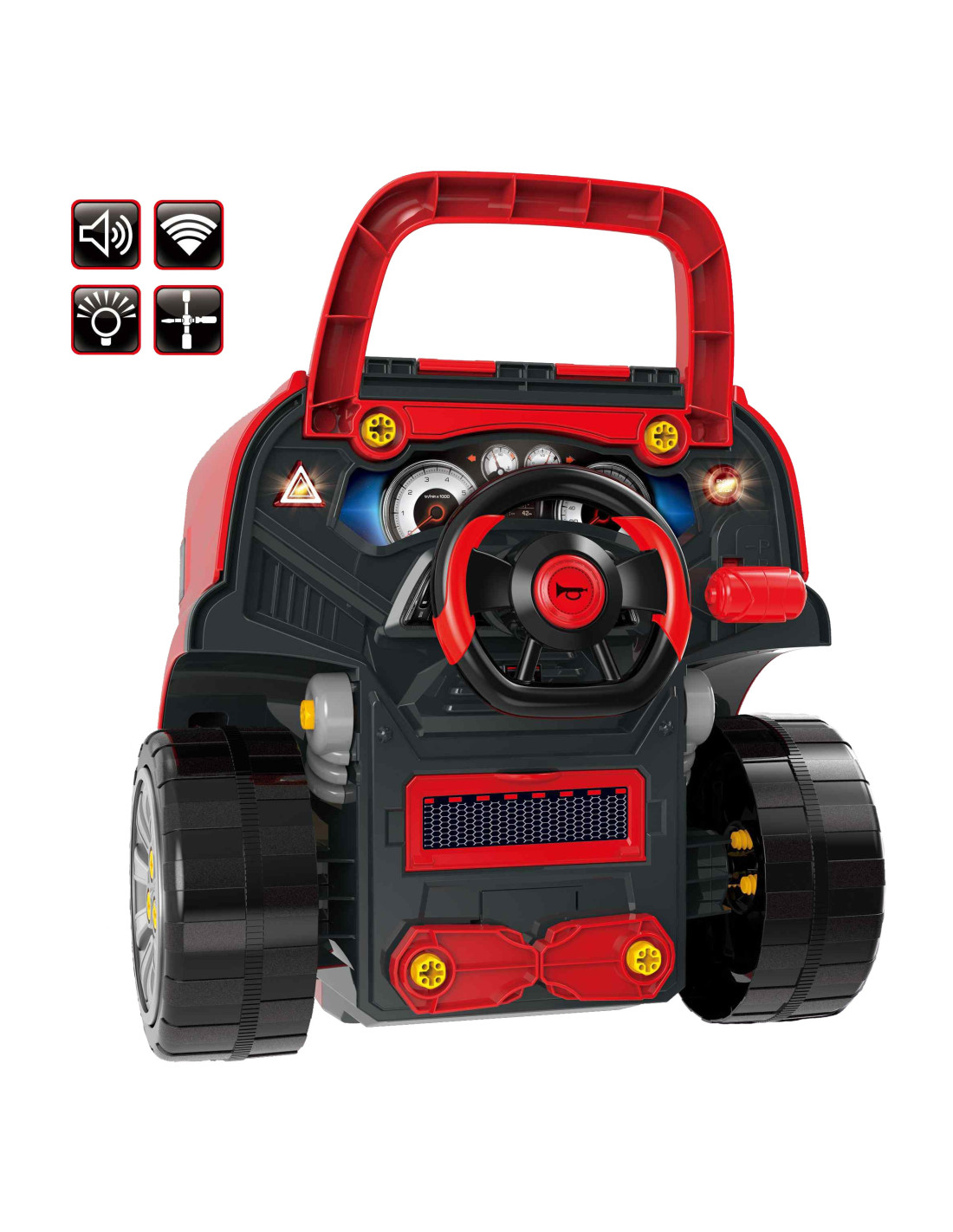 This toy imitates the front of a WOOPIE truck with a lifting hood, steering wheel, and dashboard. Open the storage compartment under the steering wheel to reveal a wealth of tools, knobs, and screws. The young mechanic can perform numerous repairs and maintenance on their vehicle (e.g., wheels, fenders, engine, spark plugs, and radiator grille). The toy is equipped with a sound module (engine sounds and a horn) and a light module (headlights). Additionally, the set includes a remote control to control the modules. The wheels can be removed using the included jack. This is undoubtedly a one-of-a-kind set, offering countless play possibilities.