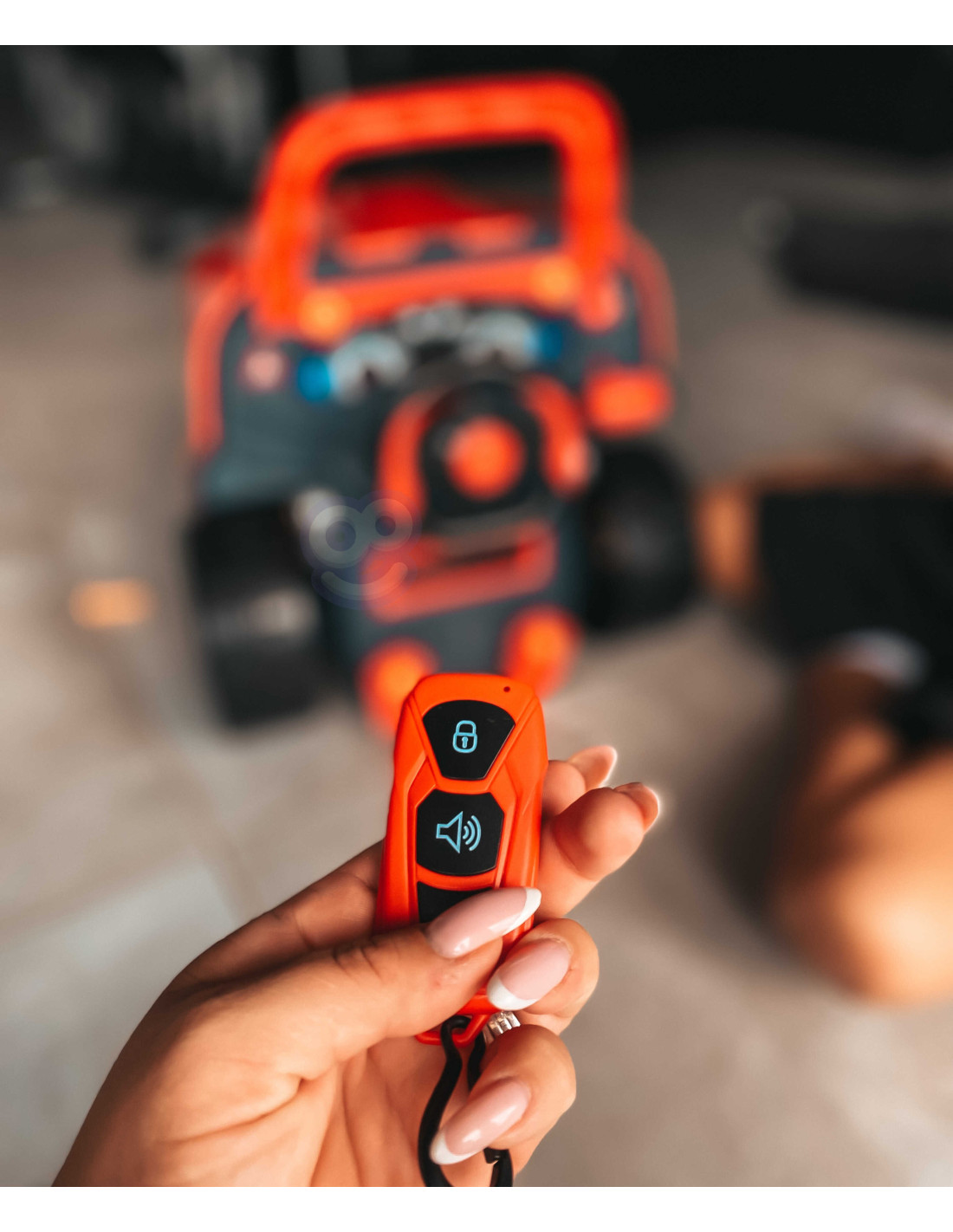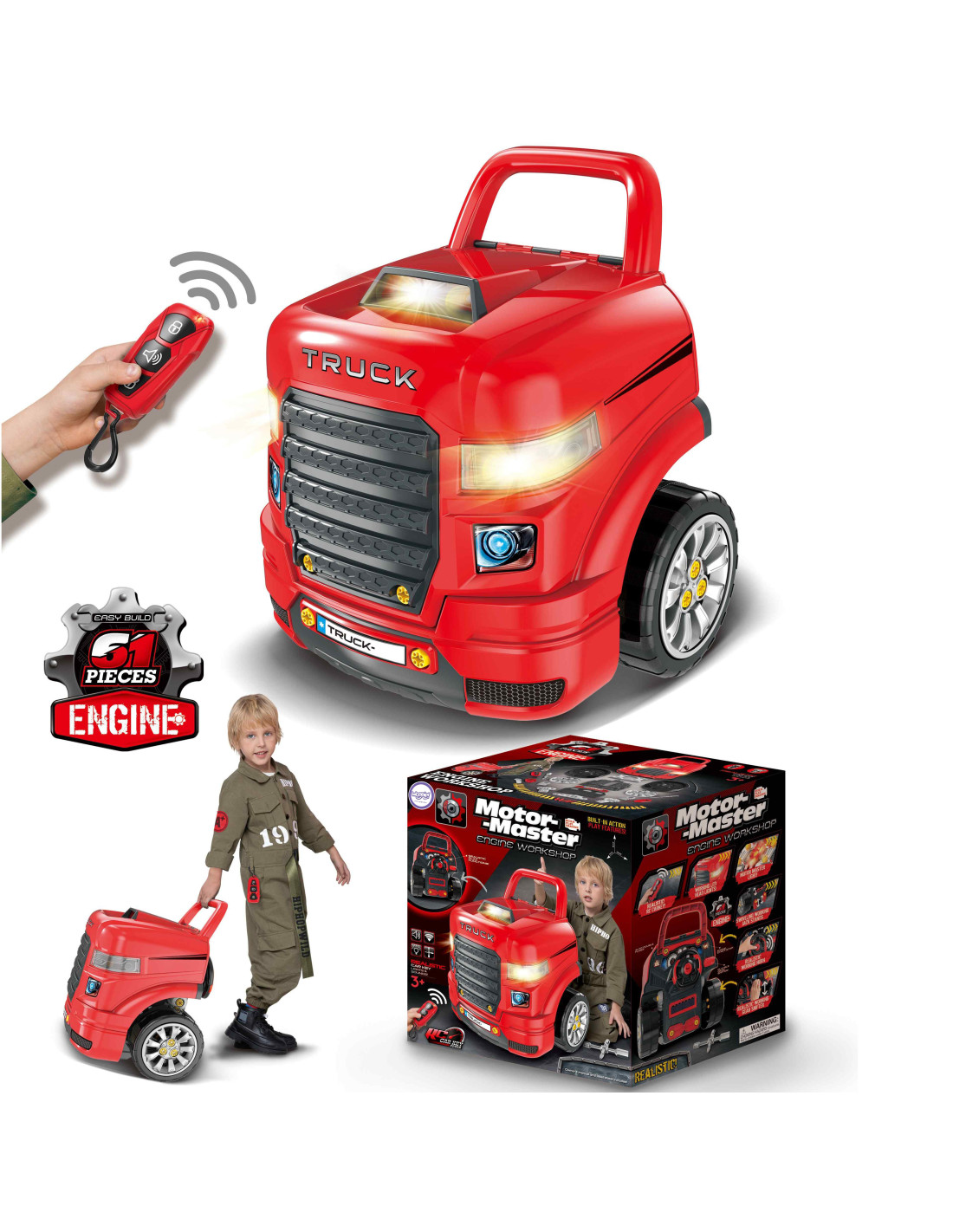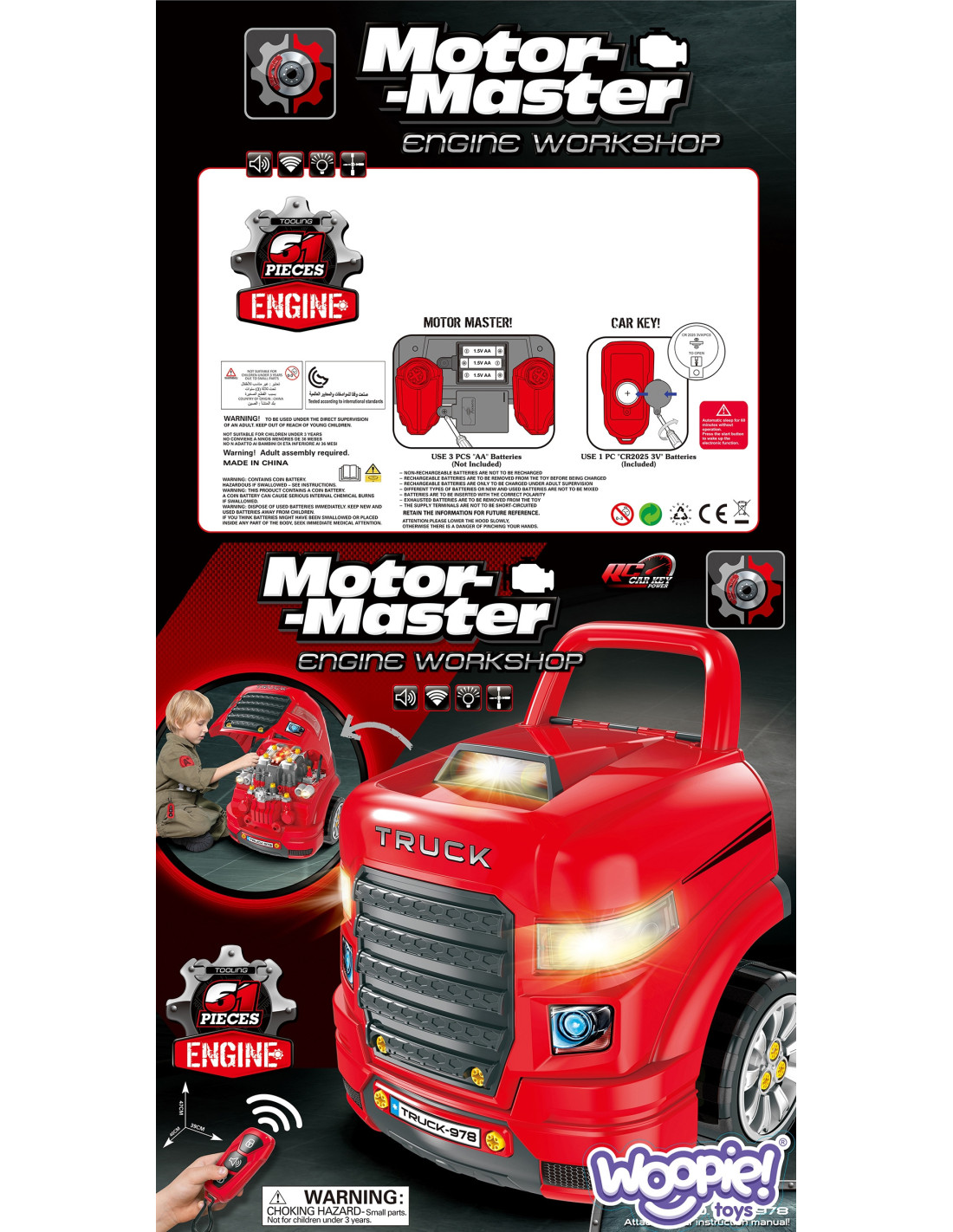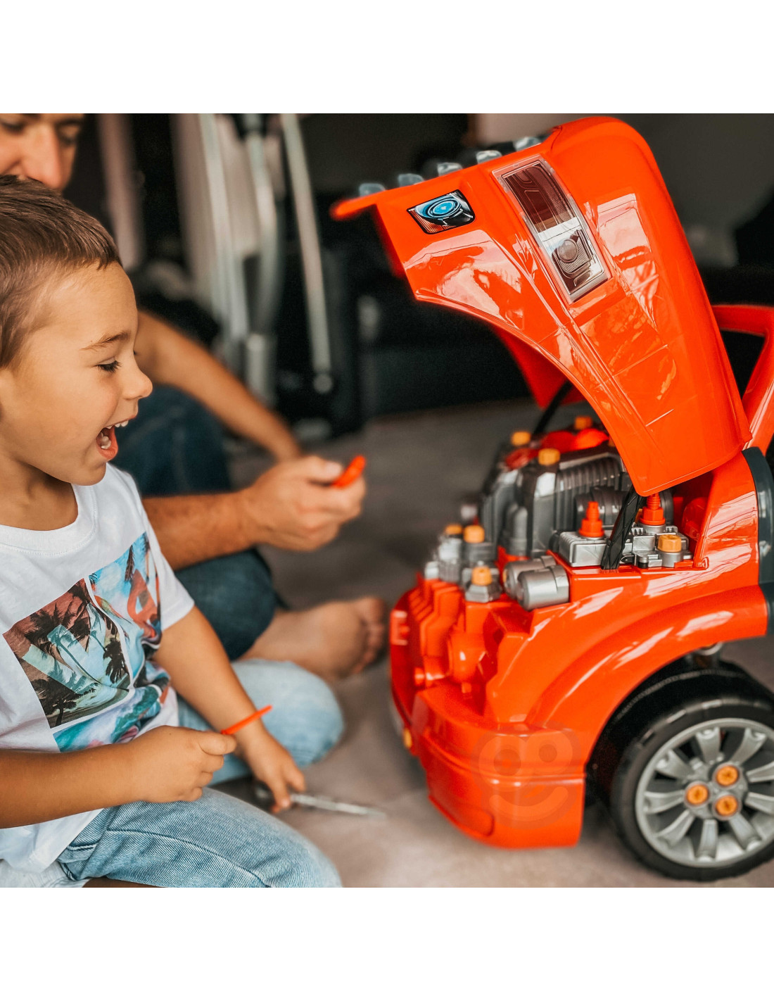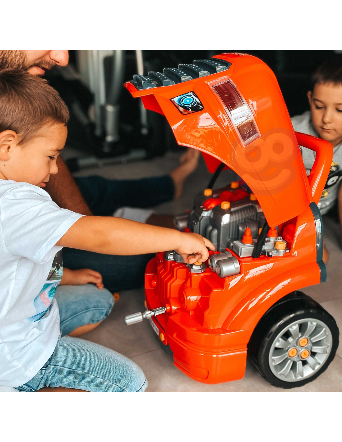 This toy imitates the front of a WOOPIE truck with a lifting hood, steering wheel, and dashboard. Open the storage compartment under the steering wheel to reveal a wealth of tools, knobs, and screws. The young mechanic can perform numerous repairs and maintenance on their vehicle (e.g., wheels, fenders, engine, spark plugs, and radiator grille). The toy is equipped with a sound module (engine sounds and a horn) and a light module (headlights). Additionally, the set includes a remote control to control the modules. The wheels can be removed using the included jack. This is undoubtedly a one-of-a-kind set, offering countless play possibilities.