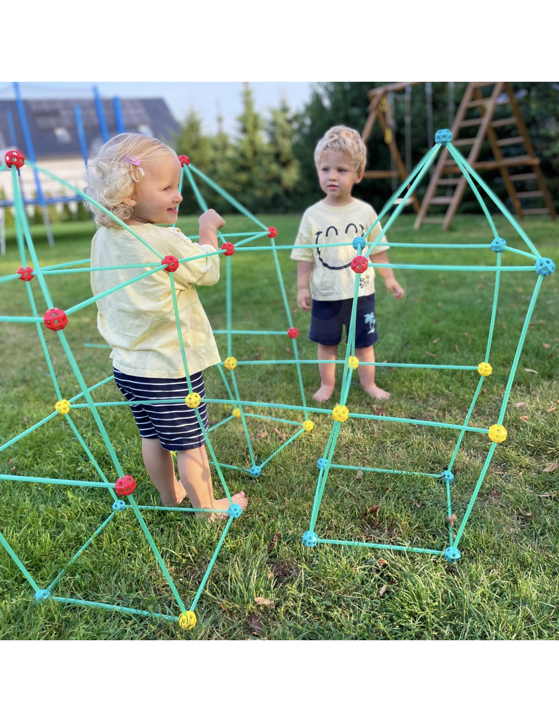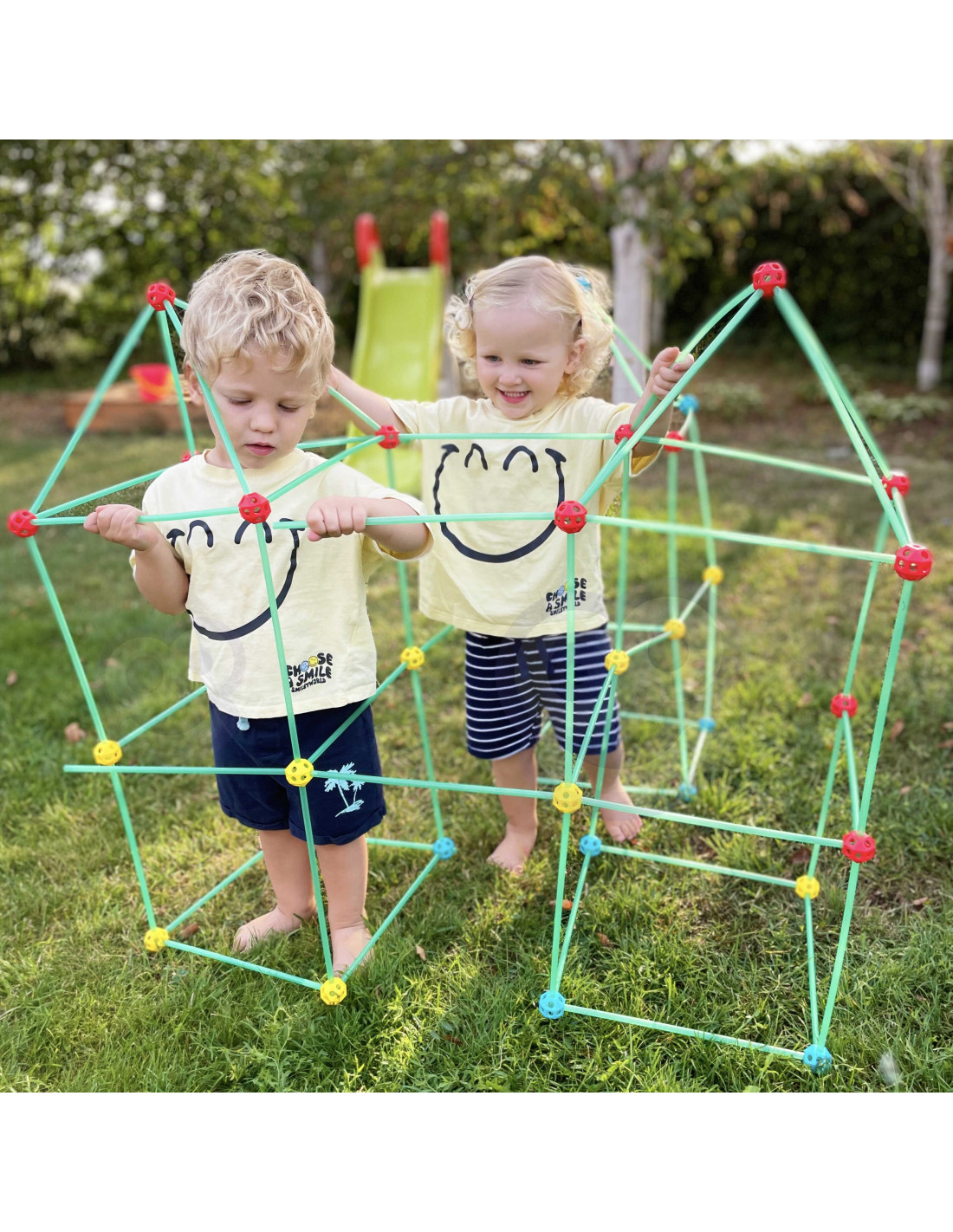 The WOOPIE Construction Set will awaken the great builder in your child! The set contains 128 pieces, including tubes, connectors, and fabric for covering the structure. The pieces can be connected to form a three-dimensional structure , like a tent, covered with fabric. The set allows for creative play both indoors and outdoors .